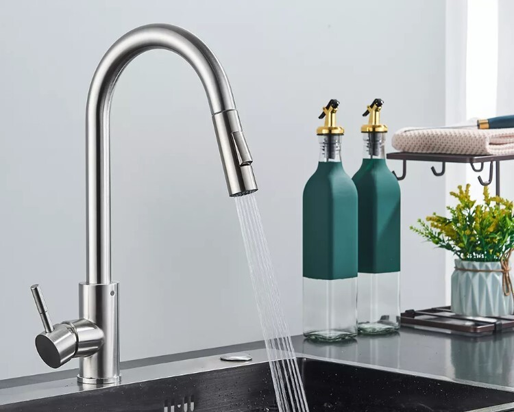 Christmas SALE - Kitchen Faucet with Sprayer (Finish: Brushed Nickel) Beautiful Minimalist Design for Modern Kitchen - Pull Out Faucet Head - One-click Button System for Sprayer-to-Stream options - Single Handle - 360° Rotation