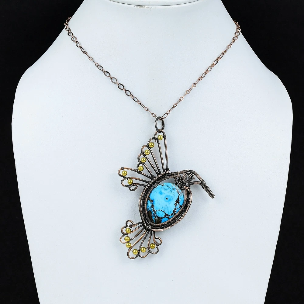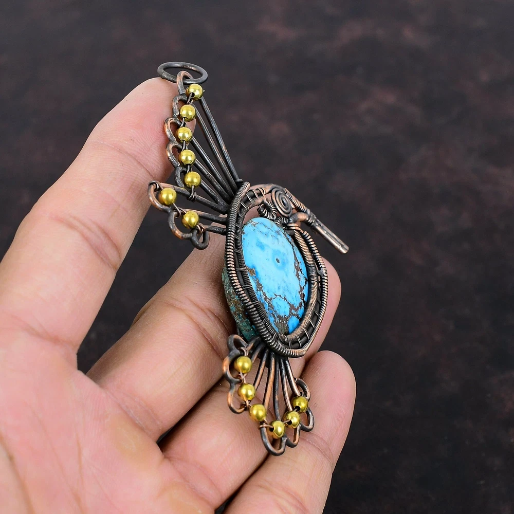 Note : Due to the natural formation of this gemstone. Slight variation in design and color are to be expected. Welcome to Silver Creation Handmade Pendant, Wire Wrapped Pendant, Wire Wrapped Jewelry, Copper Pendant, Copper Wire Pendant, Wrapped Jewelry, Wire Wrap Pendant, Wire Wrap Jewelry SKU : VFWP-3358 Gemstone : Tibetan Turquoise Stone Shape : Oval Metal Purity : Unknown Copper Length : 98 Millimetres Width : 69 Millimetres Copper has been used for jewelry making for thousands of years, dating back to ancient civilizations such as the Egyptians, Romans, and Aztecs. Copper was valued for its beauty, versatility, and durability, and was often used to make everything from jewelry and coins to cookware and tools. In addition to its historical significance, copper jewelry also offers several benefits. Copper is a natural conductor of heat and electricity, which makes it ideal for energy healing and therapeutic purposes. Wearing copper jewelry is believed to have various health benefits, such as improving circulation, reducing inflammation, and boosting the immune system. Some people also believe that copper jewelry has the ability to balance energy and improve mood. For Mother's Day Gift For Father's Day Gift For Promise For Valentine' Day For Halloween Party For Christmas Day Gift For New Year Party For Mom For Her If you can't find the information you need or need some advice for your design? Feel free to contact us. We are fast to reply :) All our work is made by hand with Love and Care in our workshop Thank you so much for visiting and hope you enjoy shopping with us Silvercreations is committed to delivering the best quality sterling silver jewelry to customers. As a handmade jewelry manufacturer, we offer an extensive selection of copper gemstone jewelry that showcases the brilliance of our craftsmanship. We are an experienced handmade jewelry supplier with expertise in embellishing gemstones to suit every style. We offer you the liberty to create your jewelry ensemble with sparkling, earthy, and pure gemstones. Our Talented artisans masterfully handcraft each piece of jewelry you see here. Our pieces are made with genuine gemstones.