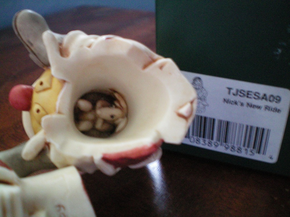 Please Note : Some states, such as WA, IA and MN have passed laws requiring eBay to collect sales taxes on all internet purchases. Other states are considering similar actions. The buyer is responsible to pay those additional fees, if required. If you are interested in collecting Harmony Kingdom, Adam Binder Editions or Fragile World pieces, please select me as one of your favorite sellers on ebay, or contact me about a piece you are looking for, and I will be happy to list it, if I have it. I have a large selection of pieces in my ebay store, but due to the expense of listing them all at one time, I will be listing only a few auctions each week. I will try and list a variety of pieces each week and hopefully you will find items of interest to you. This Harmony Kingdom box figurine named "Nick's New Ride" was carved by Peter Calvesbert in 2009. It was hand painted/finished by local craftsmen in the Cotswold area of England. This year was an especially rough one for everyone, including Santa! He had to replace his reindeer with a cheaper mode of transport – a Hoppity Hop, or as it is known in the UK, a Space Hopper. Look for Peter’s signature mouse, and you’ll know why he isn’t pleased with the change. A fed up reindeer with his UB40, an unemployment card in the UK, is hiding inside. Inscribed on the lid are “Mr. Hoppy” and “Ivan Dobsky MD”, characters from an animation series called Monkey Dust which Peter found darkly brilliant. Notice Santa’s feet. “A.C.” stands for Aquilino Cosani, credited with the bouncing rubber toy. “Pon Pon” was the name he gave to it. And look closely at Santa’s presents. One is labeled “LY” for Lisa Yashon, HK co-founder. The other is labeled “PC” for our favorite master carver. A further inscription, “EL”, still eludes Peter. USPS Ground Advantage insured shipping in the US. The piece is "new in box". Thanks for looking!