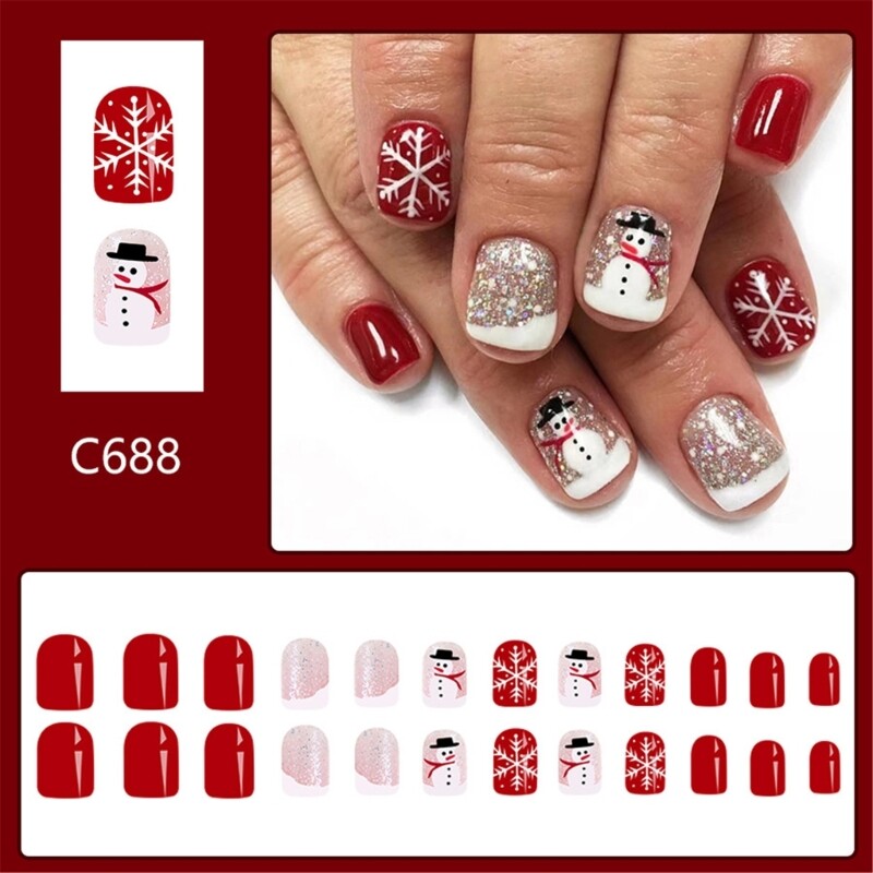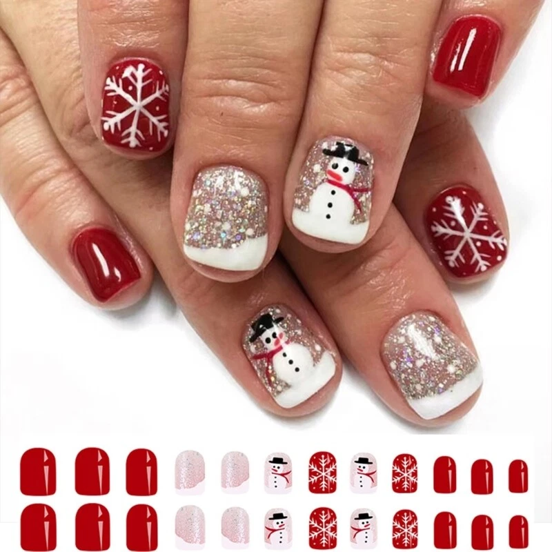 Christmas Short Press on Nails with Snowman Glitter Design Festive Manicure 24Pcs