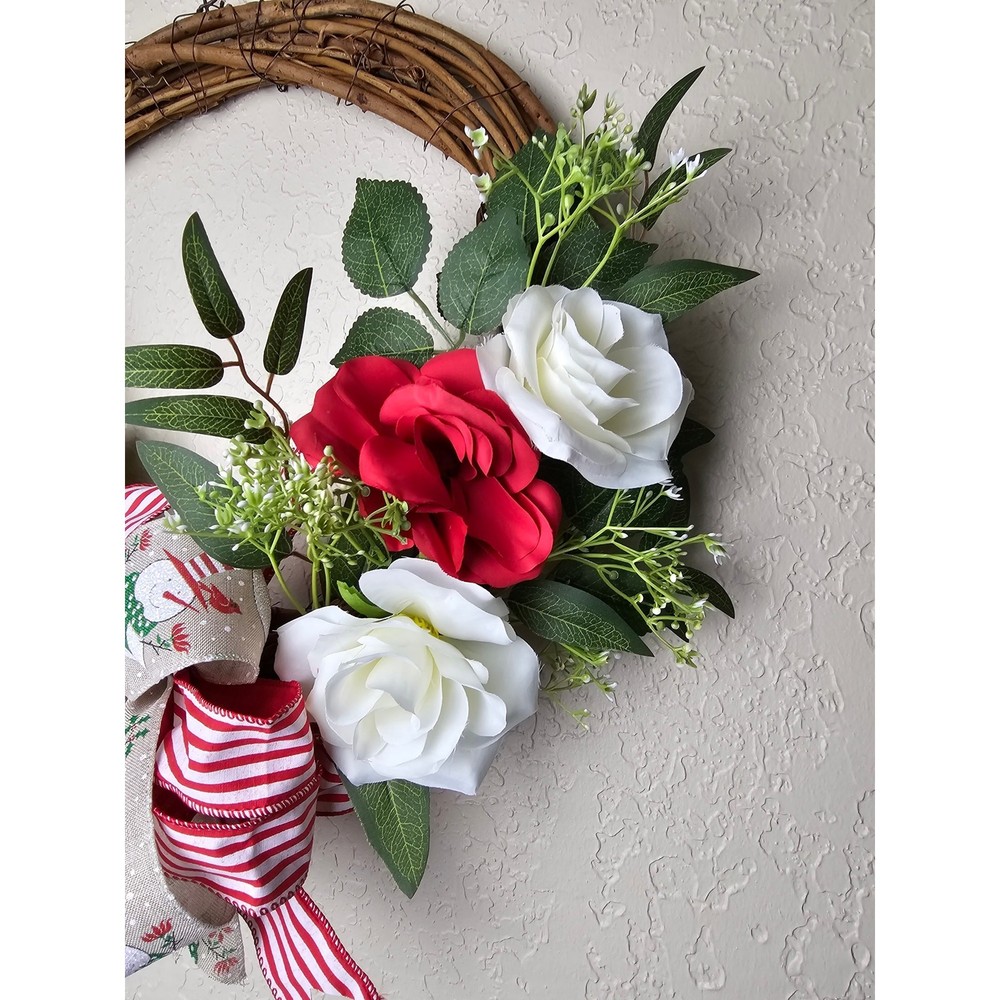 Christmas Snowman Wreath, Snowman Wreath, Winter Wreath, Farmhouse, Grapevine Christmas Wreath, Christmas Wreath, Snowman Bow Wreath, Wreath This beautiful handmade Wreath would be perfect on a door, front door, mantel, mailbox, or anywhere you would like to add seasonal decor! -This wreath is made with a grapevine wreath, 2 different types of wired ribbon, a bell, faux red and white roses, and greenery. -The measurements are approximately 22” wide and the total length is about 19” long. -All wreaths are handmade. Due to the movement during shipping, the ribbons may need to be re-shaped or fluffed to reach your desired look. Thank you!