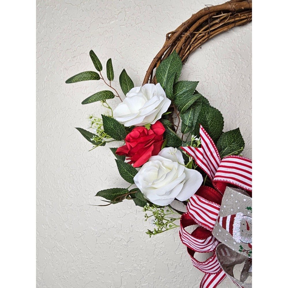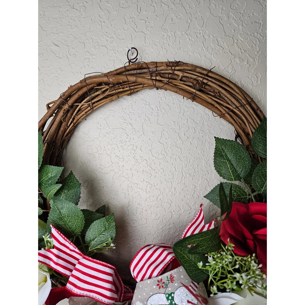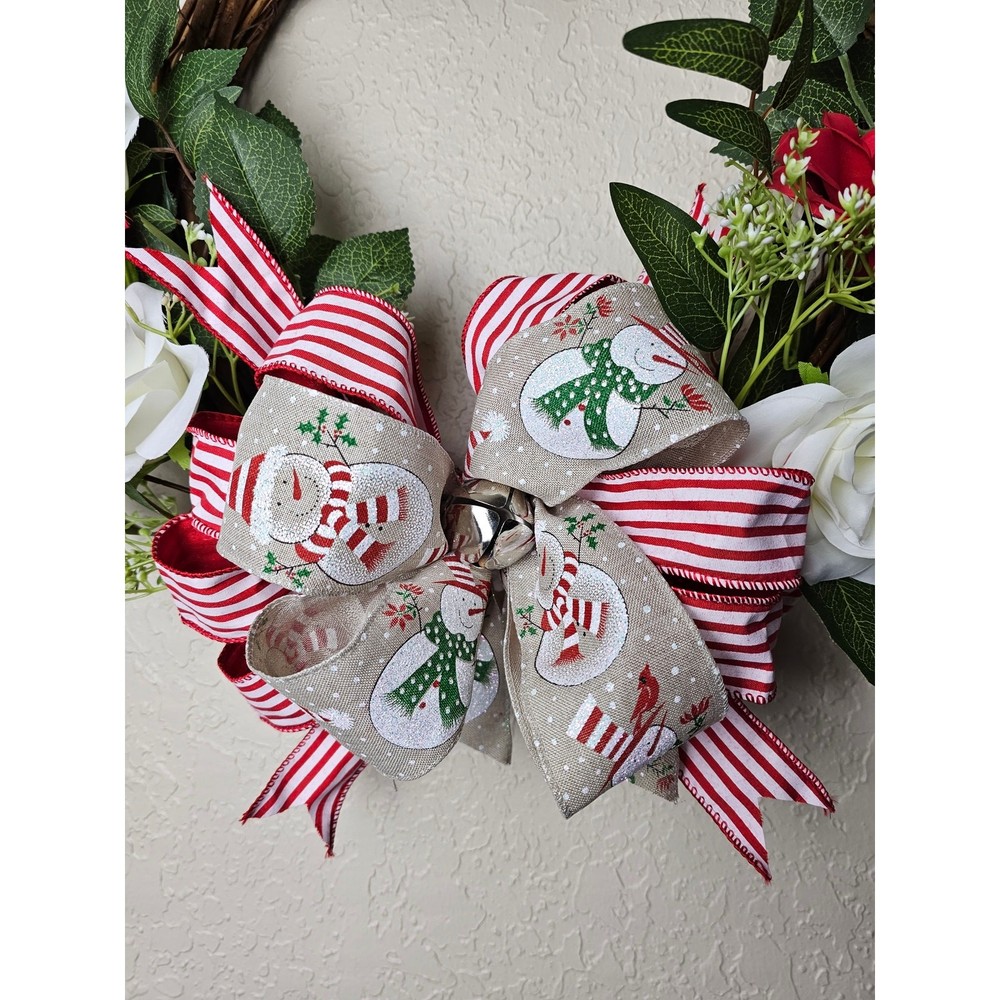Christmas Snowman Wreath, Snowman Wreath, Winter Wreath, Farmhouse, Grapevine Christmas Wreath, Christmas Wreath, Snowman Bow Wreath, Wreath This beautiful handmade Wreath would be perfect on a door, front door, mantel, mailbox, or anywhere you would like to add seasonal decor! -This wreath is made with a grapevine wreath, 2 different types of wired ribbon, a bell, faux red and white roses, and greenery. -The measurements are approximately 22” wide and the total length is about 19” long. -All wreaths are handmade. Due to the movement during shipping, the ribbons may need to be re-shaped or fluffed to reach your desired look. Thank you!