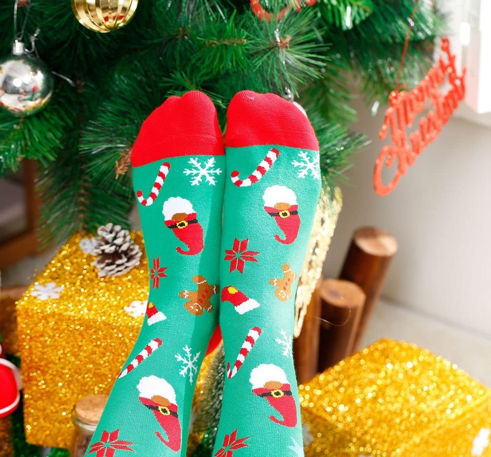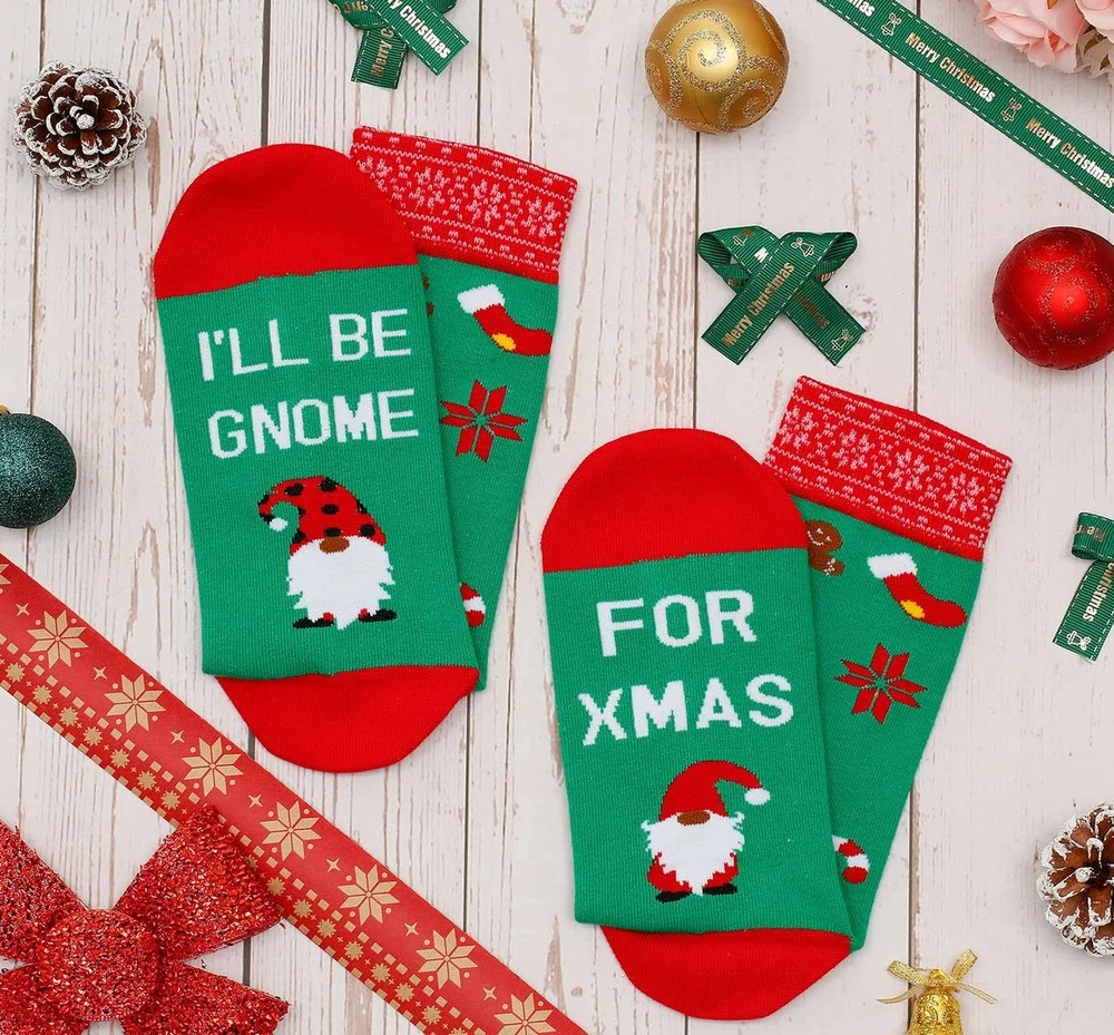 Funny Christmas Socks for Men & Women - Novelty Xmas Gifts - Cool Stocking Stuff Description: CUTE DESIGN: These hilarious christmas socks will go with any x-mas costume. The design features festive gnomes on the bottoms, you can find a fun message "I'LL BE GNOME, FOR XMAS" ONE SIZE FITS MOST: These crew length socks fit most women US size 7 and up and most men US size 6-13 feet AWESOME CHRISTMAS GIFT: These adorable socks are sure to delight her at Christmas. They are the perfect gift for mom, dad, sister and friends for Christmas EXCELLENT QUALITY: These ultra-soft socks feature professional embroidery, tight-knit stitching, comfortable yarn, and a high thread count for lasting durability and no fading VIBRANT EMBROIDERY: These crazy crew socks are embroidered with colorful patterns, and the text and graphic are sewn directly onto the socks to ensure that they won't come off like iron on transfers