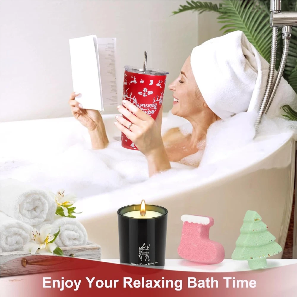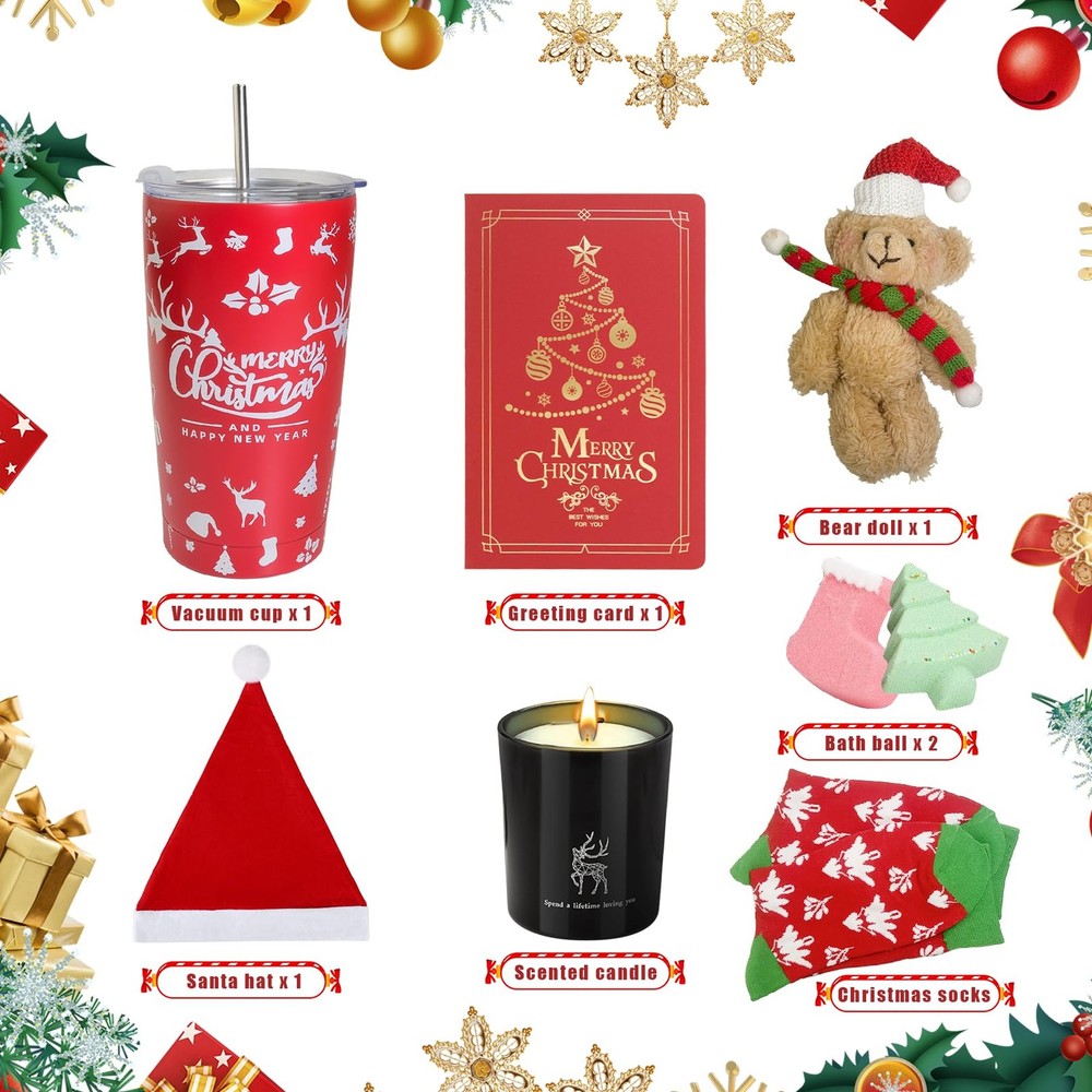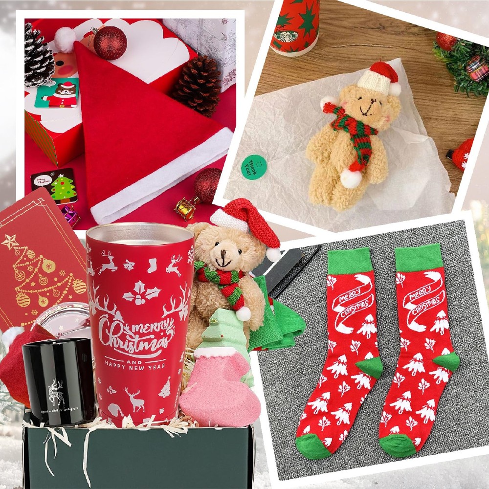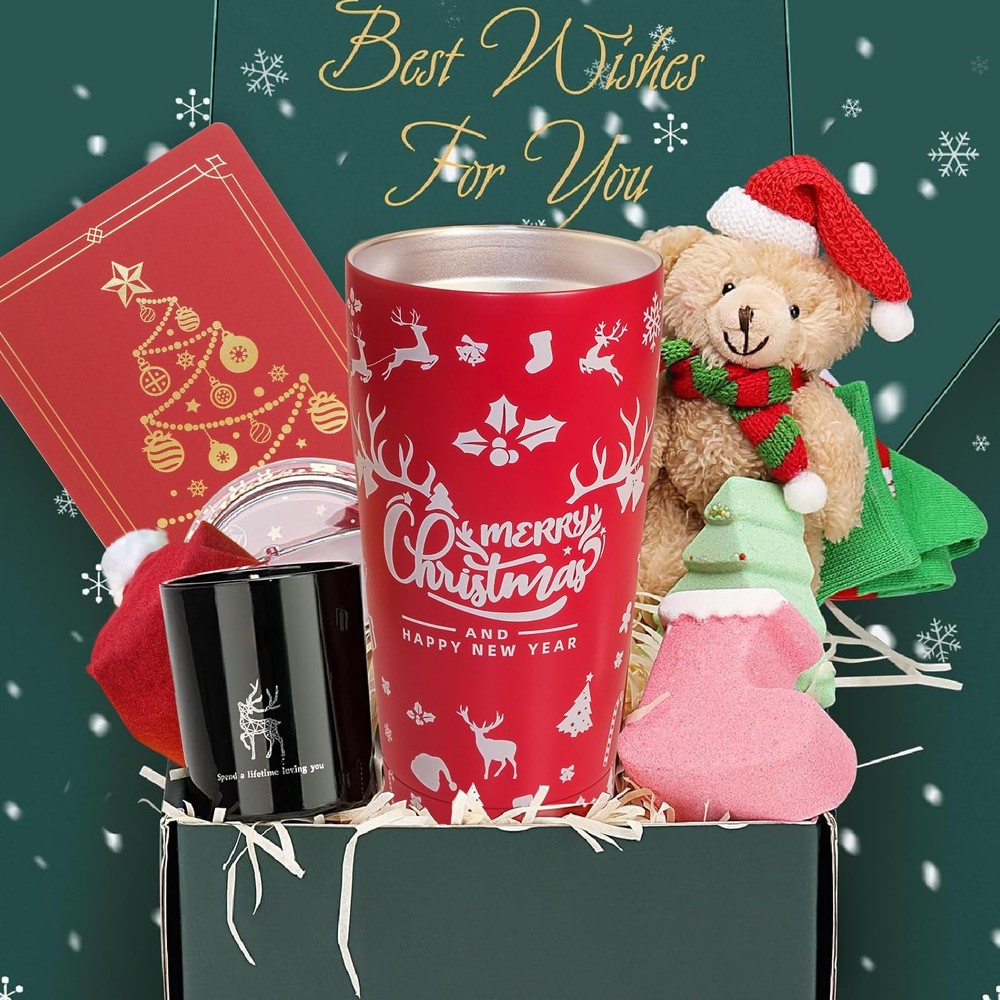 Christmas Gifts Basket for Women - Christmas Spa Gift Basket for Women, Mom, Wife, Girlfriend, Sister, Her - Xmas Tumbler Stocking Stuffers for Women Who Have Everything 【8 PCS Unique Christmas Gift Basket for Women】The gift basket contains: 1 x 20 oz merry christmas insulated tumbler(with 1 bended meatal straw, 1 straw brush), 1 x cute Beer plush toy, 1 x christmas sock,1 x christmas santa hat, 1 x christmas scented candle, 1 x christmas tree bath bomb, 1 x christmas stocking bath bomb, 1 x christmas greeting card. Nice package which can be sent as a gift directly. 【IDEAL CHRISTMAS GIFT】If you are looking for a meaningful Christmas gift for your families, or your loved ones at the upcoming events, lets choose this gift set. It would be a remarkable present for them on Christmas, New Years, Birthday and so on. Surprise her with this carefully curated christmas gift box is sure to make that special lady feel loved and cherished 🎁 【EXQUISITE GIFT BOX PACKAGING 】Beautifully Packaged. Arrives completely assembled in a high quality, reusable gift box. Women's Christmas gift set contains 8 beautifully wrapped gifts,give her the sweetest surprise to make her feel so loved on her special day. The Christmas greeting card is included to write your blessing message freely 【20OZ CHRISTMAS TUMBLER】With the words "Merry Christmas and happy new year". Turn what is normally a bland necessity into a decorative detail this holiday season with these cute insulated travel coffee cup for Christmas. This tumbler makes a delightful gift for anyone who loves Christmas movies. With its perfect capacity, this tumbler allows you to enjoy your favorite Christmas movies without frequent refills. 【WIDELY APPLICABLE】Gifts for Women Who Have Everything. Our gift box for women is a perfect choice for those looking to treat the special women in their lives. Imagine her smiling and thinking of you every time she drinks from this tumbler, whether it's coffee, beer, wine, a mixed drink, or her favorite beverage. They are suitable for your beloved ones. 【HASSLE FREE PURCHASE】This gift box filled with luxurious goodies is sure to make her feel loved and appreciated. Every item in our christmas box is carefully selected and well wrapped to prevent damage during transportation. If the gift set you receive is damaged or imperfect, please contact us for a satisfactory solution.