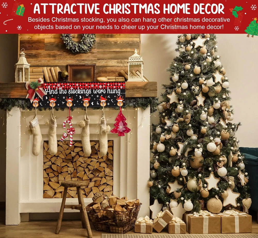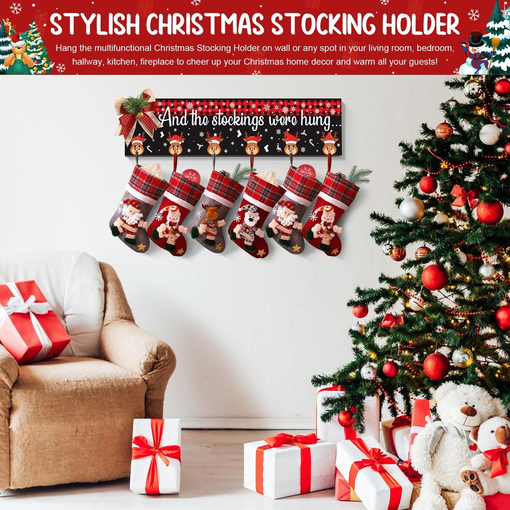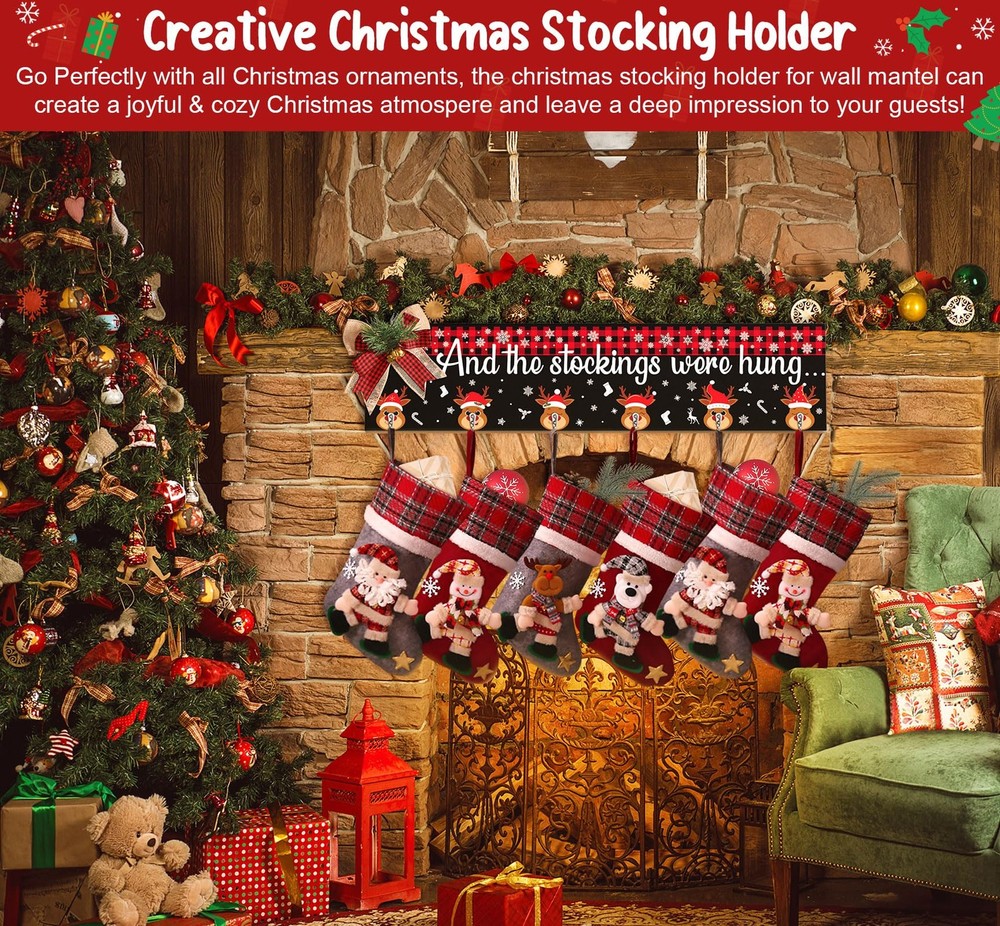 committed to create Christmas stocking holder for wall mantel fireplace that bring joy to you and your family and friends, Our stocking hanger Christmas decorations will your guest in Christmas cozy & joyful atmosphere or make any space festive and cheerful for the Christmas Thanksgiving New Year and be enjoyed for years. Be your Christmas indoor decor for home or send as a personalized Christmas gift to friends or families to wish a good luck and bring happiness and joy to the new year. The cute Christmas stocking hooks for mantel set of 6 hanger is the perfect touch of Christmas home decoration that you have been looking for. Our great-valued Christmas wall hanging stocking holder also is the perfect addition for Christmas party decor / Christmas Home Decor / Christmas Decorations Indoor / Christmas Kitchen Decor / Christmas Bedroom Decor Features: Durable Wood Material: Durable , Not Easy To Break Well-Done UV Painting: Nice-Looking & Long-Lasting & No Fading High-quality Stocking Hooks for socks: Study, Without Installation Decorative Christmas Buffalo Plaid Bow: Burst with adorable Xmas farmhouse charm, beautiful and cute Creative DIY Christmas organizer : Great Value, easily hold other Christmas ornaments and your daily objects like coats, bags, hats. Proper Size & Collapsible Stocking Hanger:Still looking for a versatile stocking hanger that show up your favorite Xmas socks as well as strengthen cozy & joyful Christmas mood? Collapsible Design for fold easily, when fully unfolded, The Christmas stocking Holder measure 24.4 x 5.9 x 0.47 inches, longer than other mantle stocking hanger to allow you hold both empty and full stockings with gifts, add strong holiday touch to your Christmas Decor!Say no to small & thin wall stocking hanger Creative Wall Stocking Hanger for Mantel: Add charm to your holiday Decor with this eye-catching Christmas Stocking Holder Wall Hanger! Featured buffalo plaid pattern at the top, various Christmas reindeer hooks design plus warm words “And The Stocking were Hung”,the Mantel Stocking Holder for Christmas is not only a stocking holder, but a dazzling addition to your Christmas Eve decor New Year Decor, easily to wrapped up in the joy of the season with , friends, family, neighbors Reliable & Durable Christmas Stocking Holder Wall Hanger: Made of sturdy wood, the collapsible wall Stocking Hangers Christmas Stocking Holder with 6 strong stocking hangers can hold up to 10 lb, long-lasting used years after years. Exquisite cutting & high definition UV print in vivid pattern, the wall stocking hooks for mantle are not fade or break. Come with adorable plaid bow has a Velcro at back, just attach it onto the wall stocking holder, getting you in joyful Christmas spirit asy Mounted & Multi-Used Christmas Stocking Hooks: Extra Large Size & 6-Hooks Design, And the Stocking Were Hung Christmas Stocking Holders for Mantel Wall hanging is delicate and functional, perfect for hang up your whole family’s stockings and wait for Santa to show up, even for other Christmas decoration & objects like Christmas gifts,garlands,clothes,bags. Equipped with saw-tooth hook on the back, the Stocking Holder can be easily hung on wall, fireplaces, mantels, entryway Christmas Home Decor Ideas & Christmas Gift: This Christmas Stocking Wall Hangers set of 6 Christmas stocking Hooks is not only ready to be a must-have for organize Christmas stockings and other Christmas ornaments, but a personalized gift to touch their hearts due to the impressive & heart warming design. The cute Christmas Elk surrounded by snowflake spread good luck and Christmas spirit, make it a warm Housewarming Holiday Christmas gifts for your family, friends, neighbors WORRY-: Each Christmas stocking Holder for wall stocking hanger has been wrapped carefully to ensure . If you have any questions about Christmas Decor mantel stocking hangers for wall hanging, just feel to tell and we will try our best to serve you. wood Christmas stocking holder for wall can bring a strong Christmas touch to your home, guests will surprise with Xmas Decor. Definitely purchase the Christmas fireplace stocking hangers with confidence Merry Everything Happy Always: Add charm to your holiday with this eye-catching Christmas stocking holder with 6 hangers for mantel. Farmhouse wall Christmas Stocking Holder fills with and delicate Christmas elements that make it perfect for hang on living room, kitchen, bedroom, mantel fireplace or any corner in your farmhouse or modern house. Perfect for Christmas Home Decorations, Christmas EVA Decorations, Christmas Party Decorations and New Year Celebration