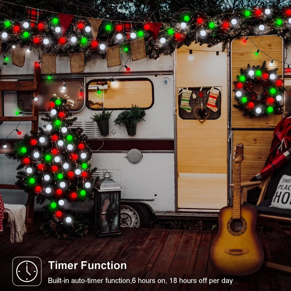 Christmas String Lights Battery Powered 16.4Ft 50LED Red Green White Globe String Lights with Timer 8 Modes Waterproof Fairy String Lights for Indoor Xmas Tree Holiday Party Outdoor Decor Sepcifications Wire material:PVC rubber LED Quantity: 50 Power Source:Battery Powered Cable Color: Green Light Color : Red Green White Size: 16.4ft Lead wire: 60CM (Approx.1.96 ft) Waterproof: IP54 8 Lighting Modes: Combination In wave Sequential Slo-glo Chasing/Flash Slow fade Twinkle/Flash Steady on Package included: 1 x Red Green White String Lights Globe String Lights: The total length of the green wire string light is 16.4ft, lead wire: 23.6 inch,two bulbs distance: 3.9 inch. Green wire design is perfet hidden inside the Christmas tree Red Green White String Lights:The fairy string lights feature 50 Globe red white green LED lights, which create a joyful festival atmosphere for Christmas Auto Timer Function:The LED string light will auto set a timer for 6 hours on and 18 hours off each day when you light up the string fairy lights,which could save energy costs and keep a long battery life Battery Power String Lights: The LED string light with battery box is portable to place anywhere you want, no need to find the socket. Powered by 3 x AA batteries(Not Included), 3V lower volt output, safe and free to touch for child and pet 8 Lighting Modes: Press the button of the battery box to choose the different mode to suit the different occasion Widely Application: Christmas color string lights is perfect for wrapping Christmas trees, wreaths, patios, hedges, fences, pillars. Good choice for increasing your holiday atmosphere for Christmas