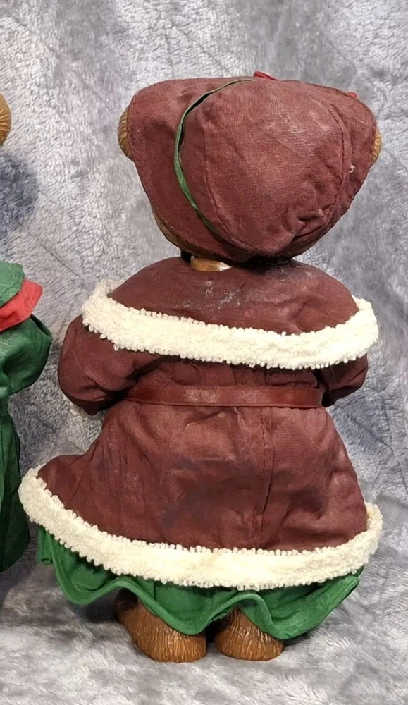Mrs Bear Figurine Girl Green Red Christmas Teddy Bear Figure Holiday Decor See photos for measurements I consider this to be in good preowned condition I think she is made of a resin/ plastic and her clothes are cloth that has been stiffened - but I can't say this for sure Please view all photos zooming in on them as they are part of the description for you to judge condition. At one time, she may have had something in her hands