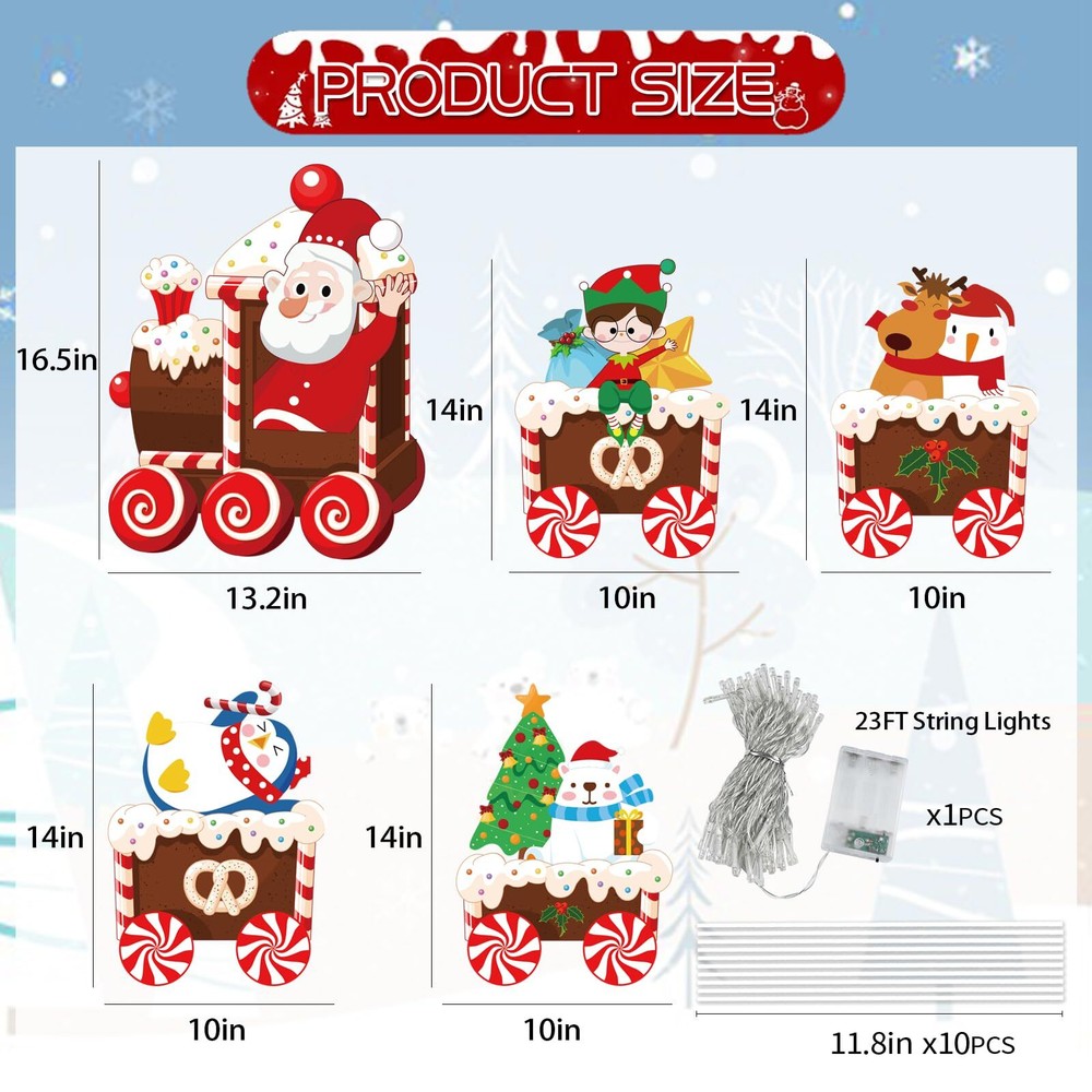 VALUABLE PACK:The Christmas train decoration has 5 carriages with a Christmas tree, Santa, elf, snowman, penguin, elk and kinds of Christmas gifts, busy from door to door giving gifts and Christmas blessings. With 23ft string of LED lights, great for your outside Christmas Eve yard decorations. PREMIUM MATERIAL:These LED yard Christmas train decorations are made of sturdy plastic, withstand waterproof and weather-resistant, durable and reusable. The fairy lights are made of soft bendable silver wire, and run on 3 AA batteries (not included). Low power and insulate heat, remain safe to the touch. EASY TO USE:Our Christmas train signs come with 10 stakes, simply put two stakes into each sign and then insert them into the lawn or courtyard, then place the LED light string on them, a great addition to your outdoor Christmas night decorations. OUTDOOR DECOR:These Christmas train yard signs with led lights are perfect for any Christmas party, especially outdoor decorations, such as lawn, yard, balcony, garden, entryway, sidewalk, parties and so on, adding so much fun for your Christmas and surprising everyone passing by. Shop with Confidence: We strive to offer top-notch products and unparalleled service. Should you have any issues or questions, please reach out to us
