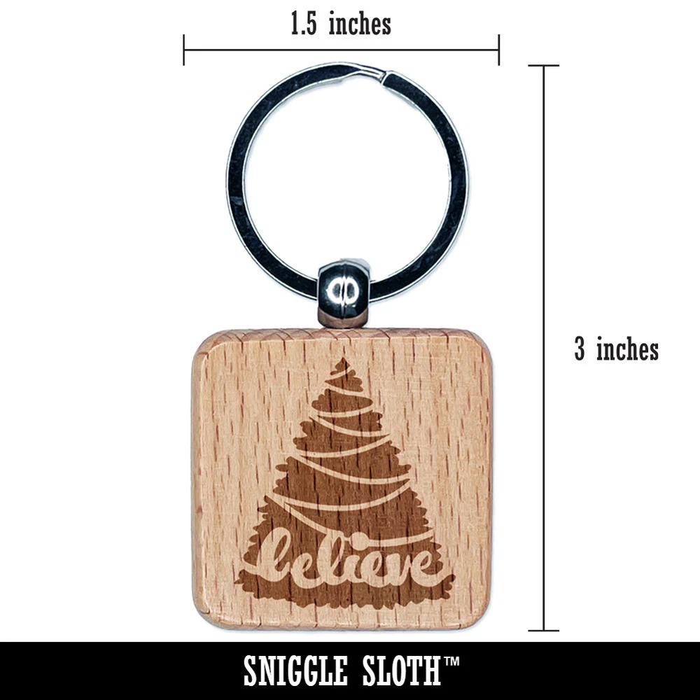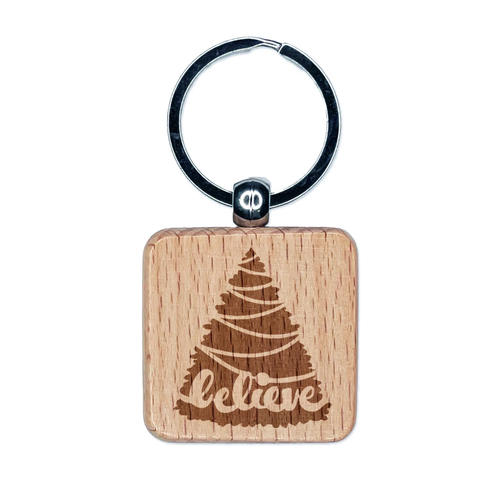 Christmas Tree Believe Engraved Wood Square Keychain Tag Charm