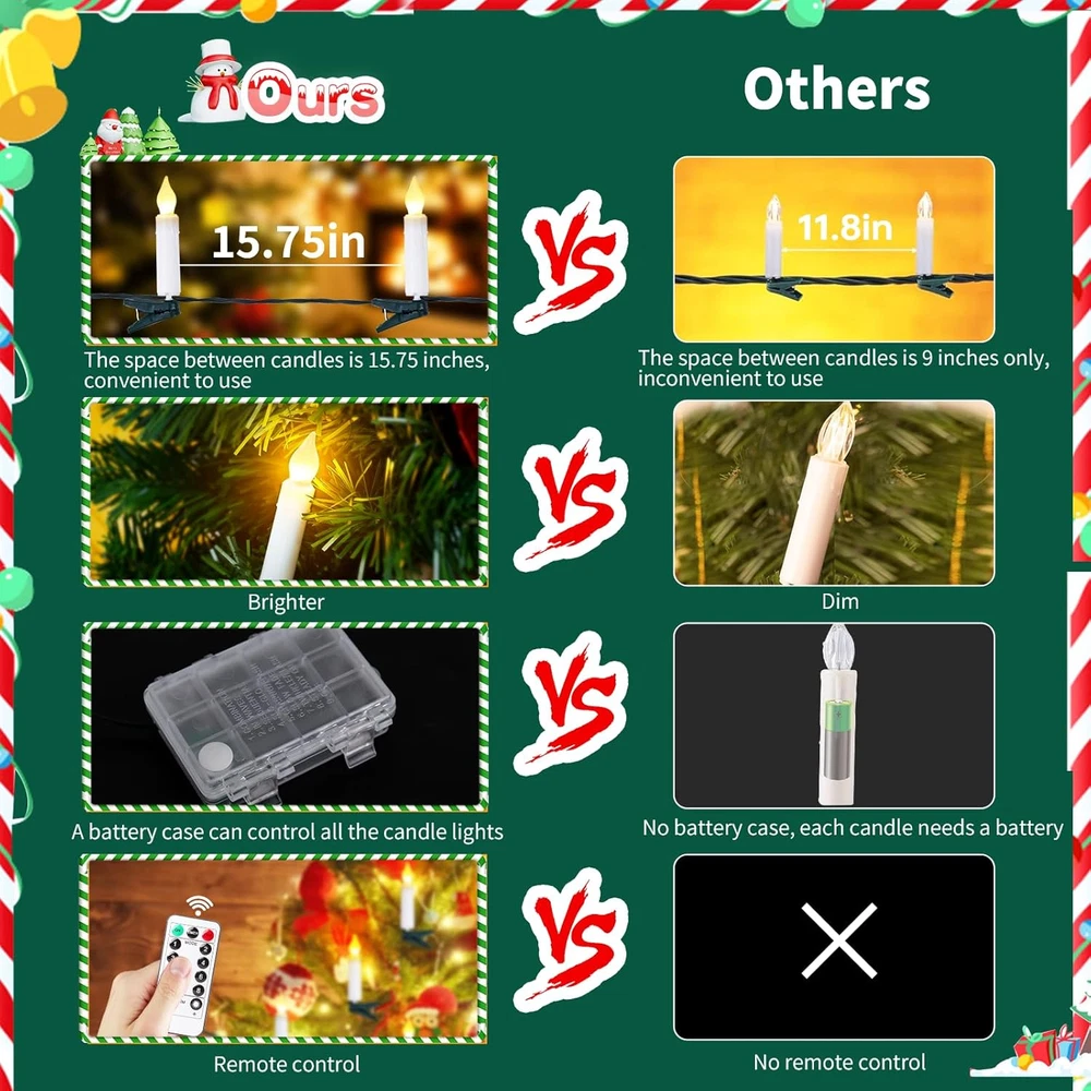 Upgraded Candle Lights: This christmas flameless candle light optimizes and upgrades the material ,design and mode in order to improve the safety,practicality and ornamental qualities of this candle light.The warm orange light brings you and your family a warm and comfortable environment 8 Mode Temperature Atmosphere Light : You can adjust to the perfect color temperature according to specific decorative needs. This christmas candle string light with 8 modes, equipped with a multi-function remote control that can adjust different brightness & has a timing function. Multi Functional Clip for Easy Fixation: Multi-functional clips are included for each of the 20PCS candle lights in candle string light set, making it easy to secure to the Christmas tree for decoration. LED Candles for christmas tree are batteries operated and come with a remote control for convenient ON/OFF switching and mode changes Ultra-long Spacing: We specially customized 15.75 inches on spacing for this flameless candle light string, which is much longer than others, 20pcs christmas tree candles lights with extra long spacing can be more flexible to DIY, 1pack is enough to decorate your Christmas tree Battery Operated:Flameless Christmas white LED candles are made of plastic material, sturdy, long lasting, and safe to use for kids, pets or elders, spending the holiday season in safety; Additionally, all the 20 candles only need 3xAA battery, which is not included in the package Product Description Each candle lamp has a separate clip Each candle lamp has a separate clip which is used to ensure that any candle lamp can be independently placed in the desired place. Realistic design The realistic design is exactly the same as the candle, and the warm orange light creates a warm environment Waterproof Waterproof design, even in the outdoor rainy day can be used normally Adjustable brightness The brightness can be adjusted as required 15.75 inch spacing The distance between any two candle lamps is 15.75 inches, which is very convenient to use 8 Modes to choose Our candle string has 8 lighting modes to choose from. 5 different brightness levels are available The included remote control can be easily controlled from a distance,It also has a timing function. 20pcs candle light strings, easily light up your Christmas tree and room, orange light gives you a warm feeling The space between any two candle lamps is 15.75 inches, and the total length of the 20 candle lamps is 315 inches. Easily wrap around your Christmas tree or wrap around an outdoor light stand. Easy and quick installation You can use it anywhere you want, such as Christmas trees, stair railings, fireplaces, outdoor light stands and so on.