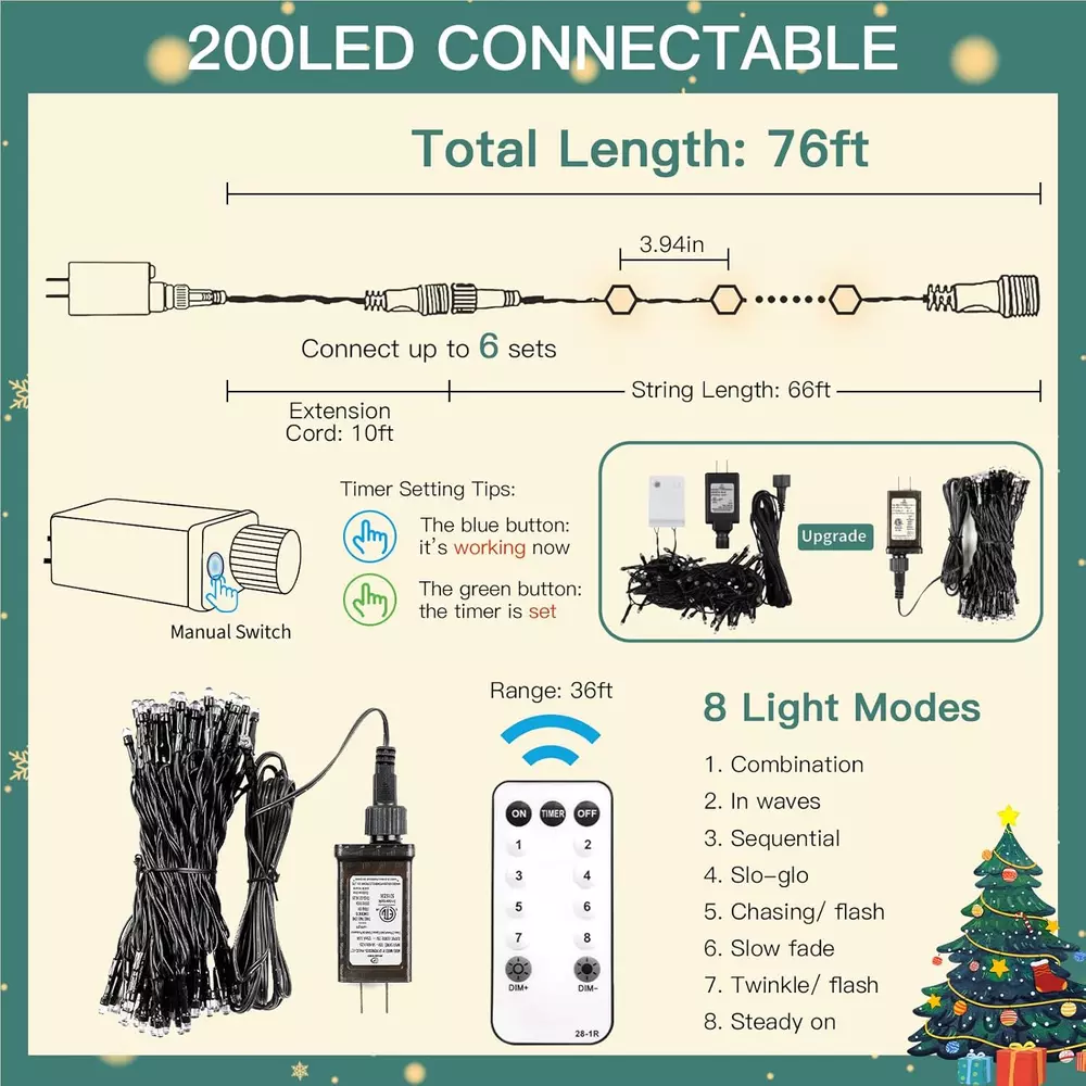 Indoor/Outdoor Usage: Outdoor, Indoor Number of Items: 1 Size: 200 LED-Connectable Item model number: SDWW-200DM Special Feature: Remote Controlled, Timer, Waterproof Color: Warm White Theme: Christmas Material: Plastic, Rubber Occasion: Christmas Control Method: Remote Brand: Does not apply Item Weight: 1.23 pounds Light Color: Warm White UPC: 7445017099044 Package Dimensions: 6.34 x 3.7 x 3.66 inches gtin13: 7445017099044 Type: Does not apply Power Source: Corded Electric Water Resistance Level: Waterproof Number of Light Sources: 200 Batteries required: No Seasons: All Seasons Light Source Type: LED Wattage: 6 watts Voltage: 29 Volts Controller Type: Remote Control Style: Modern