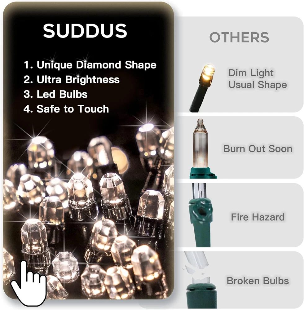 Store New Arrivals Add to Favorite View Feedback Contact Fast deliveries to the customer's home Quality customer service John Make the customers happy! Christmas Tree Lights Indoor, 66Ft 200Led Connectable Christmas String Lights Outdoor with 8 Modes, Twinkle Lights for Christmas Tree, Backyard, Patio, Porch, House Decoration, Warm White Description [DIAMOND SHAPE CHRISTMAS LIGHTS] The SUDDUS upgraded version of the 200 LED string lights features precision cutting technology and diamond shapes. The xmas lights emit super bright and soft light from any angle. Besides, it features with black wire, which makes this led christmas lights can be well hidden in the green christmas trees and bushes. Bright string lights make for eye-catching accents on the yard. [END TO END CONNECTABLE] The holiday lights can connect to 6 set of lights, total 1200 LEDs. And all lights can be controlled by 1 remote. Therefore, if you want to decorate a spectacular christmas decoration outdoor, this connectable white christmas lights will be your first choice. It can be used for yard fences, large Christmas trees, terraces, bushes, and porches. Also can be decorated with door frames, stairs, fireplace, etc. [CHRISTMAS LIGHTS WITH REMOTE] SUDDUS indoor Christmas lights have 8 modes, including combination, wave, sequence, slo-go, chase/flash, slow decay, twinkle/flash and steady on. You can control the light modes, brightness, and on/off within 110 feet/33.6 meters. By the way, the built-in memory chip can save the last mode setting (only it turned off by remote), which means it will remain the last mode next time when turning on. [CHRISTMAS LIGHTS OUTDOOR WATERPROOF] The Christmas light string, connectors and plugs are all IP44 waterproof and can withstand the cold temperatures, rain, and snow. The twinkle christmas lights will Illuminate the outside of your home during the holiday season, no worry of the weathers. The mini Christmas lights are 29V low voltage, UL-listed plugs ensure the safety, perfect for outdoor Christmas decorations. [OUTDOOR CHRISTMAS DECORATIONS] Using the white christmas lights to turn your home into mini winter wonderlands. From glittering ornaments to twinkling lights, Line up along your fence, wrap around the trees, or hang them on your porch for a bright, twinkling Christmas display, to make a welcoming home during holiday season, your guests will feeling welcomed on arrivals. Product Description Endless Decorative Possibilities, One Plug Away. Brighten more, spend less! Unlock savings with our exclusive multi-string light bundles. Elevate your ambiance effortlessly by mixing and matching multiple sets. More strings mean more brilliance – embrace the glow, and save as you shine! SUDDUS TWINKLE LIGHTS FOR CHRISTMAS TREE The video showcases the product in use. The video guides you through product setup. The video compares multiple products. The video shows the product being unpacked. Christmas lights add a warm and inviting ambiance, turning ordinary surroundings into a magical, holiday wonderland. MERRY & BRIGHT Stringing Lights, Making Memories. Multi-String Extravaganza: Elevate Your Space with Bulk Light Deals! Transform Your Space with Multi-String Brilliance! By selecting a flashing mode, you can set the mood for your Christmas tree decorations, whether you want a serene, nostalgic, playful, or energetic ambiance. Furthermore, they can be used strategically to enhance particular themes or atmospheres during the holiday season. Waterproof outdoor Christmas tree lights enable your outdoor display to be enjoyed by everyone, regardless of the weather. People passing by or visiting your home can relish the festive atmosphere you've created without worrying about the lights being damaged or posing a safety risk. Amplify Your Ambiance with Multi-Pack Specials! Our connectable twinkle Christmas lights with timers automate the lighting schedule, making it hassle-free to enjoy your festive display at predetermined times without manual effort. Connectable Christmas lights allow you to string together multiple sets, covering a larger area with a single power source, making setup more efficient. SUDDUS CHRISTMAS LIGHTS Add to Cart Add to Cart Add to Cart Add to Cart Add to Cart Add to Cart Customer Reviews 4.4 out of 5 stars 585 4.5 out of 5 stars 703 4.4 out of 5 stars 6,523 4.3 out of 5 stars 685 4.3 out of 5 stars 3,164 4.5 out of 5 stars 460 4.4 out of 5 stars 6,523 Price $29.99 $ 29 . 99 $24.99 $ 24 . 99 $14.99 $ 14 . 99 $18.99 $ 18 . 99 $15.18 $ 15 . 18 $29.99 $ 29 . 99 $14.99 $ 14 . 99 Power Source Plug in Plug in Battery Battery USB Plug in Battery Color Warm White Warm White Warm White Warm White Warm White Multicolor Multicolor LED Quantity 200 LED 100 LED 200 LED 100 LED 200 LED 200 LED 200 LED Connectable YES YES NO NO NO YES NO Special Features Diamond-Shape Led Bulbs Clear Wired Strand Flexible Copper Wire Globe Shape Bulb Vertical Waterfall Lights Unique Light Color Flexible Copper Wire Light Source Type LED Item model number SDWW-200DM Style Modern Number of Items 1 Power Source Corded Electric Number of Light Sources 200 Control Method Remote Theme Christmas Controller Type Remote Control Batteries required No Material Plastic, Rubber Seasons All Seasons Package Dimensions 6.34 x 3.7 x 3.66 inches Indoor/Outdoor Usage Outdoor, Indoor Light Color Warm White Water Resistance Level Waterproof Item Weight 1.23 pounds Occasion Christmas Special Feature Remote Controlled, Timer, Waterproof Color Warm White Wattage 6 watts Voltage 29 Volts Size 200 LED-Connectable ABOUT US We offer the best prices around on high quality products. Our E-store includes media such as books, movies, music and games while offering electronics, toys, sporting apparel, clothing, tools, general home, garden items and more. SHIPPING We are always working hard to ensure your package arrives as soon as possible. Please understand that some factors like weather, high postal traffic, and the performance of shippin