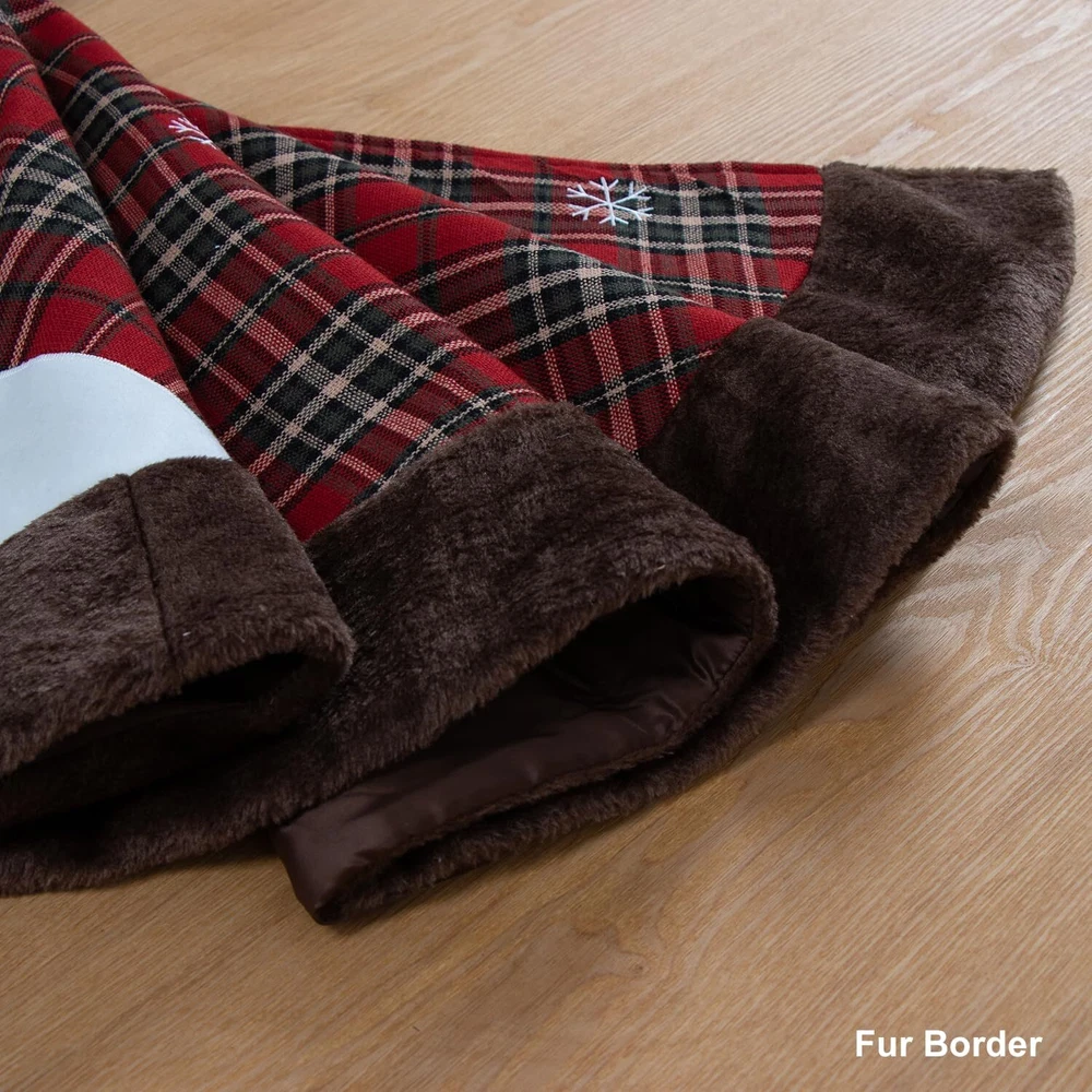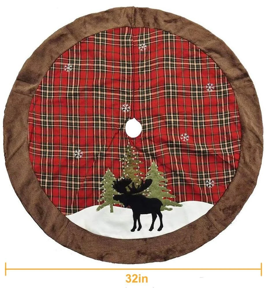 Christmas Tree Skirt, 32 Inches Plaid Tree Skirt with Reindeer, Borwn Faux Fu...