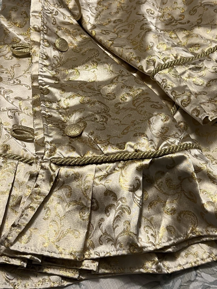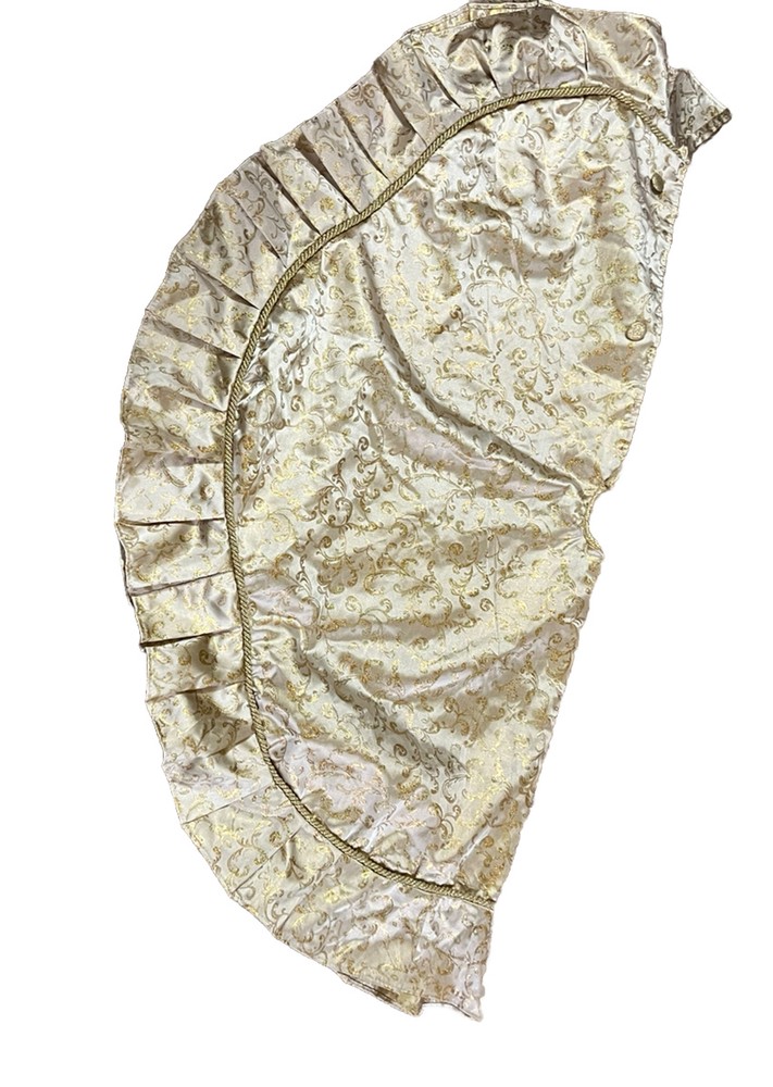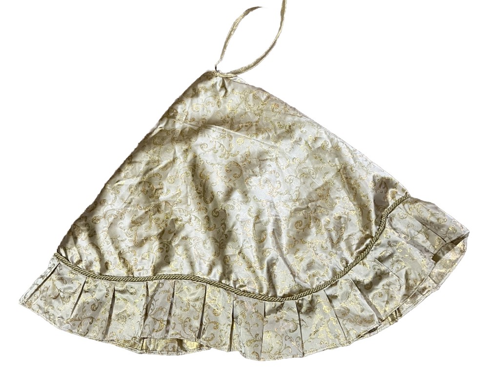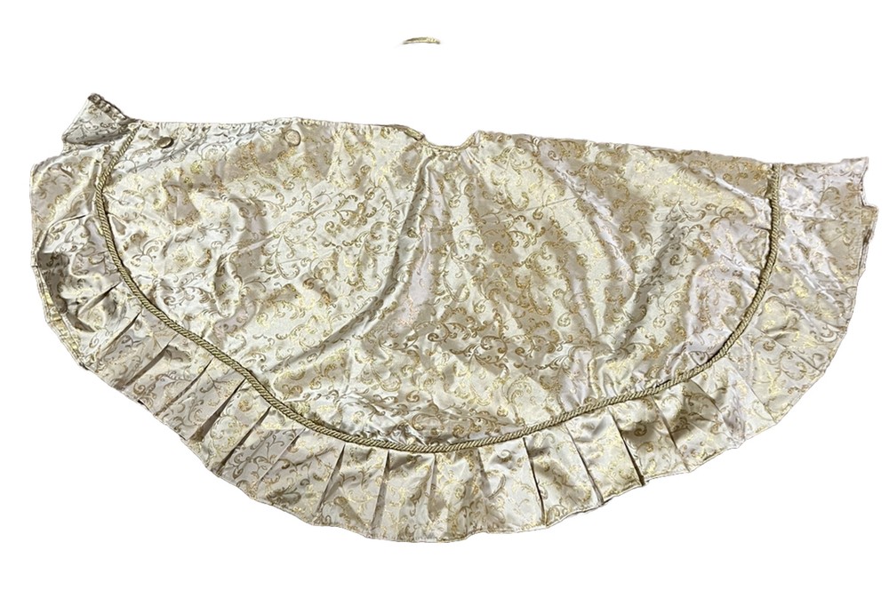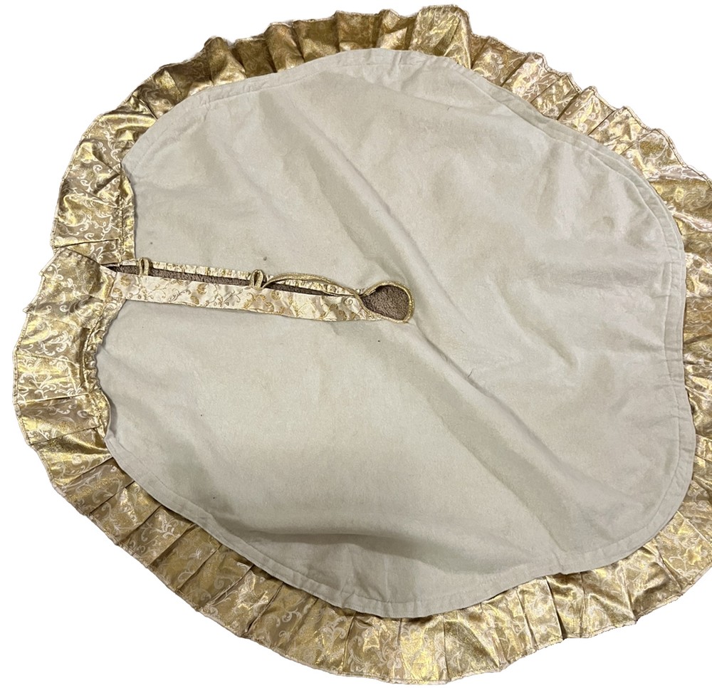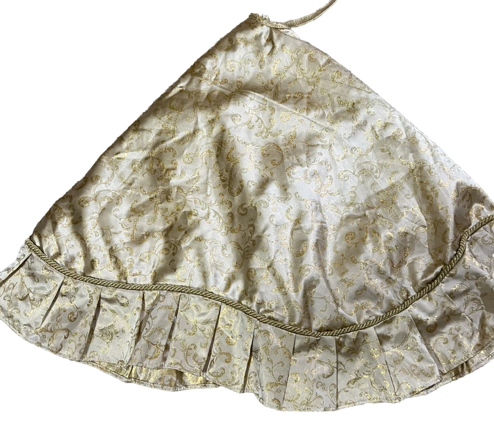 Add a touch of elegance to your Christmas tree with this beautiful vintage gold tree skirt. Measuring 22 inches from center, 42” across when folded in half, medium-sized skirt is made of metallic gold polyester glitter material. It features a pleated border, gold cord trim, and satin covered buttons, adding a sophisticated touch to your holiday decor. Preowned, not used. The skirt is perfect for any Christmas occasion and comes in an open box, This tree skirt is a must-have for anyone looking to add a touch of glamour to their tree. Returns accepted within 30 days; buyer pays return shipping