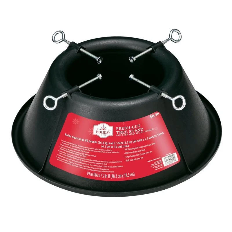 Your Christmas tree will stand tall and proud with the Holiday Time Fresh-Cut Christmas Tree Stand. This tree stand can accommodate natural trees up to 80 pounds (36. 3 kilograms) in weight and 7. 5 feet (2. 3 meters) in height, with a trunk size between 2. 5 inches to 5 inches (6. 4 centimeters to 13 centimeters). Setup is easy and quick with the help of the stand’s four self-threading bolts that have eye hook pins to hold the tree firmly in place. This Christmas tree stand is perfect for any natural tree as it comes with a large one-gallon (3. 8 liters) water reservoir to keep the tree fresh. The reservoir has a spill-resistant outer rim, so there is no danger of water spillage, and it won’t rust or scratch your floors. Constructed from sturdy and durable materials, the Holiday Time Fresh-Cut Christmas Tree Stand ensures your Christmas tree can stand securely, making sure it looks beautiful all season. Holiday Time Fresh-Cut Christmas Tree Stand up to 7. 5 ft and 5" in Diameter, Black Large 1 gallon (3. 8 L) water reservoir Spill resistant outer rim Will not rust or scratch floors Holds trees up to 80 lbs. (36. 3 kg) and 7. 5’ (2. 3 m) tall Fits tree truck from 2. 5" to 5" (6. 4 cm to 13 cm) Self-threading bolts for easy set-up Color: Green Product Dimensions: 19” DIA. x 7. 2” H Model #: GX043101900F You may also like Fast Acting Drain Cleaner 32oz Acid Clog Remover Sink Opener Septic Safe New 22.46 USD 23.64 USD Free shipping 5% off Portable Lightweight Camping Chair w/Cup Holder for Folding Lawn Picnic US 16.21 USD 17.06 USD Free shipping 5% off Cooking Wood Chunks for BBQ Smoking Grilling 549 Cubic Inch 31.91 USD 33.59 USD Free shipping 5% off Deviled Egg Keeper Container Storing Fresh Transporting W/ Lid Dishwasher Safe 10.57 USD 11.13 USD Free shipping 5% off Fiberglass Spinning Fishing Rod Hotcast 4-Ft 6-In 2-Pcs Medium-Light Power Green 11.63 USD 12.24 USD Free shipping 5% off Ceramic Round Bowl Dishwasher Safe Unique Reactive Glaze Durable Kitchenware New 9.8 USD 10.32 USD Free shipping 5% off Chewy Granola Bars Chocolate Chip Dipped Snack Value Pack, 20 Count, 1.1 Oz 10.43 USD 10.98 USD Free shipping 5% off Hose Reel Storage 100ft Hideaway Durable Resin Tangle Resistant Easy Use 46.69 USD 49.15 USD Free shipping 5% off 64 Qt. Blue Stackable Storage Box Plastic Latching Container Tote Bin Organizer 18.01 USD 18.96 USD Free shipping 5% off Stoneware Cereal Bowl Microwave Freezer Dishwasher Oven Safe Drip Design New 9.8 USD 10.32 USD Free shipping 5% off 2 lbs 4 oz Butter Powder Survival Camping Food Storage Everyday Home No. 10 Can 30.43 USD 32.03 USD Free shipping 5% off Kids Folding Table 4 Chairs Set Playroom Daycare Indoor Outdoor Activities New 58.05 USD 61.11 USD Free shipping 5% off