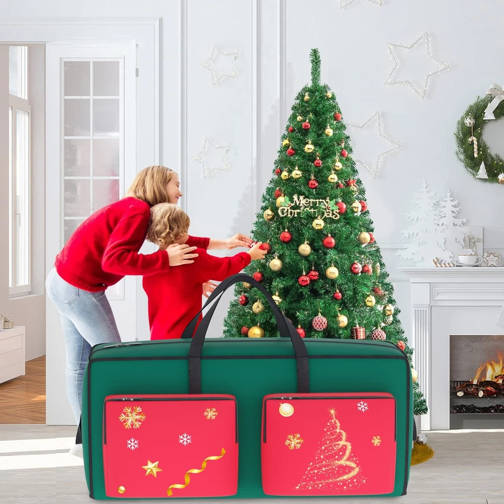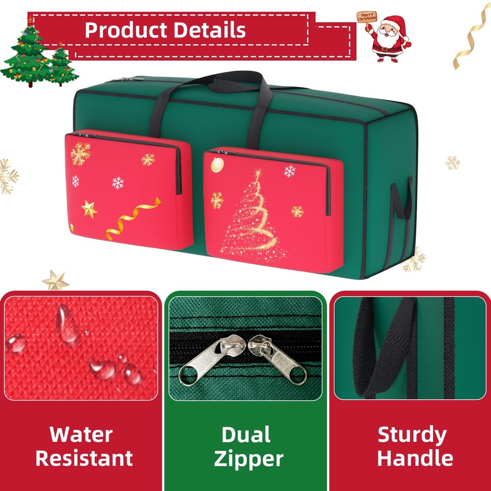 ⭐Size - Christmas Tree Storage Bags: The dimensions of Christmas tree bag is 48" L x15" W x 21" H, fit up to 7.5ft tree.(Tree should be detachable) ⭐Superior Material - Heavy Duty Christmas Tree Bag: Christmas tree storage bag is made of extremely durable 600D Oxford canvas material, waterproof, tear resistant and reusable, which effective protection against moisture and dust. ⭐Creative Design - Xmas Tree Bag: Christmas tree storage box with double zipper design, easy to place, no assembly required. The storage bag also has two pouches to keep the tree and Christmas decorations separate. ⭐Versatile Usage - Christmas Tree Ornaments Container: Beyond holding removable Christmas trees, Christmas tree bags also perfect for storing wreaths, lights, toy, Christmas seasonal ornament and other festive holiday party decorations. ⭐Space-saving - Artificial Christmas Tree Storage: Christmas storage bag help you save valuable storage space while keeping decorations neatly organised and easily accessible. You can your Xmas tree bag in your garage, utility room or attic without worrying christmas tree getting dirty or dusty.