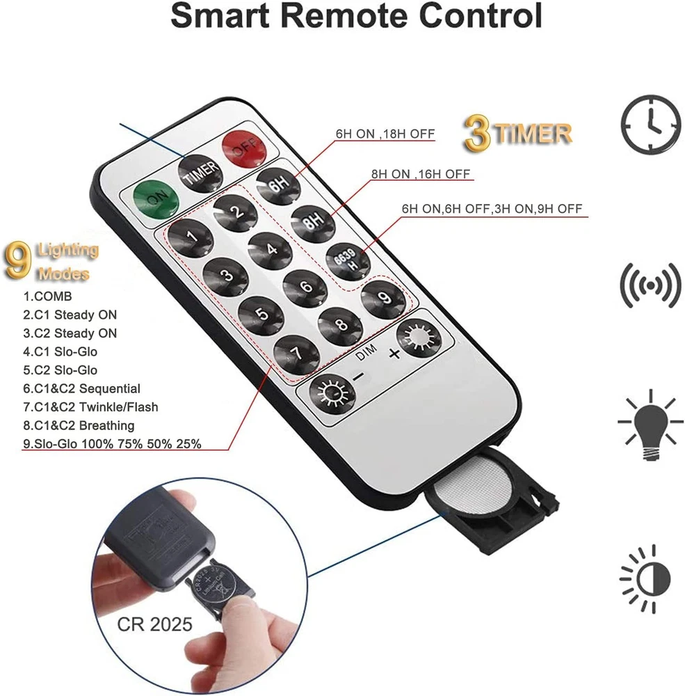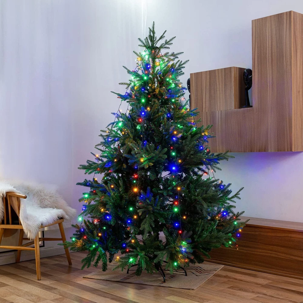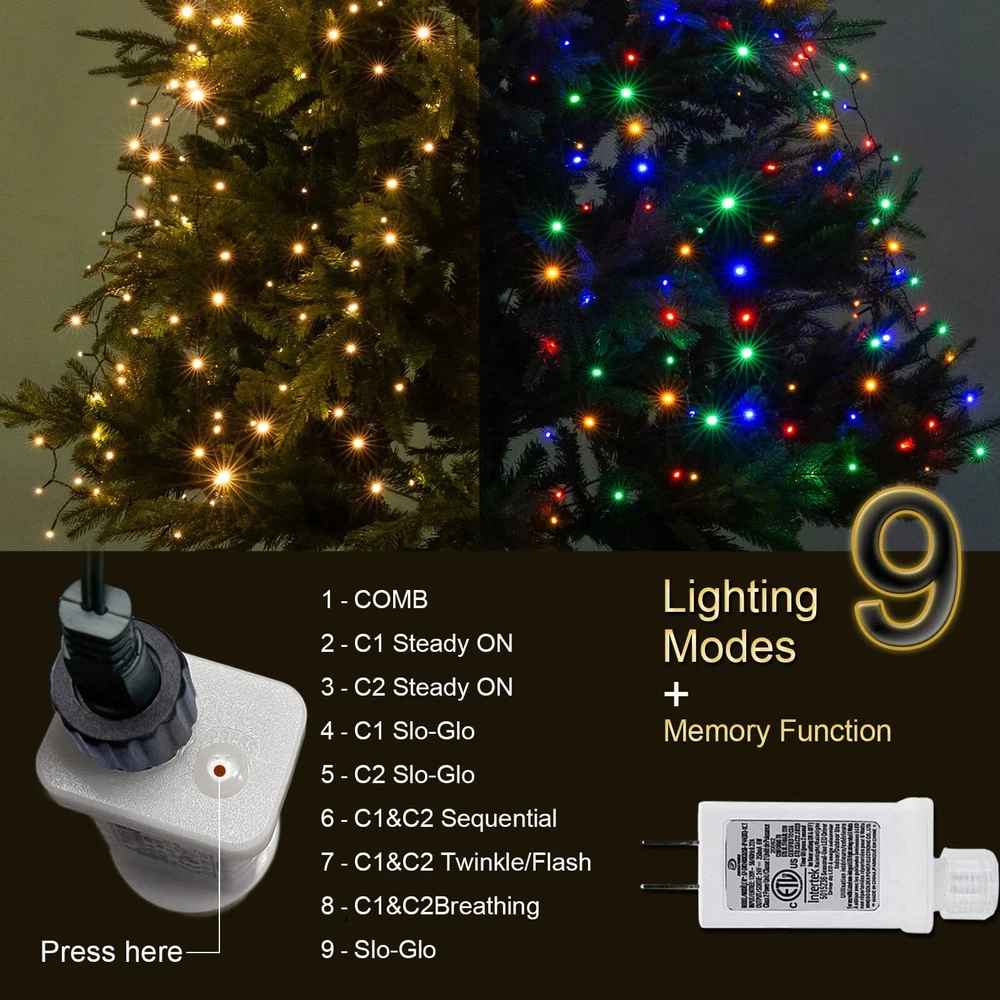 【Ring Christmas Tree System】No longer needed the constant tangling of cables in the old christmas tree string lights. Simply place the halo ring over the top of the tree and align the 10 strands, each with 35 Warm White diodes downwards. 【9.84ft * 10 Lines Christmas tree light】29V safety power supply + 9.84ft power cord, 350 LEDs; tube distance: 0.2ft,Suitable for 7.5ft, 9ft or 11ft tree. 【WATERPROOF AND SPLASHPROOF】IP44, the LED light is made of waterproof material. Waterproof designed lights perfect for both indoor and outdoor decorations. The strong construction makes it tough and sturdy, not easy to break apart and overheat after long hours of usage. (Please keep the power adapter away from water.) 【SECURITY】It has passed UL security certification.And the output voltage of the lamp belt is relatively low during operation.In addition, when one of the small bulbs fails, the whole string of lamps will not be involved. 【2 color Changing & 8 different modes】: Warm white and Multicolor ; Combination, wave, continuous glow,Slowly brighten, illuminate, slowly fade, sparkle, glow. Suitable for xmas tree indoor outdoor,Christmas Decorations Lights outdoor , Christmas tree LED lights,Christmas Tree External Light Chain.