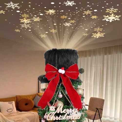 Christmas Tree Topper Hat with 3D LED Rotating Snowflake Projector Plush Black