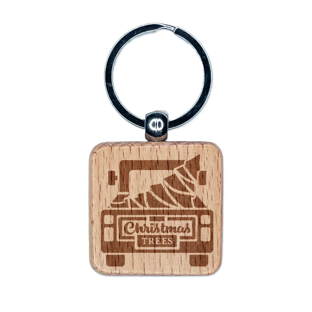 Christmas Tree Truck Engraved Wood Square Keychain Tag Charm