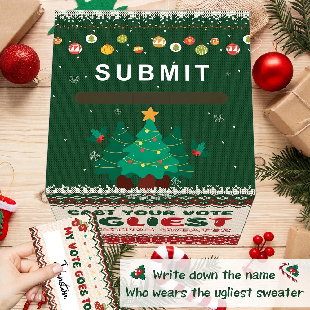 【Christmas Ugly Sweater Card Box Set】The set comes with 1 Christmas ugly sweater contest ballot card box (8.7 x 8.7 x 8.7 inches) and 50 pieces of ballot voting cards (4.72 x 3.14 inches). Each card is double-sided, one side is Christmas ugly sweater and the other side is for guests to vote. Ugly sweater designs add more fun to your Christmas party 【Made of Thick Cardboard】Our Christmas ugly sweater contest ballot card box is made of thick cardboard, which is stronger and more reliable. And the outer layer of the box is covered with a smooth film to prevent it from getting stained, making the box more vivid and colorful. The Christmas ugly sweater elements patterns will impress everyone guests 【How To Play?】Tell guests to write down the name of the person wearing the ugliest sweater. Have them put their cards in the Christmas ugly sweater contest ballot card box. Finally, the person with the most votes is the winner 【Christmas Ugly Sweater Design】Christmas Ugly Sweater and Christmas tree elements are printed on the surface of the box, 'CAST YOUR VOTE UGLIEST CHRISTMAS SWEATER' is printed on the front of the box. All backgrounds are designed with Christmas elements. The Christmas ugly sweater contest ballot card box has a slot on the top and the pattern design can give guests a bright effect! The unique design can also be the icing on the cake for your Christmas party 【Easy to Assemble】Christmas decorative voting card box is very easy to use. The unique foldable design is easy to assemble and use, which will also save a lot of storage area. Let the Christmas decorative voting card box add more excitement to your Christmas party!