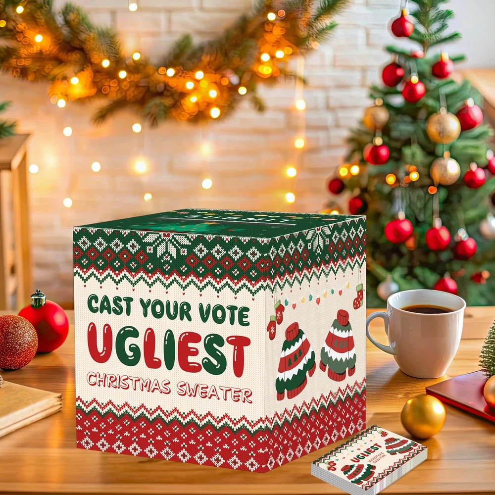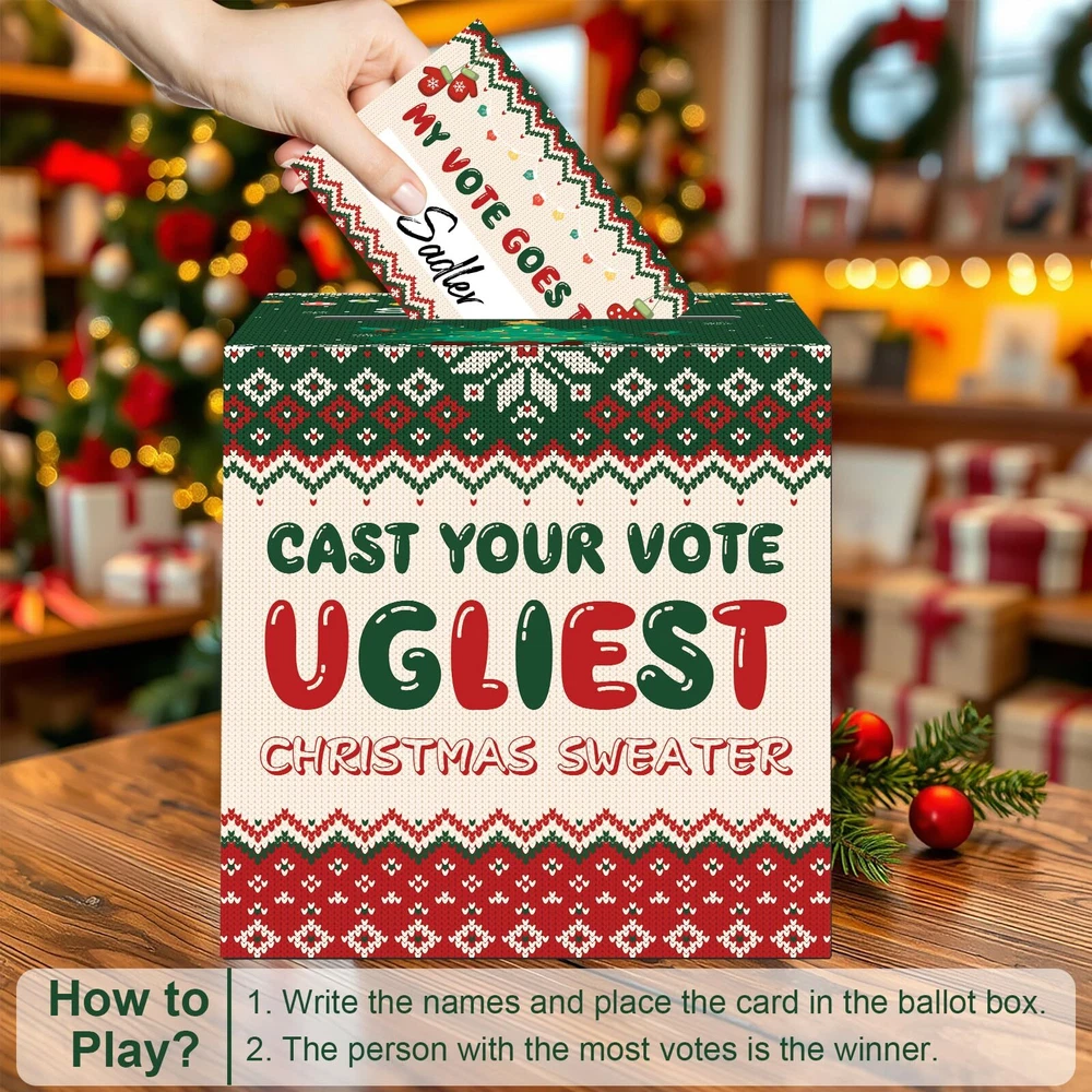 【Christmas Ugly Sweater Card Box Set】The set comes with 1 Christmas ugly sweater contest ballot card box (8.7 x 8.7 x 8.7 inches) and 50 pieces of ballot voting cards (4.72 x 3.14 inches). Each card is double-sided, one side is Christmas ugly sweater and the other side is for guests to vote. Ugly sweater designs add more fun to your Christmas party 【Made of Thick Cardboard】Our Christmas ugly sweater contest ballot card box is made of thick cardboard, which is stronger and more reliable. And the outer layer of the box is covered with a smooth film to prevent it from getting stained, making the box more vivid and colorful. The Christmas ugly sweater elements patterns will impress everyone guests 【How To Play?】Tell guests to write down the name of the person wearing the ugliest sweater. Have them put their cards in the Christmas ugly sweater contest ballot card box. Finally, the person with the most votes is the winner 【Christmas Ugly Sweater Design】Christmas Ugly Sweater and Christmas tree elements are printed on the surface of the box, 'CAST YOUR VOTE UGLIEST CHRISTMAS SWEATER' is printed on the front of the box. All backgrounds are designed with Christmas elements. The Christmas ugly sweater contest ballot card box has a slot on the top and the pattern design can give guests a bright effect! The unique design can also be the icing on the cake for your Christmas party 【Easy to Assemble】Christmas decorative voting card box is very easy to use. The unique foldable design is easy to assemble and use, which will also save a lot of storage area. Let the Christmas decorative voting card box add more excitement to your Christmas party!