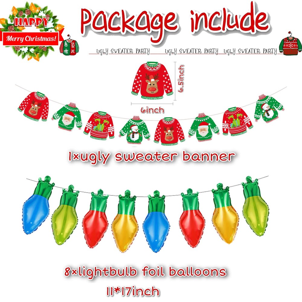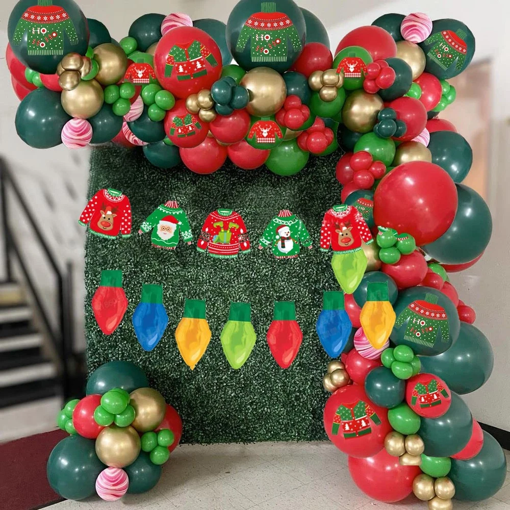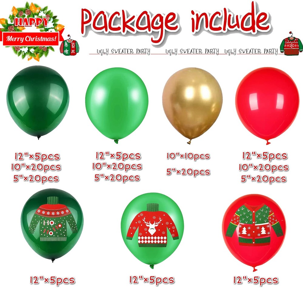 Christmas Ugly Sweater Party Decoration Balloon Garland Set The package includes: 1pcs Ugly Sweater banner ,8pcs Lightbulb foil balloons 11*19 inches,3 types Ugly Sweater patterned balloons(5psc 12inches each ), dark green latex balloons(5psc 12inches,20pcs 10inches,20pcs 5inches), red latex balloons (5psc 12inches,20pcs 10inches), green latex balloons (20psc 10inches,20pcs 5inches), Metallic gold latex balloons(10psc 10inches,20pcs 5inches), Whole Balloon Garland Accessories Kit (tape strip*1 + 100 dot glue*1 ). Special design: The balloon group is composed of Christmas green red latex balloons and metallic gold latex balloons . All balloons are made of natural latex, and other balloon accessories are made of PP. All materials are high quality and safe, very durable, non-toxic and tasteless. Easy to decorate: The sweet balloon garland bag made with the tools we provide is very easy. Just match with balloon garlands of different sizes and colors, it will bring you amazing effects, it will be a simple and beautiful Decorations. Wide range of applications: holiday balloons are suitable for many occasions, like Christmas party, ugly Christmas sweater party, birthday party, holiday party, family gathering, winter celebration, etc; You can decorate your entryway, Christmas tree, staircase. If you have any dissatisfaction with this purchase, please feel free to contact us, when you contact us, we will solve the problem for you within 24 hours within working days.