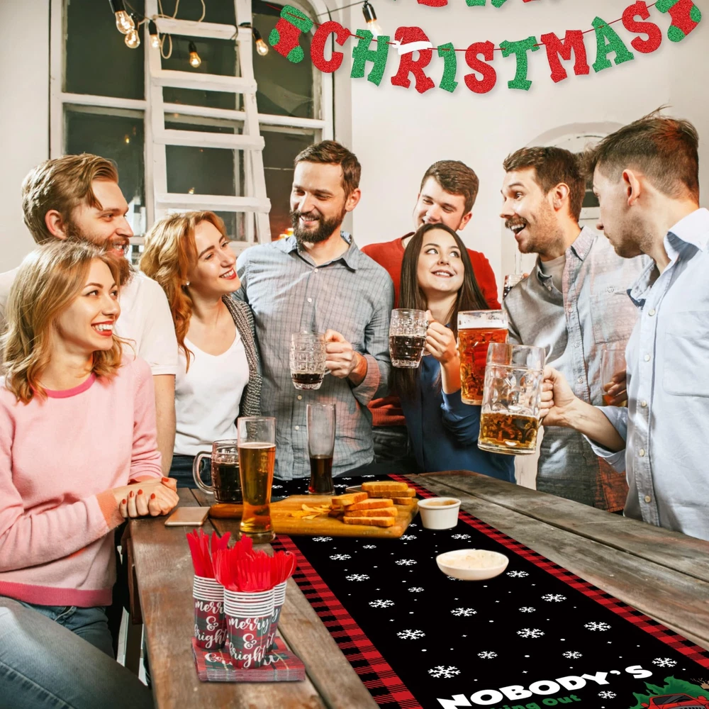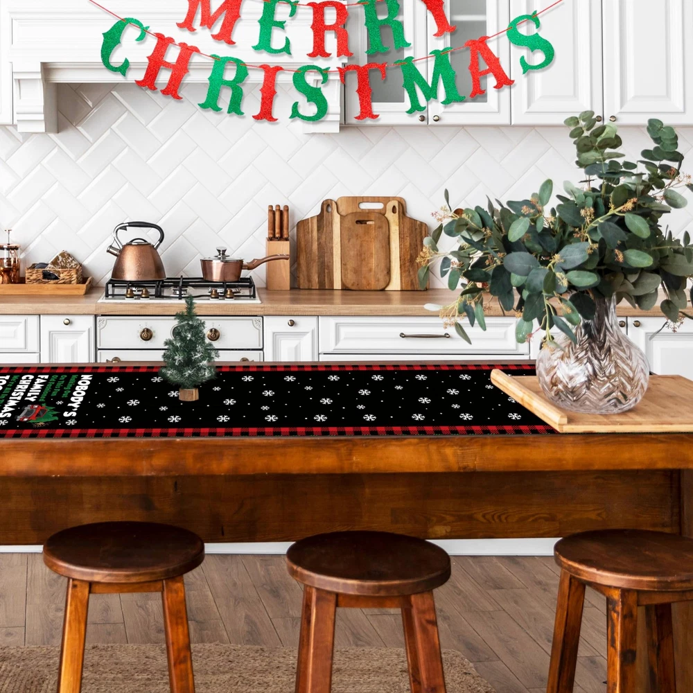 SPECIFICATION: Material: Premium Cotton & Linen Size: 13x72 inch Package Includes: 1 x Christmas Table Runner Festive Holiday Decor: This table runner would make a fantastic way to infuse your living space with the spirit of Christmas, creating a cheerful atmosphere that will be appreciated by both children and adults. NOTE: ->Due to the different displays of the computers, the color of the real item may be slightly different from the picture shown. ->Please allow 0.5-1 cm errors due to manual measurement. Conversation Starter: This table runner not only adds a humorous twist to your holiday decorations but also serves as a fantastic conversation starter among guests, sparking fond memories of the beloved Christmas Vacation film and creating a festive, lighthearted atmosphere at your table. Premium Linen Fabric: Crafted from premium linen fabric, this table runner not only boasts durability but also provides a luxurious backdrop for your holiday feast. Its high-quality material ensures it withstands years of festive use. Easy Maintenance: Cleaning up after your holiday gathering is a breeze, as this table runner is easy to care for. Simply machine wash it on a gentle cycle and hang it to dry, ensuring it's ready to spread holiday cheer for many seasons to come. Ideal Size for Most Tables: Measuring a generous 13 inches by 72 inches, the runner is designed to fit beautifully on most dining tables, providing a stylish and humorous base for your place settings and festive centerpieces. Griswold Family Antics: This table runner is printed with iconic and funny quotes from the classic film - Nobody's walking ou on this FUN-OLD-FASHIONED family Christmas, we're all in this together, bringing the movie's humor directly to your holiday table.