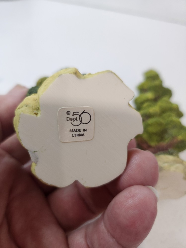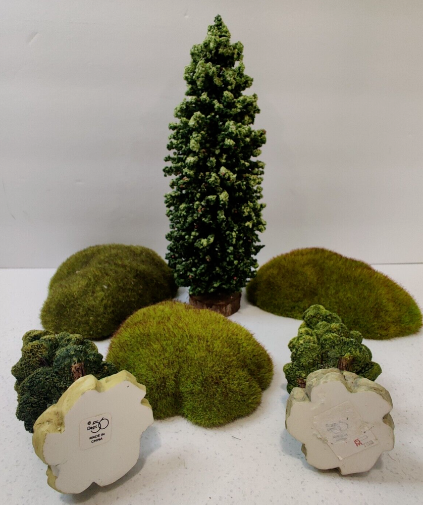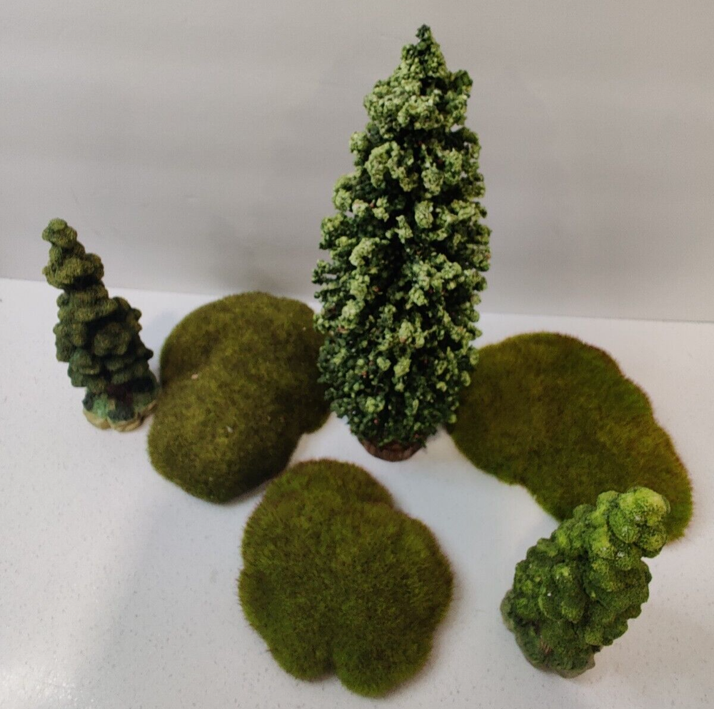 Brand: Couple of trees are Dept 56, others unbranded Compatible Product: For Scenery Material: Resin, wood, plastic, cork Set Includes: 3 trees, 3 moss rocks/schrubs Theme: Landscaping Type: Shrubs & trees for landscaping, moss rocks Color: Green Seller Notes: “In very good condition”