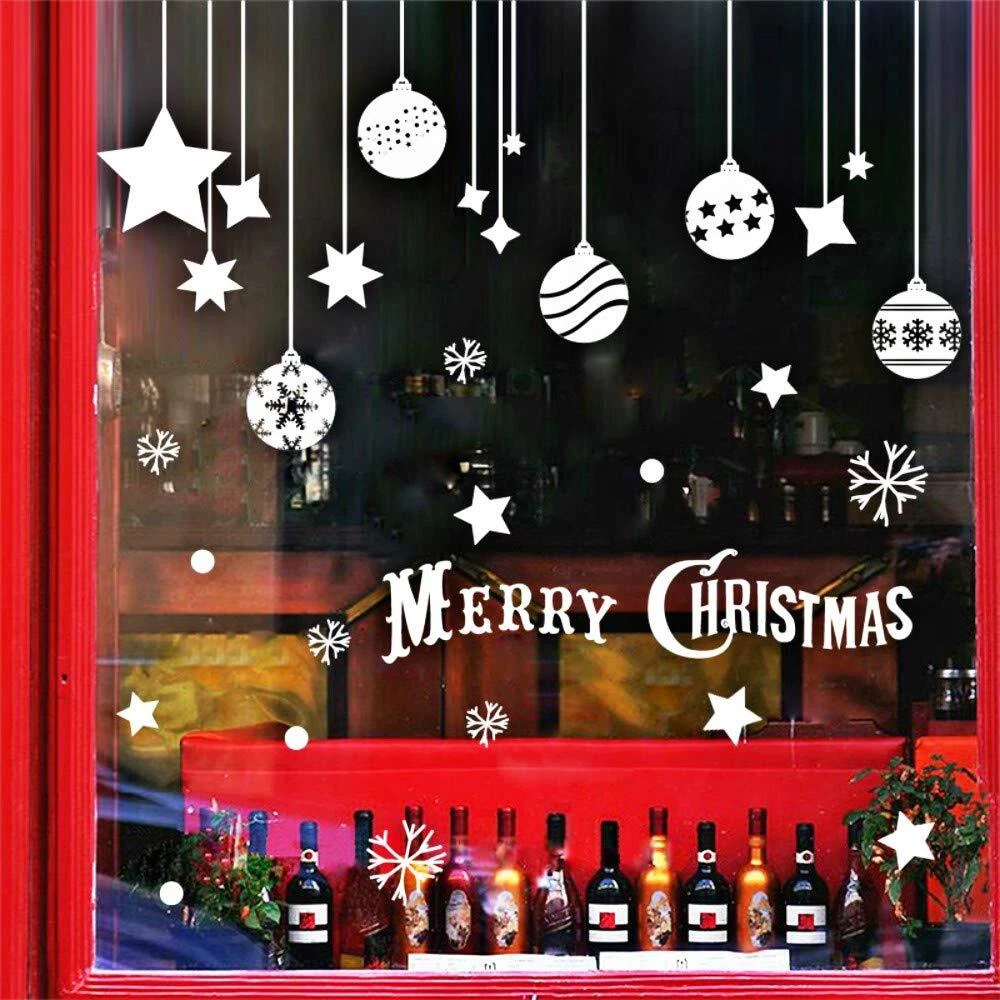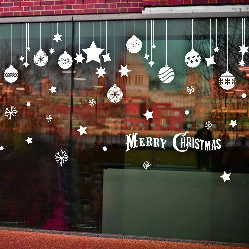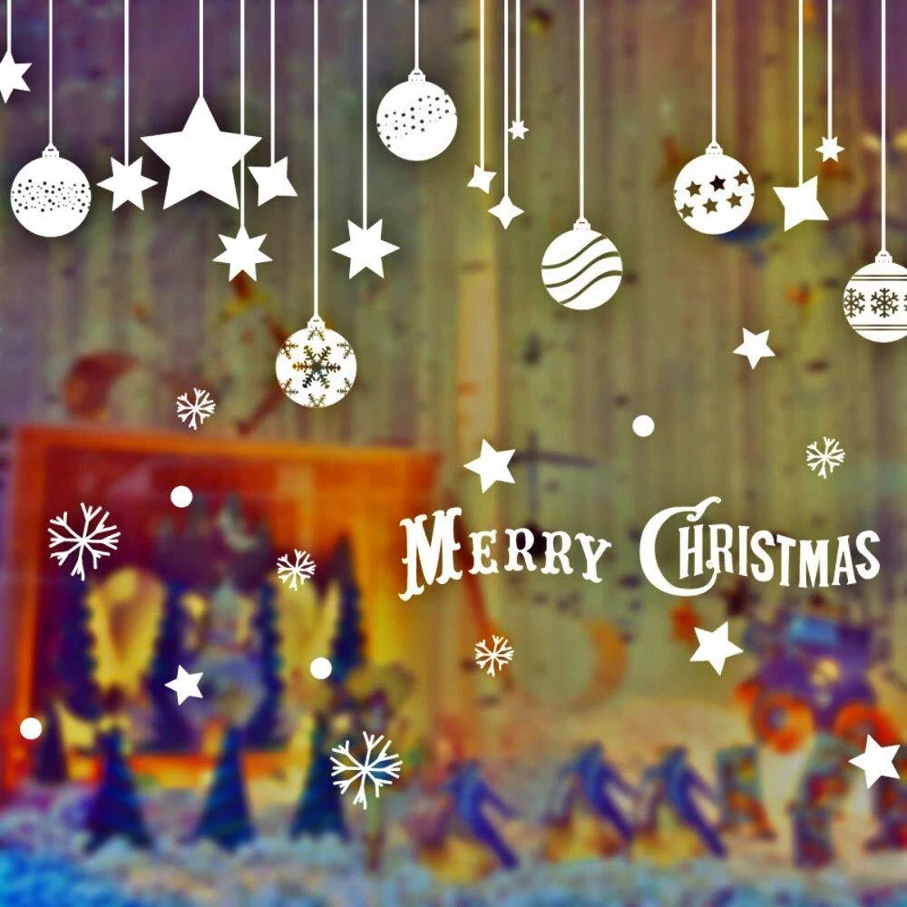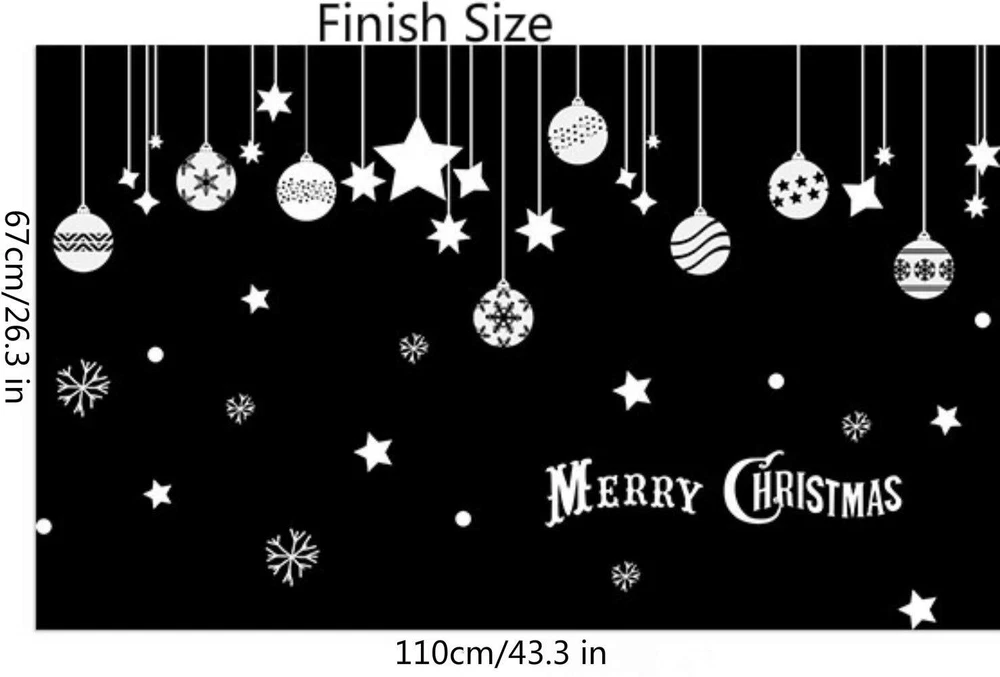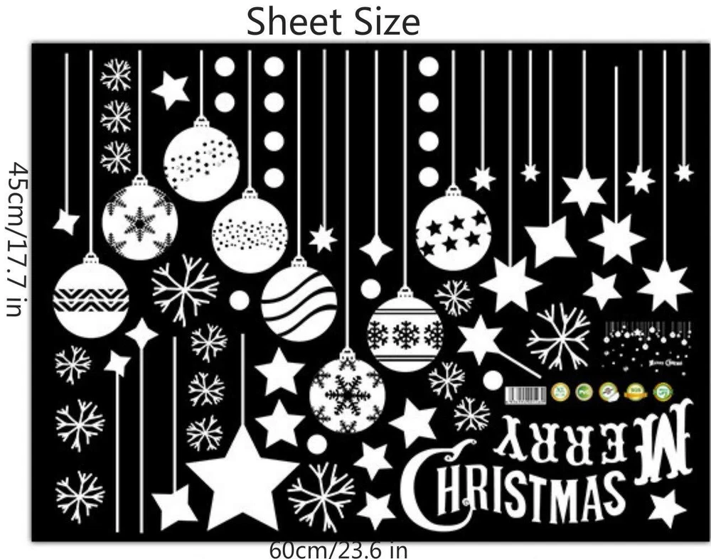 Item Features Removable wall decals are made of environment friendly material. Easy to peel and stick, can be removed in seconds without damaging your walls. Works great for home, Store,office or nursery kid's room decorations. Our wall stickers are well designed in different patterns, check out our store for more wall decals. We hope you enjoy your product and share with us your creations and innovations. Notes and Instructions 1.Before Pasting, pls release it and keep flatting 1 days, until the stickers is restored flatting, and then paste, to avoid curling edge peeling. 2.Please clean the surface with a cloth and let it dry before apply. 3.Please apply wall decals to Dry Smooth Surfaces,like clean smooth wall, glass, ceramic tiles and metal. 4.Don't apply to unfinished surfaces as they can render the adhesive ineffective very quickly and cause the wall to peel off. 5.Please press the decals firmly onto the wall. They leave no sticker remnants. About Customer Service provide free lifetime technical support.Unconditional 30-Day replacement or refund.24-Month worry-free warranty. Any problem please feel free to contact us and we will solve your issue immediately. Specifications Material: PVC Color:White Reference Size: 110cm*67cm/43.3*26.3inch Product Size: 60*45cm/23.6*17.7inch Weight: 100g Package includes 1 X Christmas Window Decal 【Quality Materlal】: All our wall decal made of long lasting, highly quality, waterproof, and durable vinyl that completely meet the standards.Environment-friendly, Non-toxic , Non-fading, Waterproof, Also safe for children. 【Easy Installation】: Easy to peel and stick PVC decals, simple steps to install the stickers on the wall without mess.They're reusable so you can peel off them and save for each year! Just save the backing they came on and store them flat and in a cool place. 【Application Surface】: Can be applied to any smooth and clean surfaces such as walls, doors, windows, closet, etc 【About Size】: Can be adjusted as preference. There are sizes in the picture, please look at the size and buy again, thank you. 【Christmas Decorations】: Unique Christmas Decoration Idea Wall Sticker Design. Stars Snowflakes Bells Hanging Party Ornaments Exquisite Balls Decorations Pendant. They will spend a happy Christmas with you.