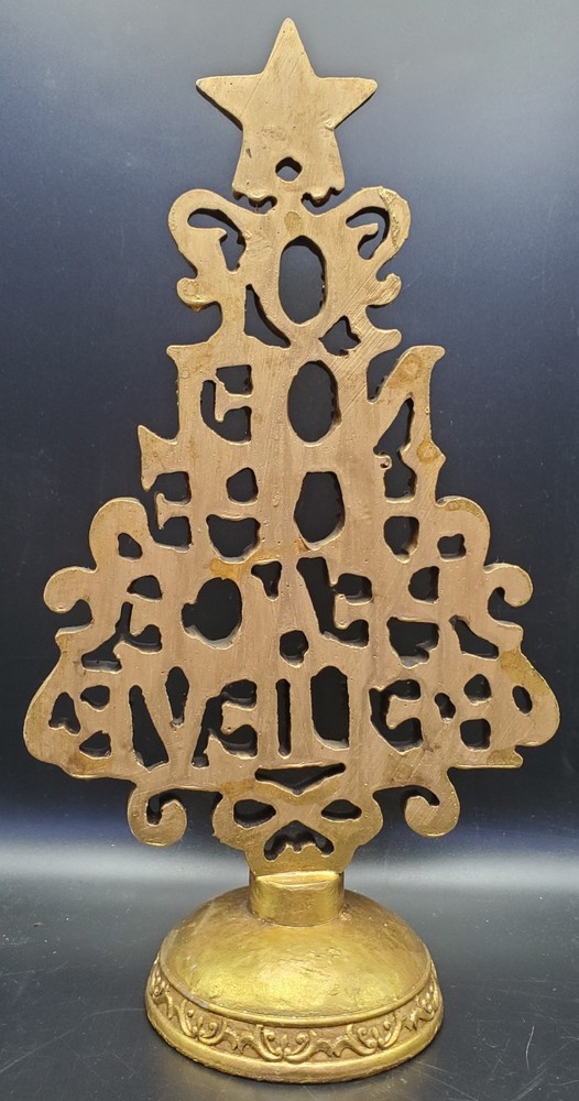 The Christmas Word Tree is a 13.25" table top decoration made of resin and adorned with a festive gold color, perfect for the holiday season. This collectible item originates from China and adds a touch of holiday cheer to any home decor. Its unique design featuring the words "Joy, Noel, Hope, Peace, Believe " makes it a charming addition to your seasonal decorations.