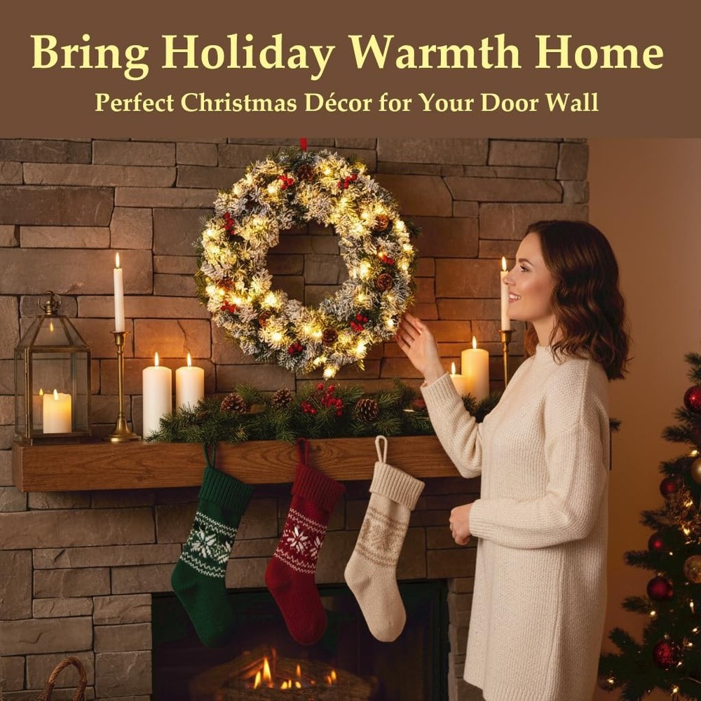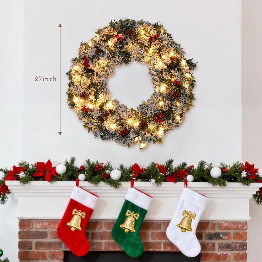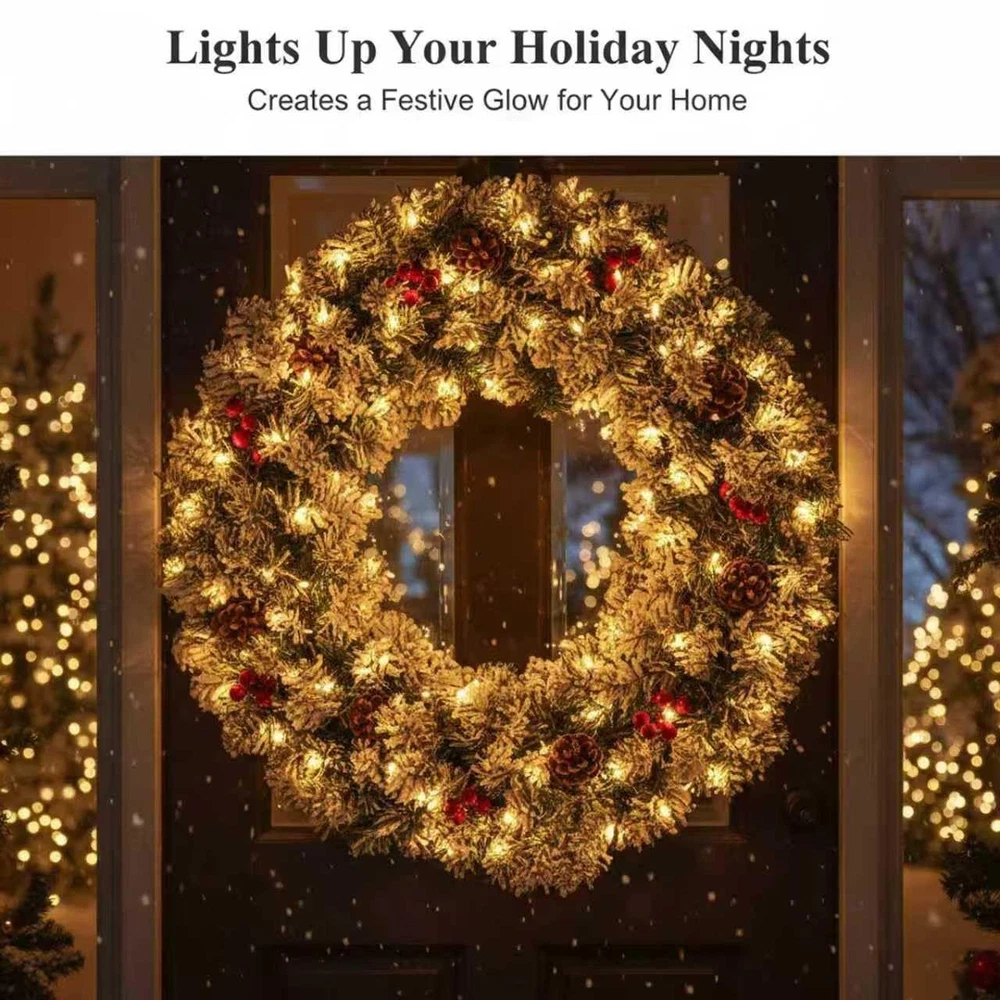 The Christmas wreath, More than just a decoration, the wreaths for front door embodies a warm invitation and celebratory spirit. Hung on a front door, Christmas wreaths for front door welcomes guests with the promise of joy and kinship within the home. Whether crafted from fresh greenery or designed as an enduring artificial piece, the Christmas wreaths remains a beloved tradition, instantly evoking the warmth, nostalgia, and magic of the holidays. A winter wreaths for front door combines the classic features of a traditional wreath—a circular evergreen base adorned with elements like berries, pinecones, and a bow—with the integrated addition of twinkling lights of holiday wreaths for front door. This key feature of the prelit christmas wreath significantly enhances its benefits: the lights of outdoor christmas wreaths provide a warm, radiant glow that ensures visual appeal both day and night, creating an exceptionally welcoming and cheerful atmosphere. This illuminated quality makes Christmas door wreath a more captivating centerpiece that stands out in the darkness, symbolizing not just eternal life but also the guiding light and hope of the holiday season. The Christmas wreath with lights stands as a classic and evocative symbol of festive cheer, traditionally crafted into a circle to represent eternal life and the unending love associated with the season. Woven from fragrant evergreen boughs like pine, spruce, or holly, large Christmas wreath symbolizes perseverance and hope, as these greens remain vibrant throughout the winter. 27" Pre-Lit Christmas Wreaths for Front Door: Designed with a lush pine branch base, this artificial Christmas wreaths is decorated with pine cones and red berry clusters. Our outdoor Christmas wreath serves as a universal symbol of welcome, celebration, and the warmth of the holiday season. This Christmas wreath with lights provide a warm, radiant glow that ensures visual appeal both day and night, creating an exceptionally welcoming and cheerful atmosphere. Battery Operated & Timer Function Christmas Wreath: Illuminate your space warmly with our Christmas door wreath. This lighted christmas wreath with 8 light modes can emit 8 lighting effects to create different atmospheres. Our xmas wreaths for front door comes with built-in auto timer function will automatic light for 6 hrs on and 18 hrs off cycle everyday to help you save more energy. This christmas wreath outdoor operates on just 3 AA batteries (not included). Perfect Size & Easy to Hang: Our 27-Inch Christmas wreath with integrated lights is perfect size to brighten up any room and designed for effortless installation and hanging. The key convenience of this prelit Christmas wreath lies in being pre-lit and often battery-operated, eliminating the need for messy external wires or a nearby power outlet. This allows for flexible placement on any door or wall with our winter wreath. Handcrafted Elegance of outdoor christmas wreath : Each Christmas wreath for front door is carefully handcrafted to ensure every Christmas red berry and pine cone stays perfectly in place. Simply fluff and arrange the branches to achieve your desired volume and texture, this exquisitely crafted winter door wreath brings a touch of refined artistry to your home, making it a timeless highlight of your festive gatherings. Versatile Christmas Decorations: Our outdoor christmas wreaths offer remarkable versatility, extending its festive charm far beyond the front door. While traditionally a welcoming symbol outdoors, Christmas door wreath also shines indoors as a stunning centerpiece. Hung above a mantel, Christmas wreaths frame the fireplace with holiday spirit. Placed on a wall or window, wreaths for front door becomes an instant focal point, spreading cheer throughout any room.Because the product may be compressed during transportation, please gently unfold the wreath branches by hand after receiving it to achieve a completely fluffy state.