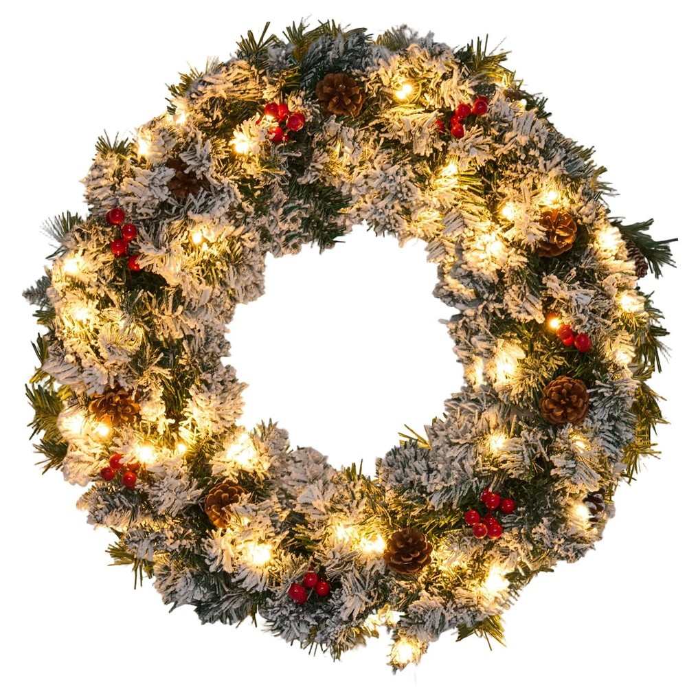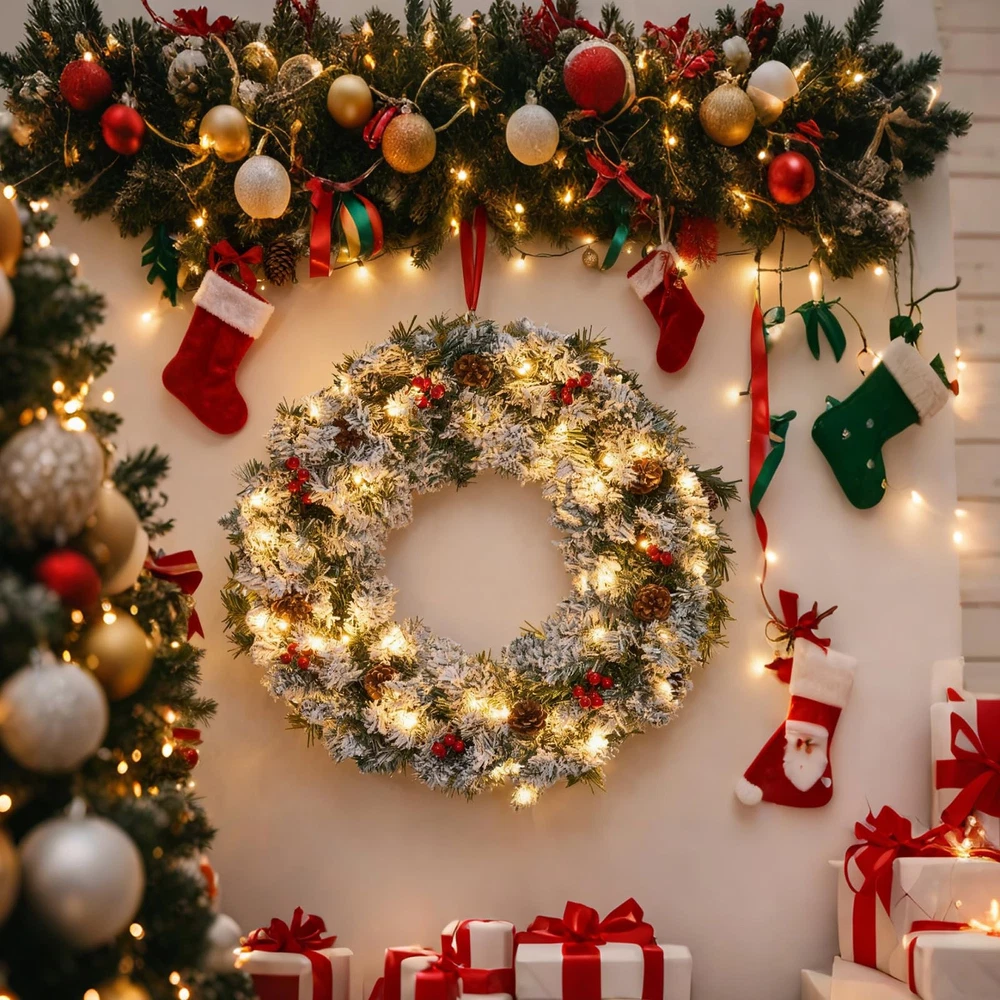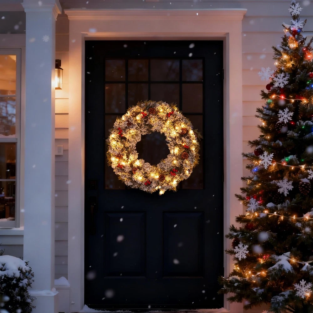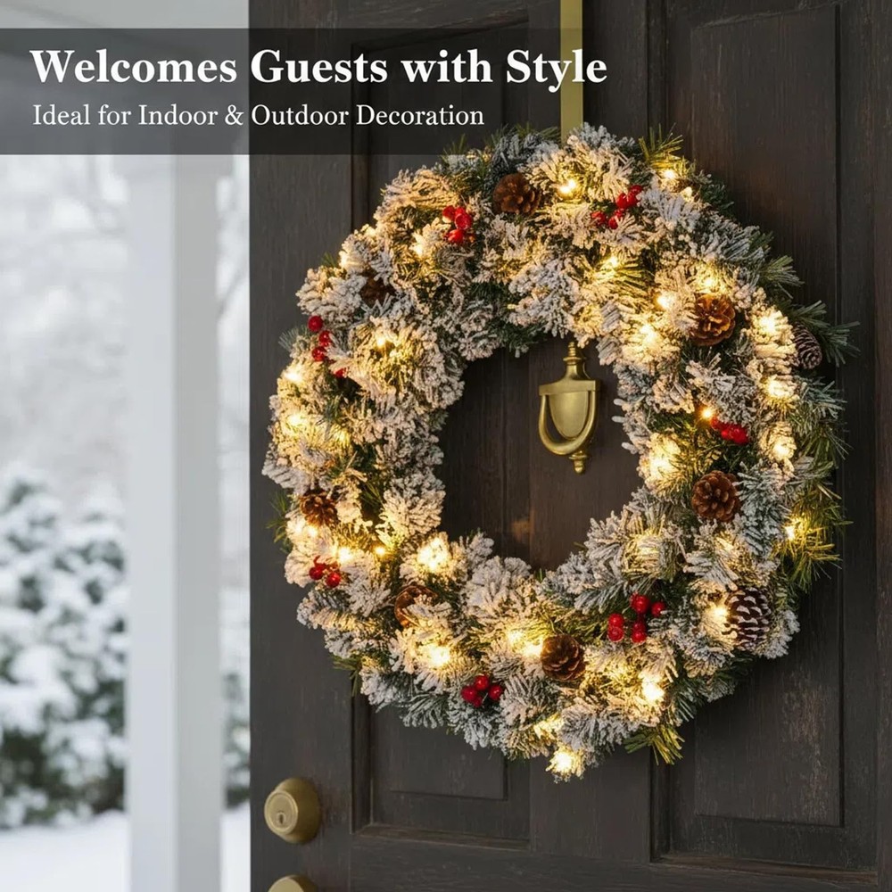 The Christmas wreath, More than just a decoration, the wreaths for front door embodies a warm invitation and celebratory spirit. Hung on a front door, Christmas wreaths for front door welcomes guests with the promise of joy and kinship within the home. Whether crafted from fresh greenery or designed as an enduring artificial piece, the Christmas wreaths remains a beloved tradition, instantly evoking the warmth, nostalgia, and magic of the holidays. A winter wreaths for front door combines the classic features of a traditional wreath—a circular evergreen base adorned with elements like berries, pinecones, and a bow—with the integrated addition of twinkling lights of holiday wreaths for front door. This key feature of the prelit christmas wreath significantly enhances its benefits: the lights of outdoor christmas wreaths provide a warm, radiant glow that ensures visual appeal both day and night, creating an exceptionally welcoming and cheerful atmosphere. This illuminated quality makes Christmas door wreath a more captivating centerpiece that stands out in the darkness, symbolizing not just eternal life but also the guiding light and hope of the holiday season. The Christmas wreath with lights stands as a classic and evocative symbol of festive cheer, traditionally crafted into a circle to represent eternal life and the unending love associated with the season. Woven from fragrant evergreen boughs like pine, spruce, or holly, large Christmas wreath symbolizes perseverance and hope, as these greens remain vibrant throughout the winter. 27" Pre-Lit Christmas Wreaths for Front Door: Designed with a lush pine branch base, this artificial Christmas wreaths is decorated with pine cones and red berry clusters. Our outdoor Christmas wreath serves as a universal symbol of welcome, celebration, and the warmth of the holiday season. This Christmas wreath with lights provide a warm, radiant glow that ensures visual appeal both day and night, creating an exceptionally welcoming and cheerful atmosphere. Battery Operated & Timer Function Christmas Wreath: Illuminate your space warmly with our Christmas door wreath. This lighted christmas wreath with 8 light modes can emit 8 lighting effects to create different atmospheres. Our xmas wreaths for front door comes with built-in auto timer function will automatic light for 6 hrs on and 18 hrs off cycle everyday to help you save more energy. This christmas wreath outdoor operates on just 3 AA batteries (not included). Perfect Size & Easy to Hang: Our 27-Inch Christmas wreath with integrated lights is perfect size to brighten up any room and designed for effortless installation and hanging. The key convenience of this prelit Christmas wreath lies in being pre-lit and often battery-operated, eliminating the need for messy external wires or a nearby power outlet. This allows for flexible placement on any door or wall with our winter wreath. Handcrafted Elegance of outdoor christmas wreath : Each Christmas wreath for front door is carefully handcrafted to ensure every Christmas red berry and pine cone stays perfectly in place. Simply fluff and arrange the branches to achieve your desired volume and texture, this exquisitely crafted winter door wreath brings a touch of refined artistry to your home, making it a timeless highlight of your festive gatherings. Versatile Christmas Decorations: Our outdoor christmas wreaths offer remarkable versatility, extending its festive charm far beyond the front door. While traditionally a welcoming symbol outdoors, Christmas door wreath also shines indoors as a stunning centerpiece. Hung above a mantel, Christmas wreaths frame the fireplace with holiday spirit. Placed on a wall or window, wreaths for front door becomes an instant focal point, spreading cheer throughout any room.Because the product may be compressed during transportation, please gently unfold the wreath branches by hand after receiving it to achieve a completely fluffy state.