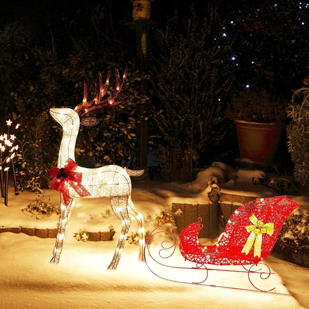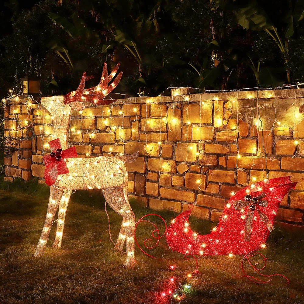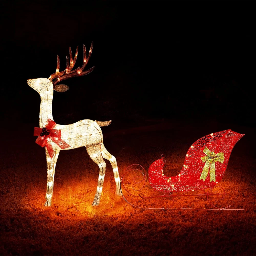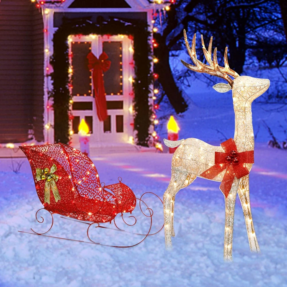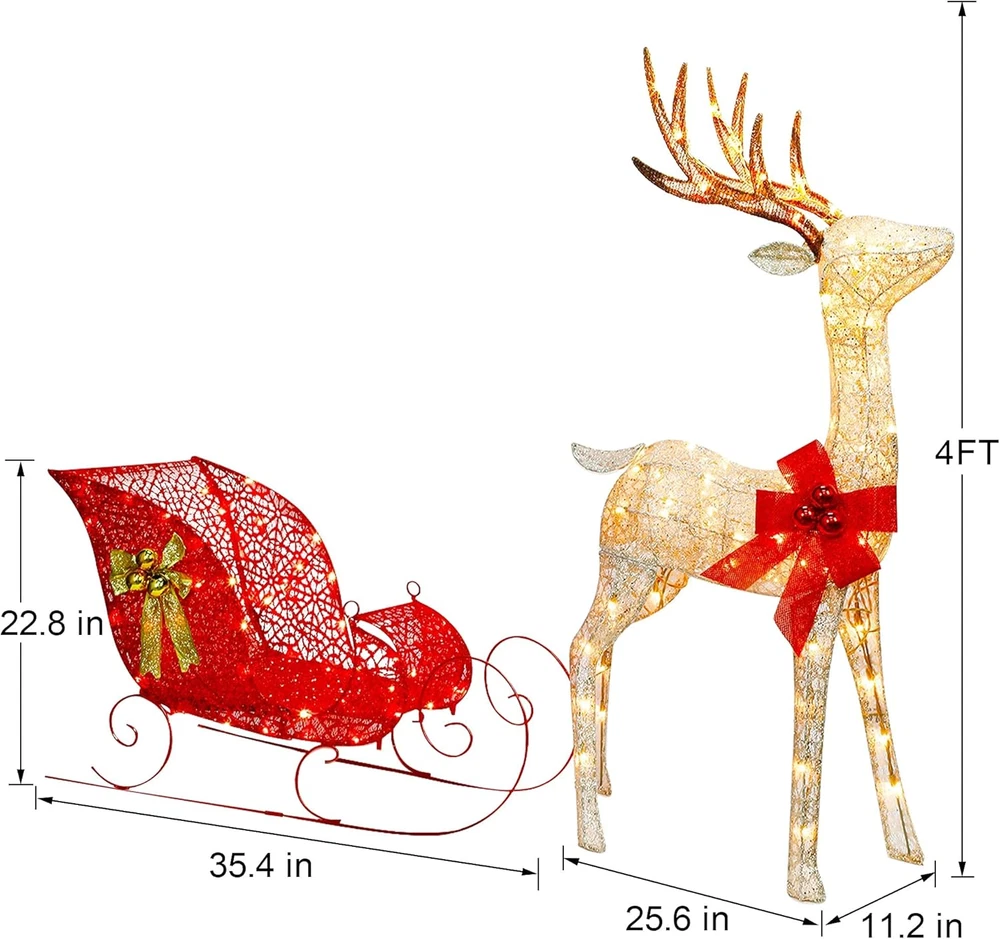Store New Arrivals Add to Favorite View Feedback Contact Christmas Yard Decoration, 4 FT Pre-Lit 3D Reindeer & Sleigh Outdoor Decorations with 120 Lights, Warm White Light up Glittered Standing Ornaments for Xmas Garden Patio Lawn Front Door Display Description Item dimensions L x W x H 61 x 15.6 x 48 inches Material Metal Number of Items 1 Color Warm White Light Color Warm White Number of Light Sources 120 Item Weight 20.2 pounds Theme Christmas Frame Material Metal Voltage 110 Volts Recommended Uses For Product Outdoor Product Dimensions 61 x 15.6 x 48 inches REINDEER PULLING SLEIGH: Zcaukya light up yard decoration is consisted of 2 parts: reindeer and sleigh. Reindeer measures 48" x 25.6" x 11.2", and the sleigh measures 35.4" x 22.8" x 15.6". 120 WARM WHITE LIGHTS: Reindeer and sleigh are adorned with 120 bulbs in total, evenly distribute throughout the whole internal surface of the item. When plugged on, it glows out bright warm white lights, and looks very charming and beautiful in the dark night. ASSEMBLE STEP BY STEP: Simple assembly is needed to set up such an adorable and delicate Christmas decoration. Just follow the assembly instruction included in package. The sturdy metal framework can well structure the shape and make it long time lasting for several years use. CHARMING APPEARANCE: The large bow with Christmas balls and glittered fabric in red and champagne add great gorgeous beauty. As a classic Christmas sign, reindeer pulling a sleigh brings great festive touch, which looks like the reindeer is running around with best wishes and announcing the arrival of Christmas. AWESOME CHRISTMAS DECOR: Zcaukya light up reindeer & sleigh with ideal size and appealing appearance makes it a wonderful Christmas decor to decorate your yard, garden, front gate, lawn or put besides Christmas tree to highlight your holiday. There is no doubt that it will catch everyone's eyes and get lots of compliment. Product Description Zcaukya Light Up Reindeer & Sleigh Yard Decoration Dimension of Reindeer: 48"H x 25.6"L x 11.2"W Dimension of Sleigh: 35.4"L x 22.8"H x 15.6"W Lights Quantity: 120 LEDs Lights Color: warm white Power Supply: Plug in Kindly Notes: 1. Except for the tail, all the other parts are connected by wires. Please check if there is a tail included in the packed box when you get it. 2. Please note that the glitter power may drop off slightly. 3. Please use the item under 110V voltage. 4. Please do not use it in rainy days to prevent from damage or danger. ABOUT US We offer the best prices around on high quality products. Our E-store includes media such as books, movies, music and games while offering electronics, toys, sporting apparel, clothing, tools, general home, garden items and more. SHIPPING We are always working hard to ensure your package arrives as soon as possible. Please understand that some factors like weather, high postal traffic, and the performance of shipping companies are outside of our control. We offer free shipping to the lower 48 states and ship within 2 business days of payment, usually sooner. We do not accept P.O. Boxes. Please provide a physical address. For shipping outside of the continental USA, we only use eBay's Global Shipping Program.The item is shipped to KY and then sent to the rest of the world. International customers are responsible for all duties and taxes. Continue to check out in order to calculate costs for shipping the item to your country. Messages regarding eBay's Global Shipping Program MUST be directed at eBay EXCLUSIVELY. RETURNS We offer a 30-Day Return Policy on items which you are not completely satisfied with. You have the option for a full-refund or an exchange of the item. No returns are available on items shipped outside of the USA. PAYMENT We accept PayPal. CONTACT US This page content is yet to come Please ad us to your favorite seller and visit again later Thank You CUSTOMER SATISFACTION We try our very best to make sure every customer is completely satisfied. If there's a problem, message us! We're happy to help. WE ACCEPT Copyright © 2021 AutoDS. | All Rights Reserved