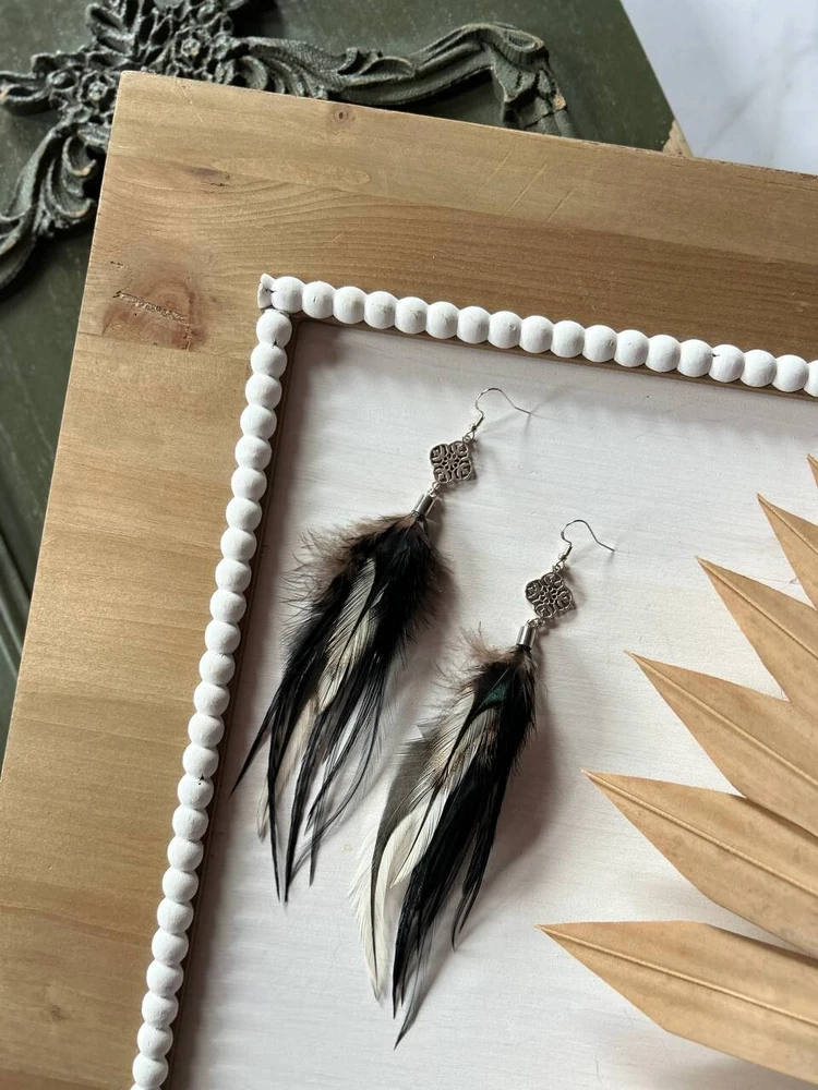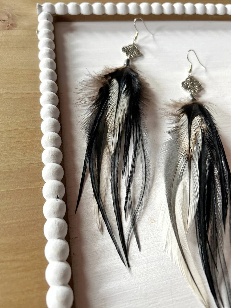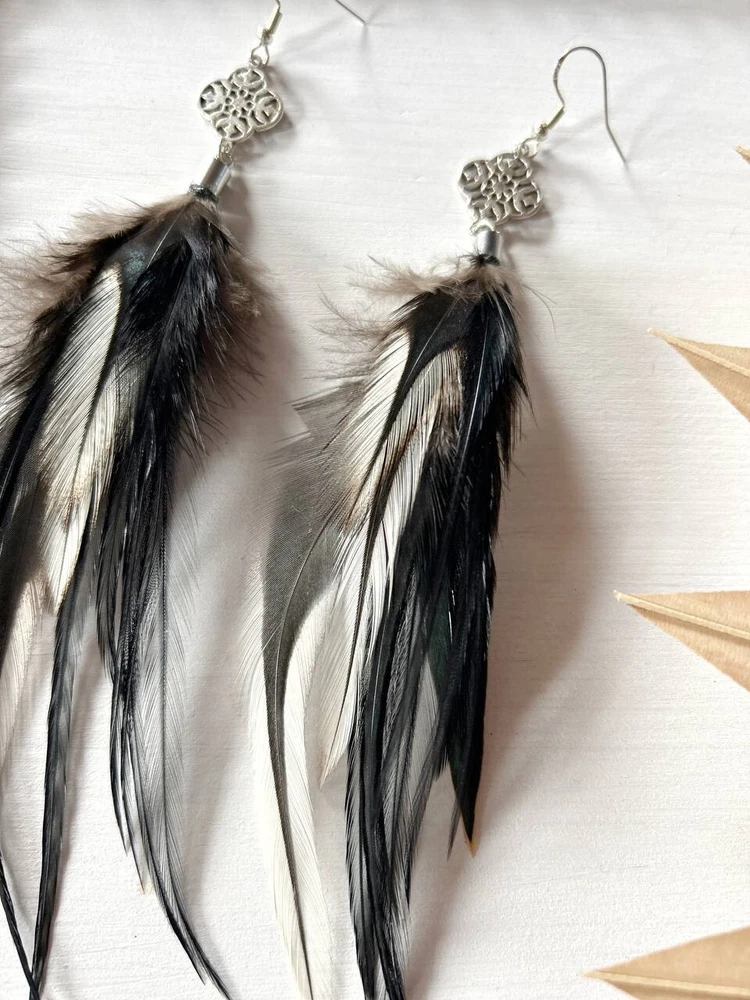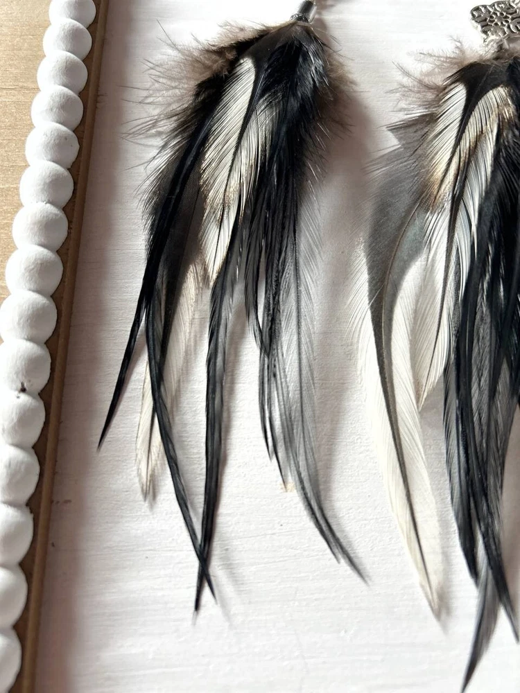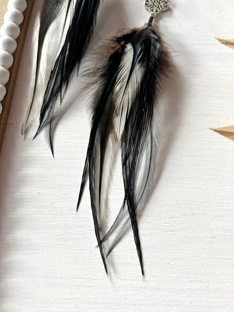 Make a bold statement with these uniquely designed handmade feather earrings. Their captivating combination of black tones and intricate detailing is perfect for adding an artistic touch to your look. Lightweight and elegant, these earrings are sure to attract attention and spark compliments wherever you go. Whether for a special occasion or to elevate your everyday style, these earrings are the perfect accessory to express your individuality! Features: * Materials: feathers, silver hook, metal findings * Length: 17 cm (7 inches) * Closure: hook I accept custom orders! Processing time 1-3 business days! Worldwide shipping 7-13 business days! SUPPORT 24/7!