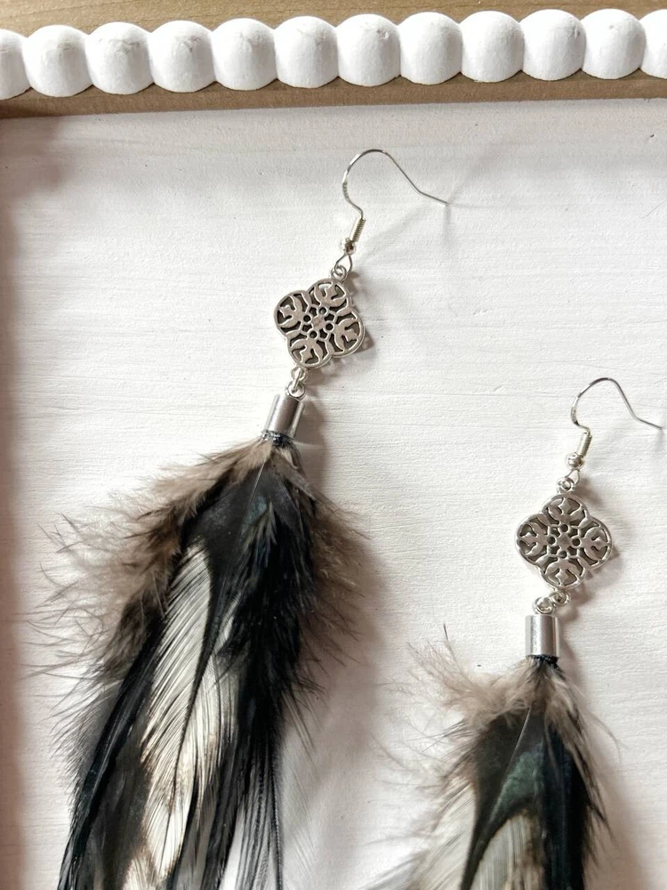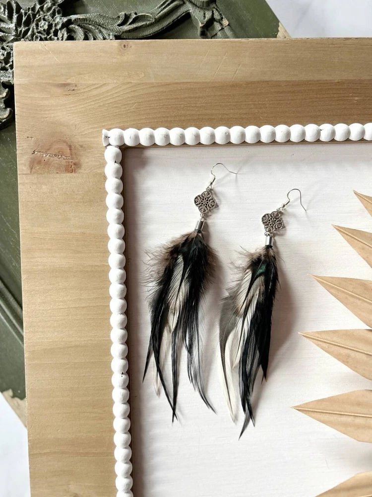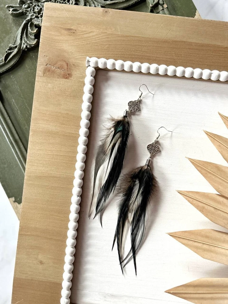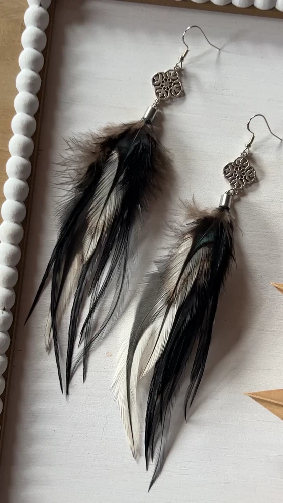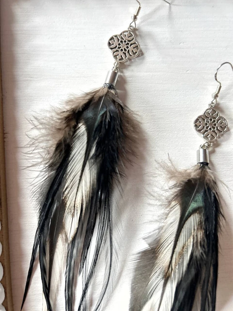 Make a bold statement with these uniquely designed handmade feather earrings. Their captivating combination of black tones and intricate detailing is perfect for adding an artistic touch to your look. Lightweight and elegant, these earrings are sure to attract attention and spark compliments wherever you go. Whether for a special occasion or to elevate your everyday style, these earrings are the perfect accessory to express your individuality! Features: * Materials: feathers, silver hook, metal findings * Length: 17 cm (7 inches) * Closure: hook I accept custom orders! Processing time 1-3 business days! Worldwide shipping 7-13 business days! SUPPORT 24/7!
