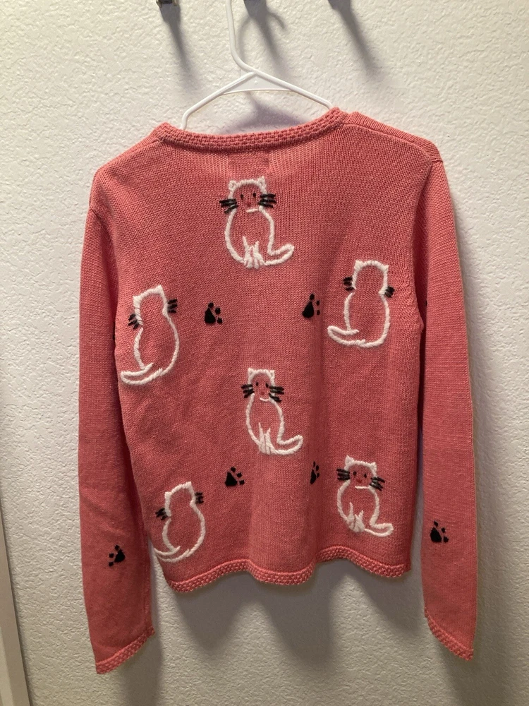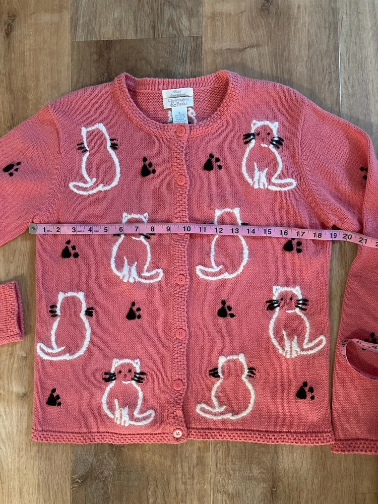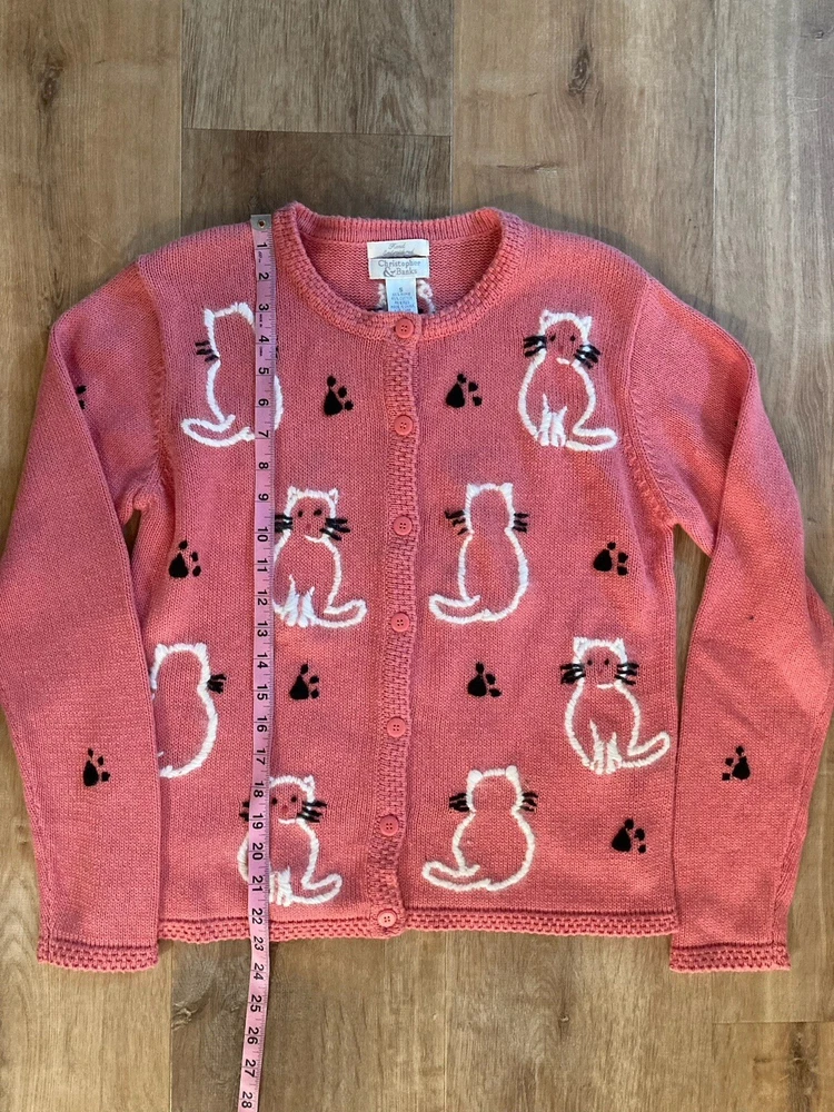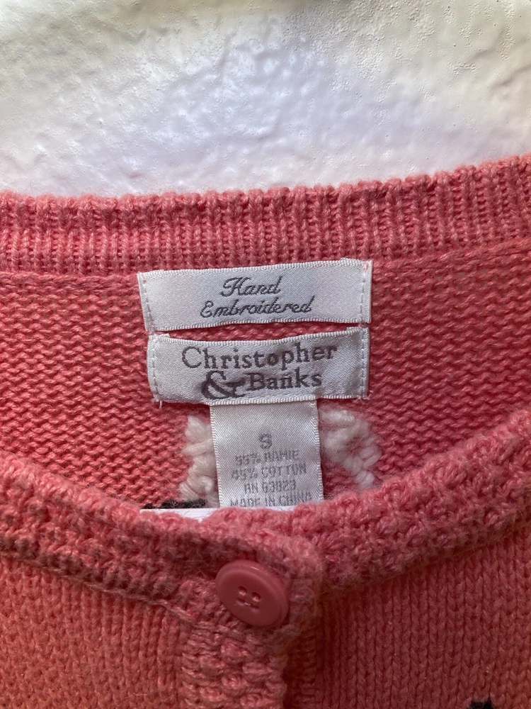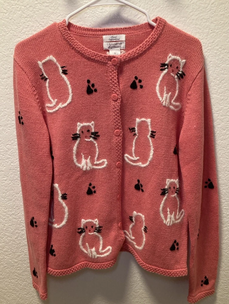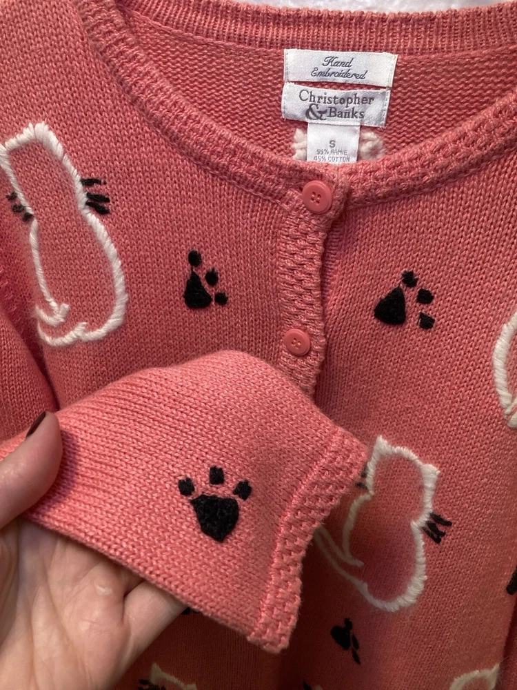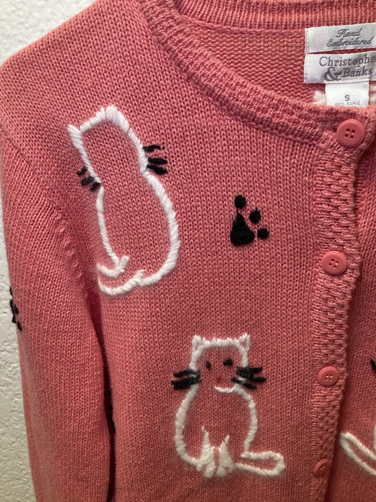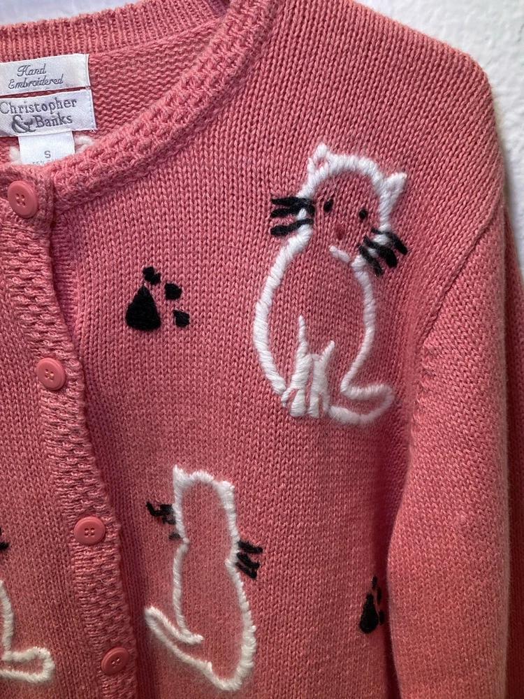 Theme: Cat Type: Sweater Season: Fall, Spring, Winter Country/Region of Manufacture: China Style: Cardigan Department: Women Accents: Button, Embroidered Knit Style: Tight-Knit Fabric Type: Knit Color: Pink Size: S Personalize: No Occasion: Business, Casual, Party/Cocktail Material: Cotton, Cotton Blend, Ramie Features: Collarless Vintage: Yes Garment Care: Hand Wash Only Fit: Regular Size Type: Regular Brand: Christopher & Banks Pattern: Animal Print Neckline: V-Neck Sleeve Length: Long Sleeve