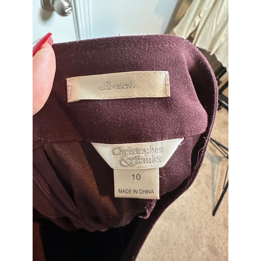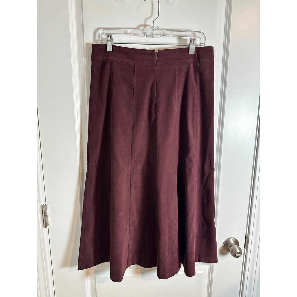 Alluring texture meets timeless style in this rich burgundy skirt! Expertly designed paneling creates subtle definition, flattering the figure with its A-line silhouette. A touch of stretch provides all-day comfort and ease of movement. Envision wearing this skirt to a sophisticated work event, a cozy date night, or a stylish weekend brunch. Type: Skirt Style: A-Line Skirt Length: Midi Color: Purple Department: Women Pattern: Solid Material: Suede Accents: Pleated Fabric Type: Suede Features: Stretch Character: Retro, Academia, Dark Academia, Classic, Burgundy Closure: Zip Occasion: Business, Casual, Workwear Keywords: suede skirt, midi skirt, burgundy skirt, stretch skirt, panel skirt, A-line skirt, Christopher & Banks, size 10, womens skirt, classic skirt, retro skirt, faux suede, fall fashion, winter fashion, career skirt