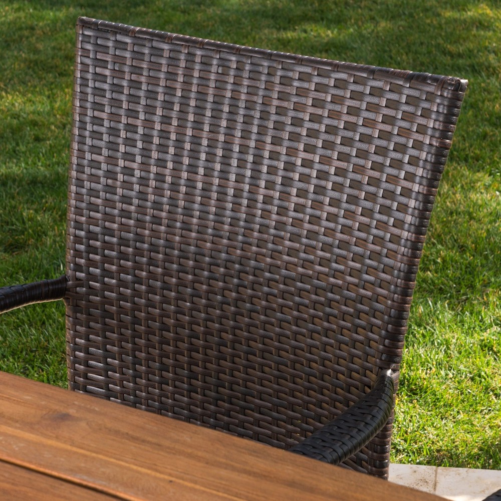 This clean and simple dining set combines the functionality of wood and iron with the comfort of wicker. Complete with a table, bench, and 4 wicker dining chairs, this set offers comfortable seating for 6 in the great outdoors. Sure to complement any patio decor, this dining set offers you a stylish wooden design with the functionality of an iron framework and comfortable wicker chairs, guaranteed to give you a weather resistant set that will last your for years to come. Includes: One (1) table, four (4) chairs and one (1) bench Material: Acacia Wood, Iron, Wicker Table and bench finish: Sandblast, sandblast light grey, sandblast dark brown Leg finsh: Rustic black, rustic white Chair wicker finish: Multibrown, grey Assembly required: Yes Table dimensions: 29.25 inches high x 71 Free Shipping Over $49.99* Details Christopher Knight Home Cooper Outdoor 6-Piece Rectangular Acacia Wood and Product Description: This clean and simple dining set combines the functionality of wood and iron with the comfort of wicker. Complete with a table, bench, and 4 wicker dining chairs, this set offers comfortable seating for 6 in the great outdoors. Sure to complement any patio decor, this dining set offers you a stylish wooden design with the functionality of an iron framework and comfortable wicker chairs, guaranteed to give you a weather resistant set that will last your for years to come. IncludesOne (1) table, four (4) chairs and one (1) bench MaterialAcacia Wood, Iron, Wicker Table and bench finishSandblast, sandblast light grey, sandblast dark brown Leg finshRustic black, rustic white Chair wicker finishMultibrown, grey Assembly requiredYes Table dimensions29.25 inches high x 71 inches wide x 35.50 inches deep Chair dimensions35.25 inches high x 24.75 inches wide x 25.50 inches deep Bench dimensions17.50 inches high x 63 inches wide x 14.50 inches deep ShapeRectangle Base TypeTrestle Table Top MaterialWood Set DesignDining Set Table Frame MaterialWood, Iron TypeWithout Cushions Product FeaturesWater Resistant, Weather Resistant MaterialWicker, Iron, Wood StyleContemporary, Modern AssemblyAssembly Required Chair Back HeightStandard Country of OriginChina Chair MaterialWicker Exact ColorBrown Seats Up To6 ColorBrown Size6-Piece Sets