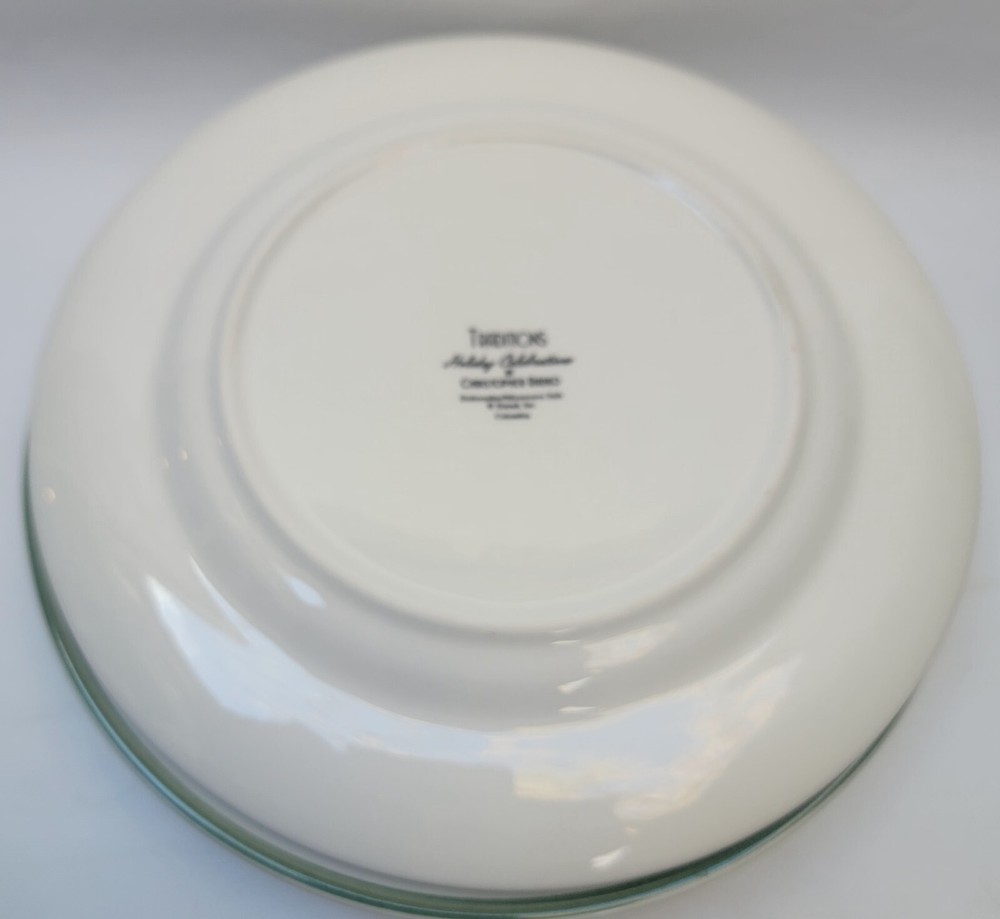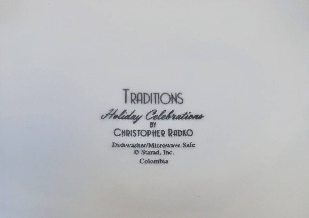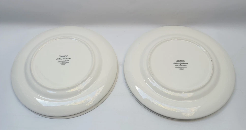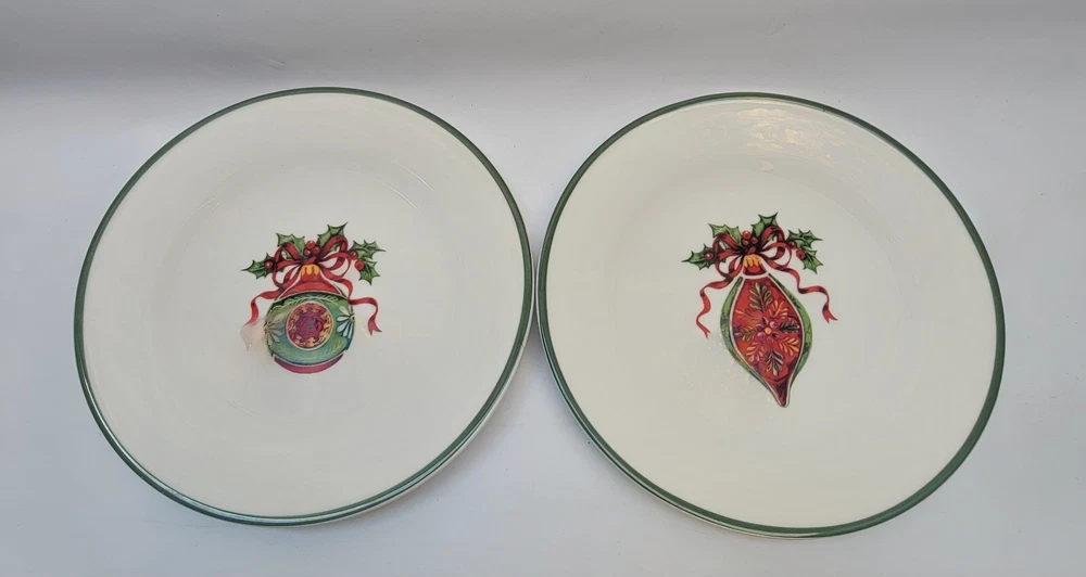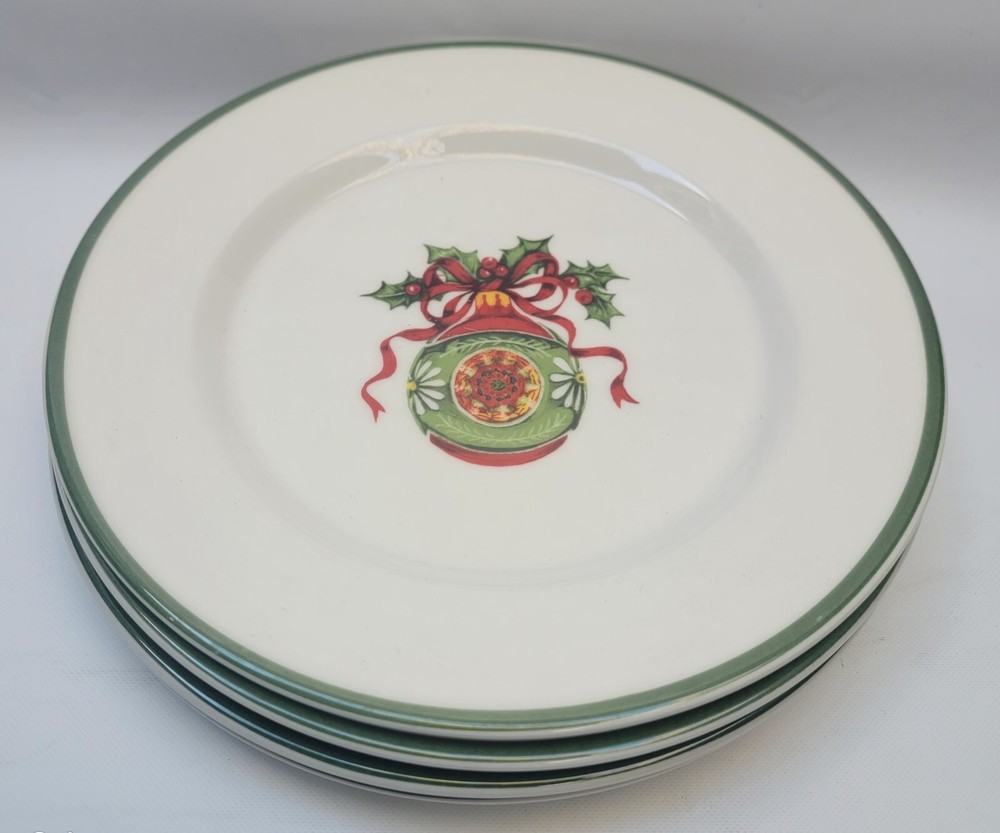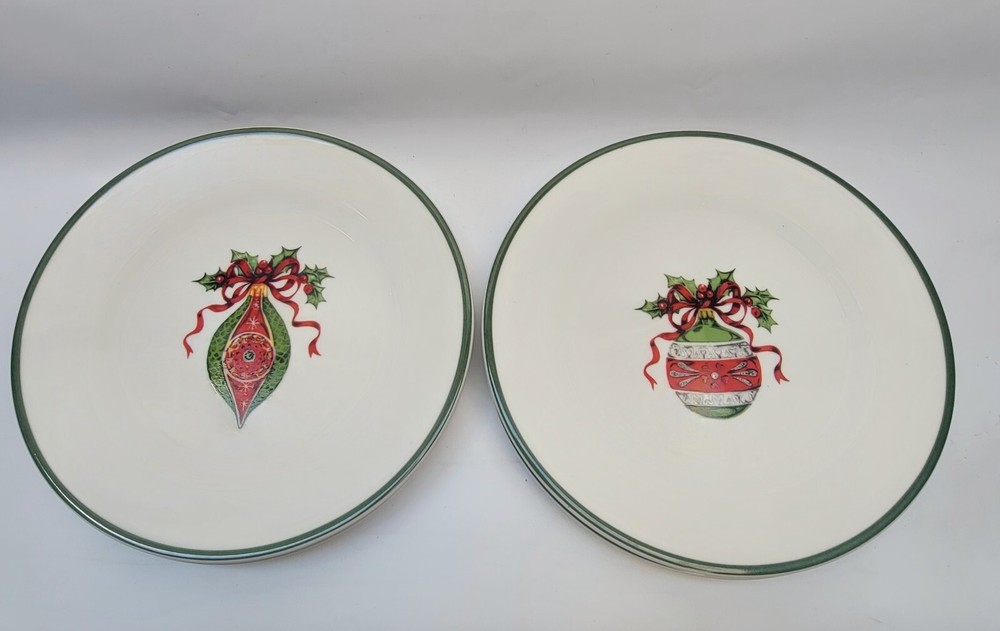 Add a festive touch to your dining room with this set of four Christopher Radko holiday salad plates. The plates feature a beautiful red and green color scheme, with a traditional style and porcelain material. Measuring 8.5 inches in length and 8.5 inches in width, these plates are perfect for serving your favorite holiday dishes. The green trim adds a touch of elegance to the design, making them a great addition to your table décor. Ideal for Christmas occasions, these plates will surely impress your guests and add a cozy touch to your home.