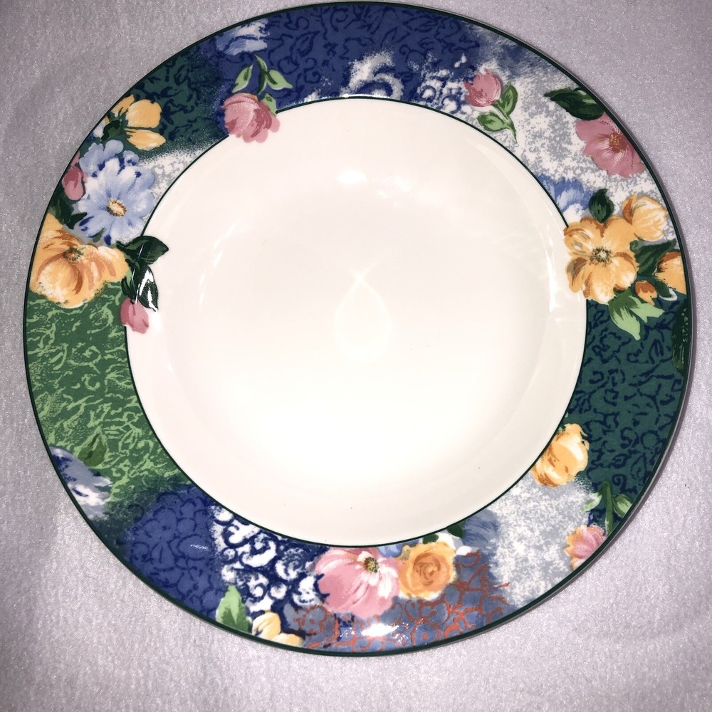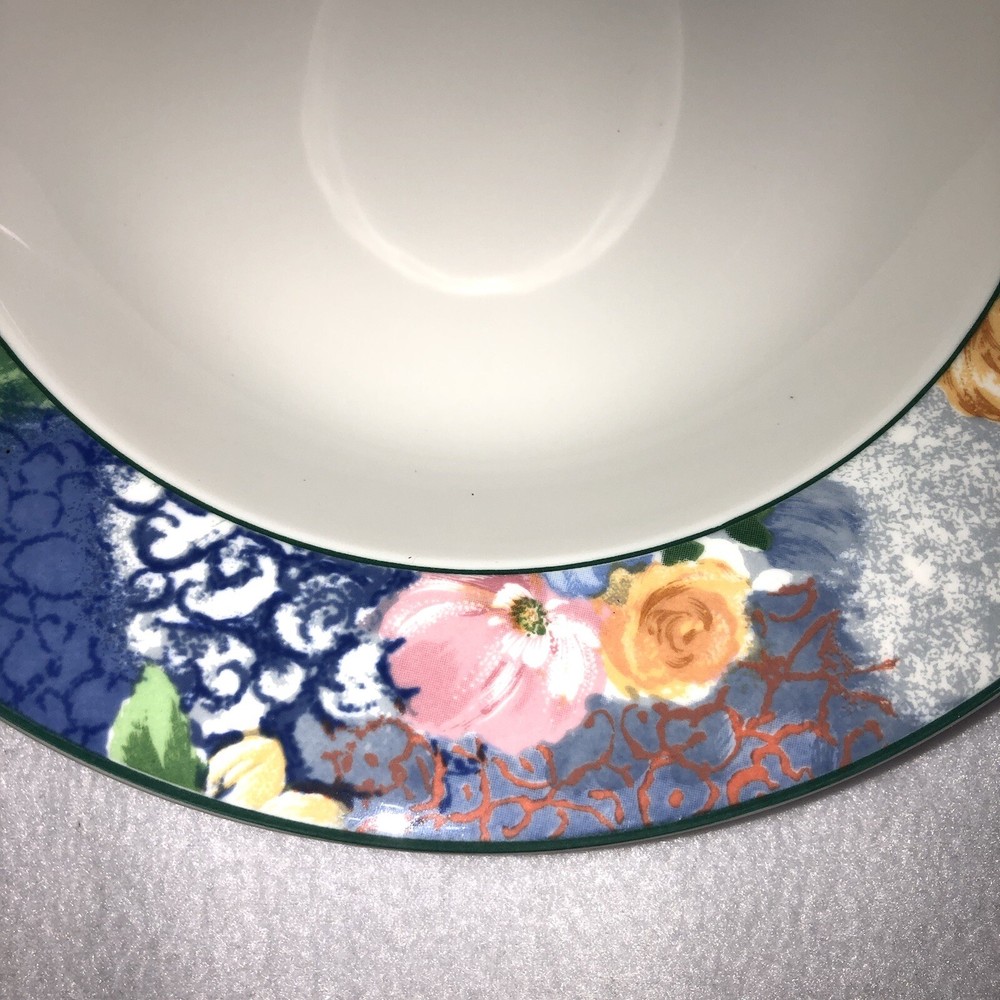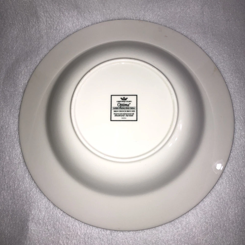 This is a SET OF 2 beautiful rimmed soup bowls by Christopher Stuart. This multi-colored floral pattern is called FRENCH BROCADE. It was in production from 1995 until 2001 and is currently discontinued. It features blue, yellow and pink flowers on the 1 1/2 inch rim of the bowl. The design is on a basic white bowl. As the back indicates, they are made of Optima, a super strong fine china and are Dishwasher, Microwave and Oven safe. The bowls measure approximately 9.5 inches wide. Soup bowls are in great pre-owned condition with only light utensil marks. See all photos for additional details. I do have multiple sets of 2 and 4 bowls available. Shipped via USPS Ground Advantage.