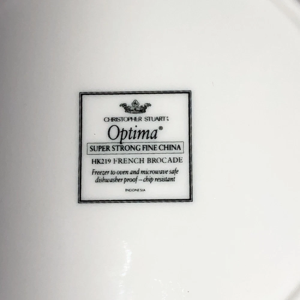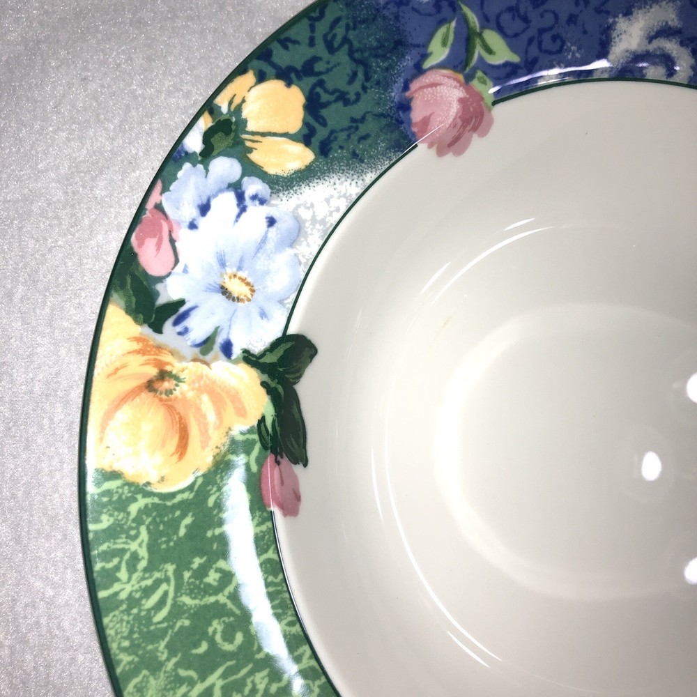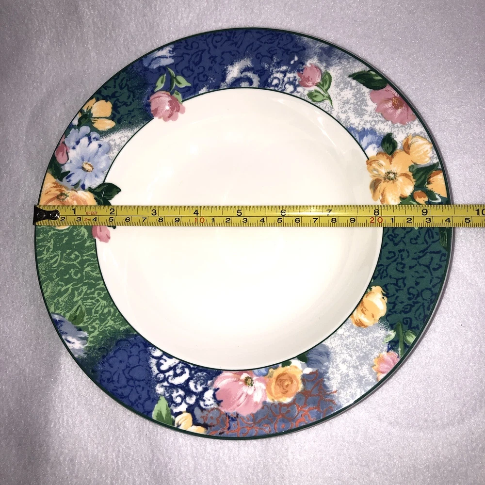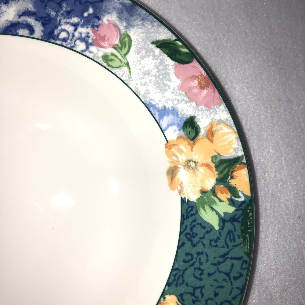 This is a SET OF 2 beautiful rimmed soup bowls by Christopher Stuart. This multi-colored floral pattern is called FRENCH BROCADE. It was in production from 1995 until 2001 and is currently discontinued. It features blue, yellow and pink flowers on the 1 1/2 inch rim of the bowl. The design is on a basic white bowl. As the back indicates, they are made of Optima, a super strong fine china and are Dishwasher, Microwave and Oven safe. The bowls measure approximately 9.5 inches wide. Soup bowls are in great pre-owned condition with only light utensil marks. See all photos for additional details. I do have multiple sets of 2 and 4 bowls available. Shipped via USPS Ground Advantage.