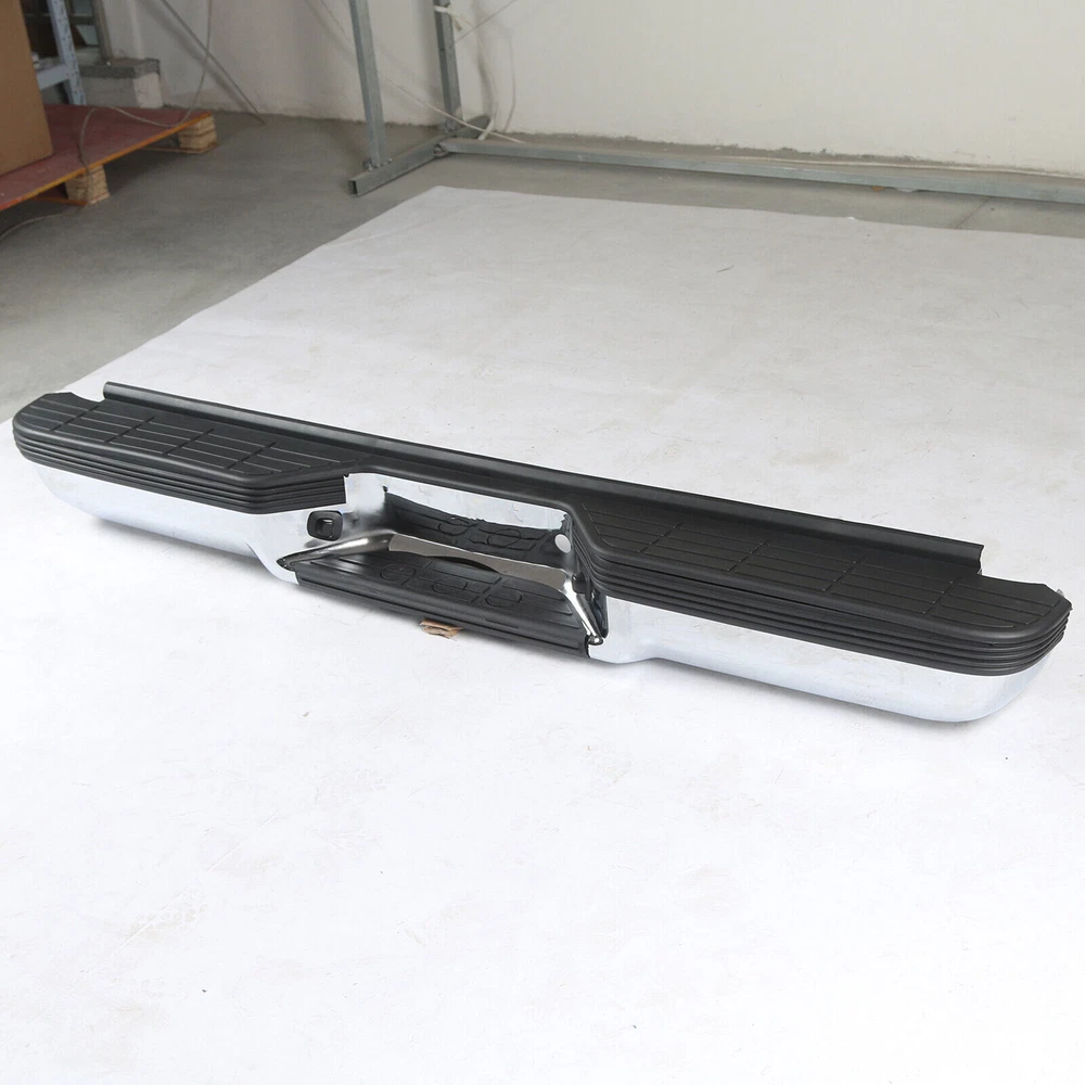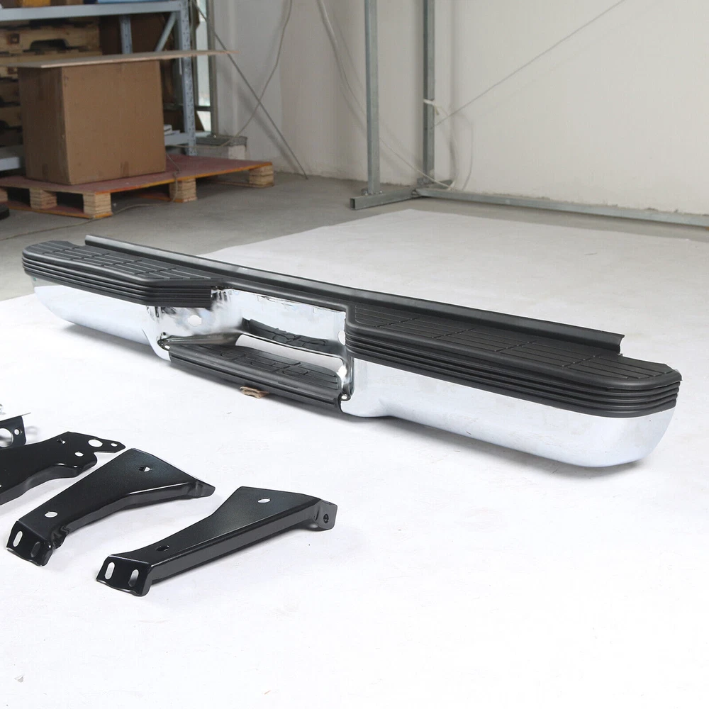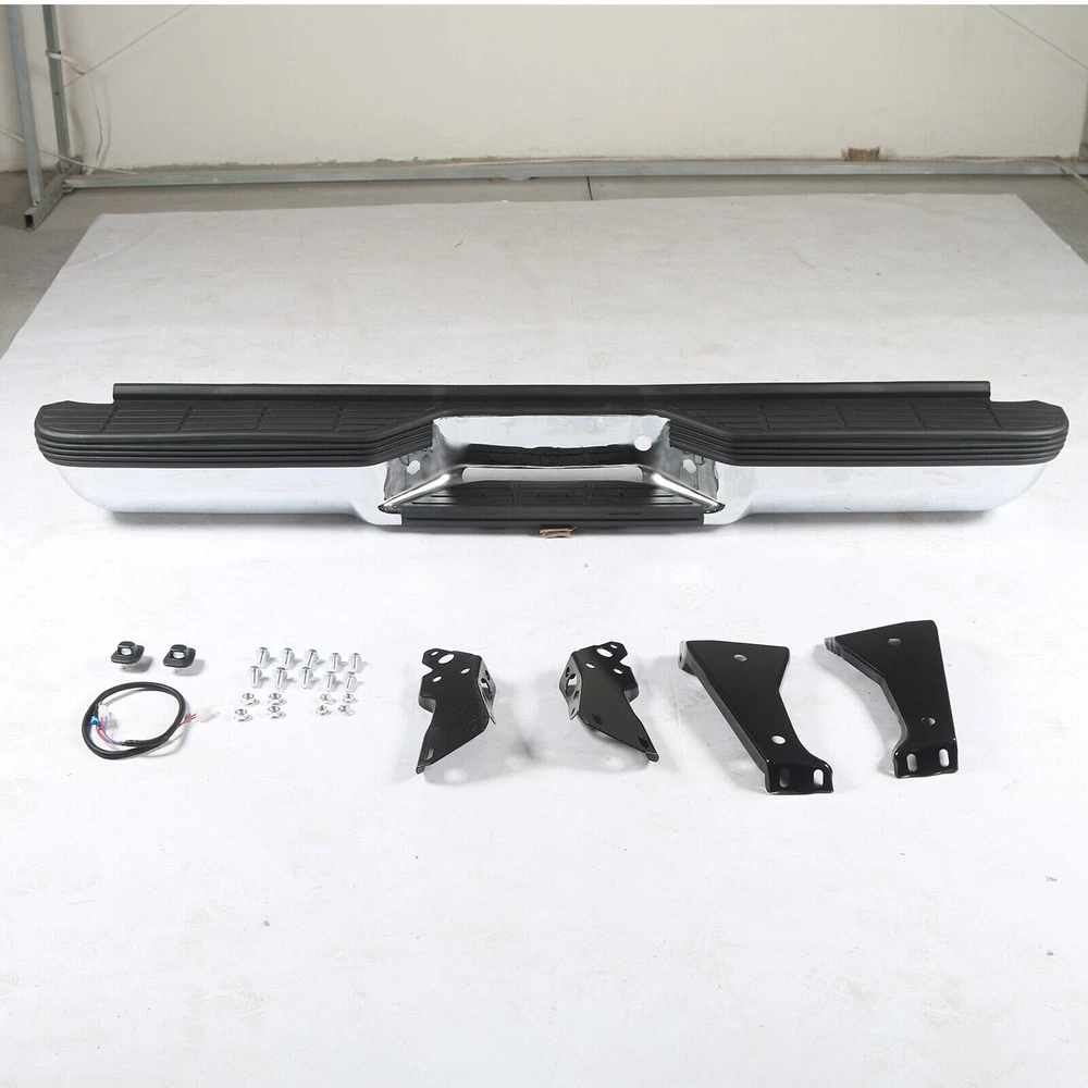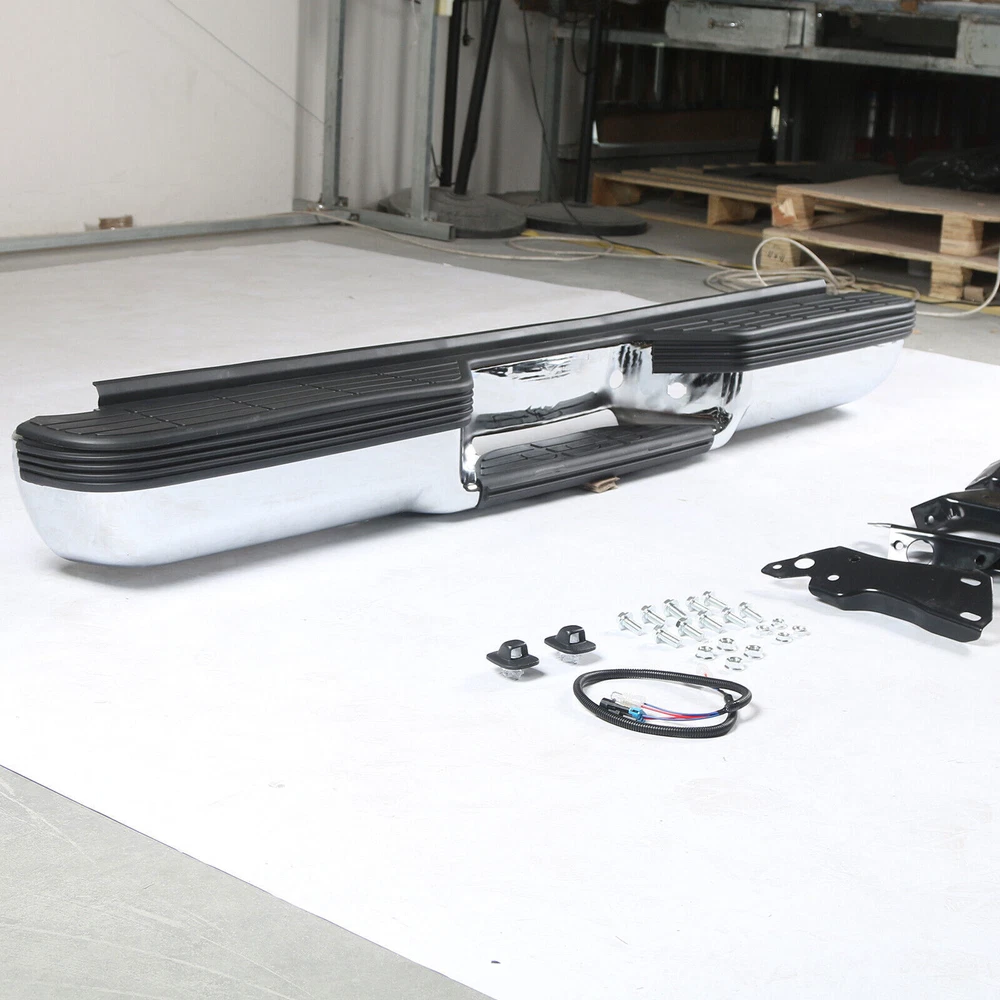 Chrome Back Bumpers, Rear Step Bumper fit for 1988-2000 for Chevy Silverado for GMC Sierra 1500 2500 without Parking Sensor Holes Product Description About this item COMPATIBLE WITH: The rear bumpers fit for 1988 1989 1990 1991 1992 1993 1994 1995 1996 1997 1998 1999 2000 for Chevy Silverado for GMC Sierra 1500 2500 HIGH QUALITY: The automotive bumpers is made of heavy duty thickened 5/32" steel plate for better strength and stiffness, effectively avoid the impact of external factors on the car. CHROME FINISH: The steel rear bumper has a chrome finish for good durability and aesthetics. The bumper coating will not peel off easily in a crash, providing long-lasting surface protection. SMOOTH APPEARANCE: The heavy steel bumper is highly fitted with the vehicle, and the graceful lines are integrated with the body, which makes your car look tougher. QUICK INSTALLATION: Comes with mounting hardware, bolts directly on to replace your original bumper, no additional drilling or cutting required. Fit for the following vehicles: 1988-2000 Chevy Silverado GMC Sierra C/K 1500 2500 Only Fleetside Product Description: Product : Rear Bumper Part Number: GM1101109 Material: Steel/Plastic Pads Color:Chrome & Black Placement on Vehicle:Rear Package included:1×Rear Bumper,1×Pair of License Plate Light,2×Brackets,1×Bag of Bolts Steel Black Rear Step Bumper Replacement for 1988-2000 for Chevy Silverado for GMC Sierra 1500 2500 Rear Bumper Comes without Parking Sensor Holes without Dual Exhaust Product Description About this item [Fit Following Vehicles] - The back bumper Fits for 1988 1989 1990 1991 1992 1993 1994 1995 1996 1997 1998 1999 2000 2001 2002 for Chevy Silverado for GMC Sierra 1500 2500 [Excellent Technology] - The rear bumper of the car has a polished chrome finish with our laser welding technology for good durability [Durable Material] - Rear Step Bumper plated is made of heavy-duty steel,which is can effectively avoid damage to the vehicle caused by collisions [Good Design] - The steel rear bumper is specially designed to fit your vehicle,fits the body,but also has a decorative effect,making your car look stylish and elegant [Easy Install] - Bolt directly on the original unit to install and replace the original unit,no drilling or modification required,if you have any questions,please contact us Payment Delivery Details Return Feedback Contact us Payment We accept payment by any of the following methods: Delivery Details Shipping Time Your item will ship within 3 days (Mon-Fri) of your cleared payment. Items will be shipped to the shipping address you specify via Paypal only. We are NOT able to change the shipping address once payment has been made. A tracking number will be provided once your item has shipped. Domestic Buyers No shipping to PO BOX and APO addresses. No shipping to PR, AK, HI. International Buyers International buyers please note: Import duties, taxes and charges are not included in the item price or shipping charges. These charges are the buyer's responsibility. Please check with your country's customs office to determine what these additional costs will be prior to bidding/buying. Return All returns must have RMA number. Returns with no RMA number will be avoided! 1. Changed your mind and don't want the item anymore? We back our products with a 30-DAY SATISFACTION GUARANTEE! (Item must be in the original condition as it was received. 30 Days Refund, 30 Day Replacement.). Brand New items will have 30 days warranty or replacement policy. 2. Restocking fees will be charged ONLY on Brand New items. 3. Defective/Dead items will be fully refunded or replaced after matching the serial number with the one in our records. 4. Mobile phones and tablets MUST be restored to factory setting. 5. If your order arrives incorrect or the package is damaged in result of a carrier company, you must notify us within 4 days of receipt. Defective items will be credited only after matching the serial number with the one in our records. We are aware of all fraud cases and have all the items details in our records. 6. If there is a quality issue or malfunction with the product, we strongly suggest you to contact the original manufacturer. 7. Any item needed to be returned must be securely packaged, insured and shipped with tracking for safety. We cannot be responsible for lost damaged packages. We carefully inspect returned items upon receipt before any possible refunds, credits, or exchanges. Feedback Customer satisfaction is our top priority. Please give us a chance to resolve any issues before posting a feedback. If you have any problem with your order, please contact us and we will do our best to make you satisfied. Contact us Business Hours: Monday - Friday : 9:30AM – 5:30PM Eastern Standard Time. Saturday, Sunday Closed. For any questions or concerns, please feel free to contact us!