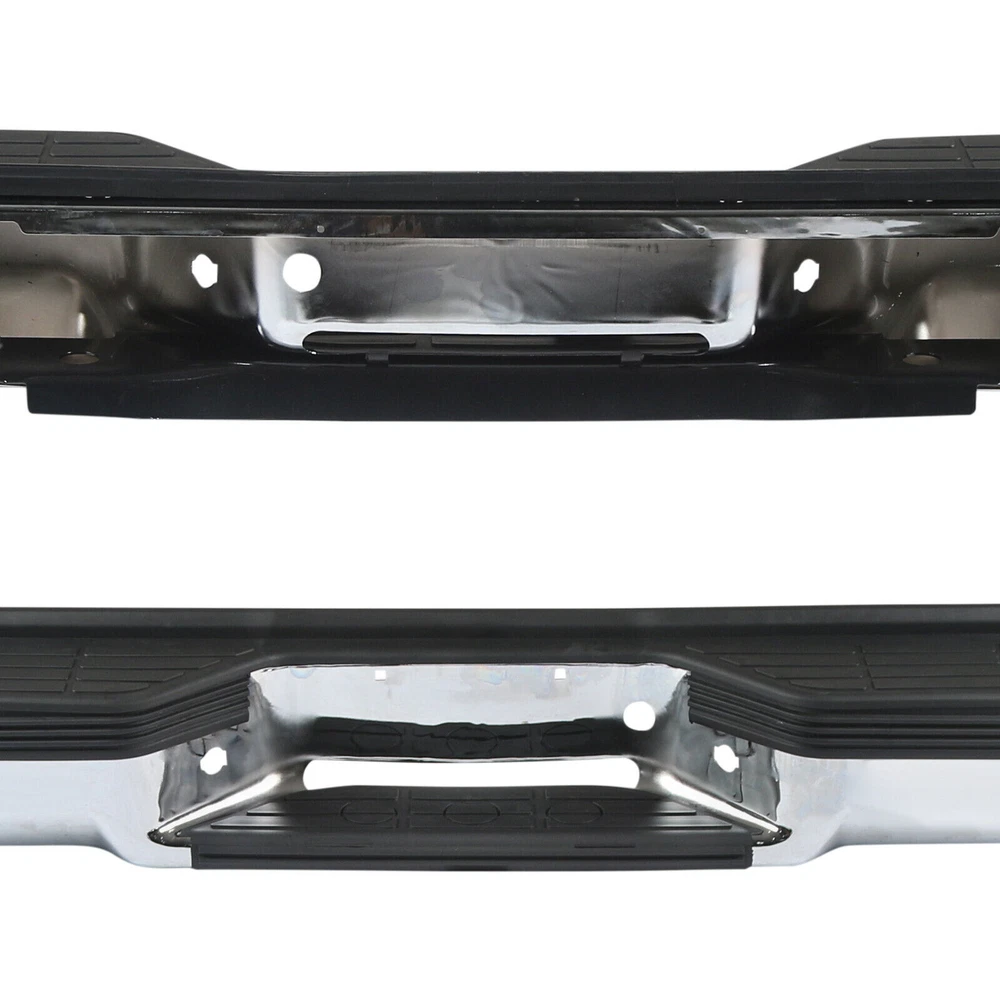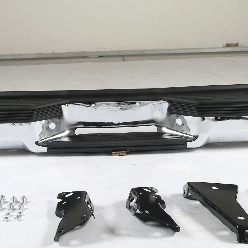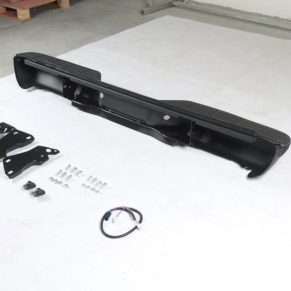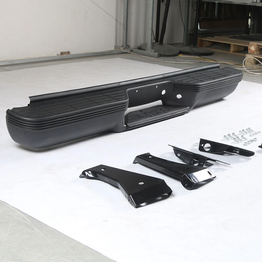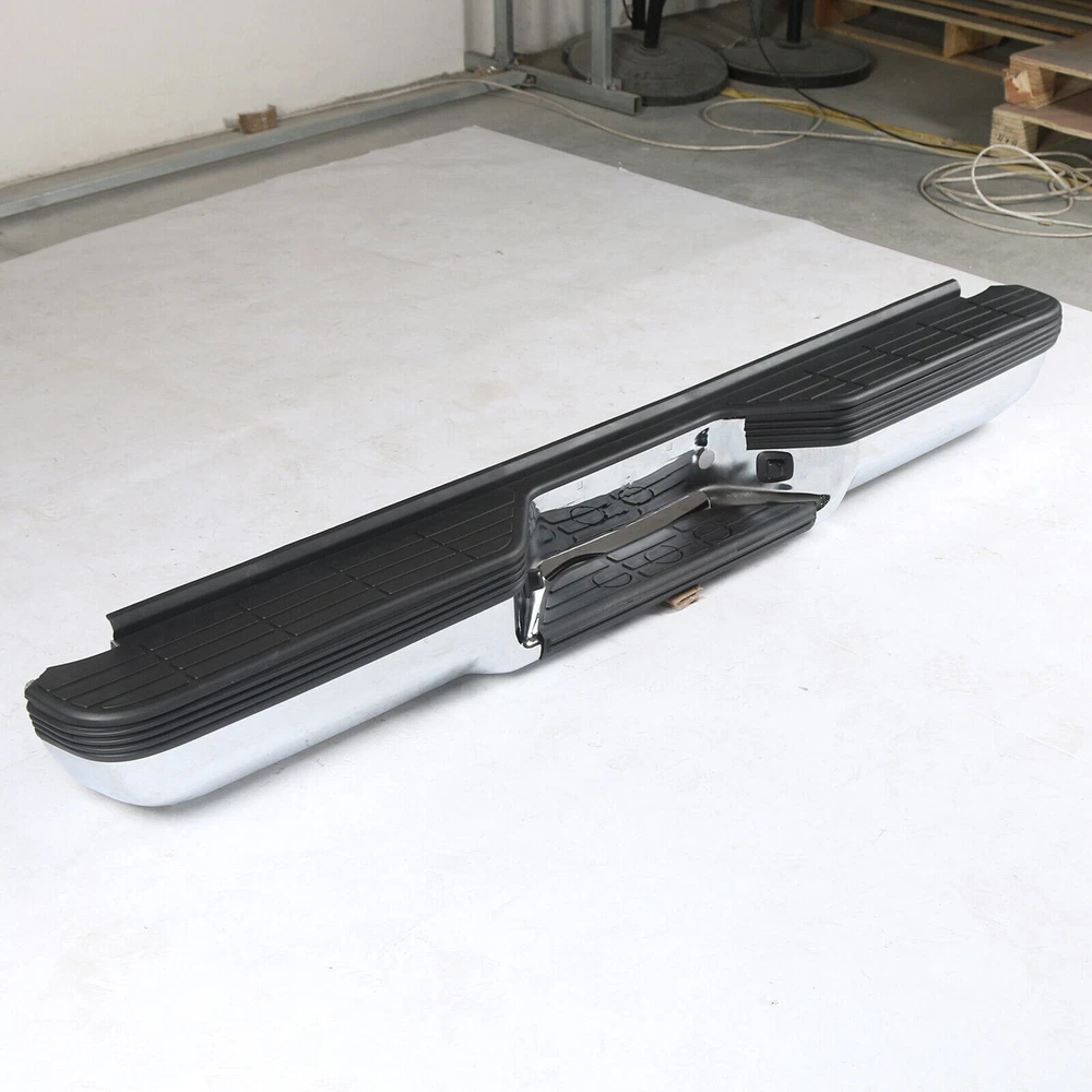 Chrome Back Bumpers, Rear Step Bumper fit for 1988-2000 for Chevy Silverado for GMC Sierra 1500 2500 without Parking Sensor Holes Product Description About this item COMPATIBLE WITH: The rear bumpers fit for 1988 1989 1990 1991 1992 1993 1994 1995 1996 1997 1998 1999 2000 for Chevy Silverado for GMC Sierra 1500 2500 HIGH QUALITY: The automotive bumpers is made of heavy duty thickened 5/32" steel plate for better strength and stiffness, effectively avoid the impact of external factors on the car. CHROME FINISH: The steel rear bumper has a chrome finish for good durability and aesthetics. The bumper coating will not peel off easily in a crash, providing long-lasting surface protection. SMOOTH APPEARANCE: The heavy steel bumper is highly fitted with the vehicle, and the graceful lines are integrated with the body, which makes your car look tougher. QUICK INSTALLATION: Comes with mounting hardware, bolts directly on to replace your original bumper, no additional drilling or cutting required. Fit for the following vehicles: 1988-2000 Chevy Silverado GMC Sierra C/K 1500 2500 Only Fleetside Product Description: Product : Rear Bumper Part Number: GM1101109 Material: Steel/Plastic Pads Color:Chrome & Black Placement on Vehicle:Rear Package included:1×Rear Bumper,1×Pair of License Plate Light,2×Brackets,1×Bag of Bolts Steel Black Rear Step Bumper Replacement for 1988-2000 for Chevy Silverado for GMC Sierra 1500 2500 Rear Bumper Comes without Parking Sensor Holes without Dual Exhaust Product Description About this item [Fit Following Vehicles] - The back bumper Fits for 1988 1989 1990 1991 1992 1993 1994 1995 1996 1997 1998 1999 2000 2001 2002 for Chevy Silverado for GMC Sierra 1500 2500 [Excellent Technology] - The rear bumper of the car has a polished chrome finish with our laser welding technology for good durability [Durable Material] - Rear Step Bumper plated is made of heavy-duty steel,which is can effectively avoid damage to the vehicle caused by collisions [Good Design] - The steel rear bumper is specially designed to fit your vehicle,fits the body,but also has a decorative effect,making your car look stylish and elegant [Easy Install] - Bolt directly on the original unit to install and replace the original unit,no drilling or modification required,if you have any questions,please contact us Payment Delivery Details Return Feedback Contact us Payment We accept payment by any of the following methods: Delivery Details Shipping Time Your item will ship within 3 days (Mon-Fri) of your cleared payment. Items will be shipped to the shipping address you specify via Paypal only. We are NOT able to change the shipping address once payment has been made. A tracking number will be provided once your item has shipped. Domestic Buyers No shipping to PO BOX and APO addresses. No shipping to PR, AK, HI. International Buyers International buyers please note: Import duties, taxes and charges are not included in the item price or shipping charges. These charges are the buyer's responsibility. Please check with your country's customs office to determine what these additional costs will be prior to bidding/buying. Return All returns must have RMA number. Returns with no RMA number will be avoided! 1. Changed your mind and don't want the item anymore? We back our products with a 30-DAY SATISFACTION GUARANTEE! (Item must be in the original condition as it was received. 30 Days Refund, 30 Day Replacement.). Brand New items will have 30 days warranty or replacement policy. 2. Restocking fees will be charged ONLY on Brand New items. 3. Defective/Dead items will be fully refunded or replaced after matching the serial number with the one in our records. 4. Mobile phones and tablets MUST be restored to factory setting. 5. If your order arrives incorrect or the package is damaged in result of a carrier company, you must notify us within 4 days of receipt. Defective items will be credited only after matching the serial number with the one in our records. We are aware of all fraud cases and have all the items details in our records. 6. If there is a quality issue or malfunction with the product, we strongly suggest you to contact the original manufacturer. 7. Any item needed to be returned must be securely packaged, insured and shipped with tracking for safety. We cannot be responsible for lost damaged packages. We carefully inspect returned items upon receipt before any possible refunds, credits, or exchanges. Feedback Customer satisfaction is our top priority. Please give us a chance to resolve any issues before posting a feedback. If you have any problem with your order, please contact us and we will do our best to make you satisfied. Contact us Business Hours: Monday - Friday : 9:30AM – 5:30PM Eastern Standard Time. Saturday, Sunday Closed. For any questions or concerns, please feel free to contact us!
