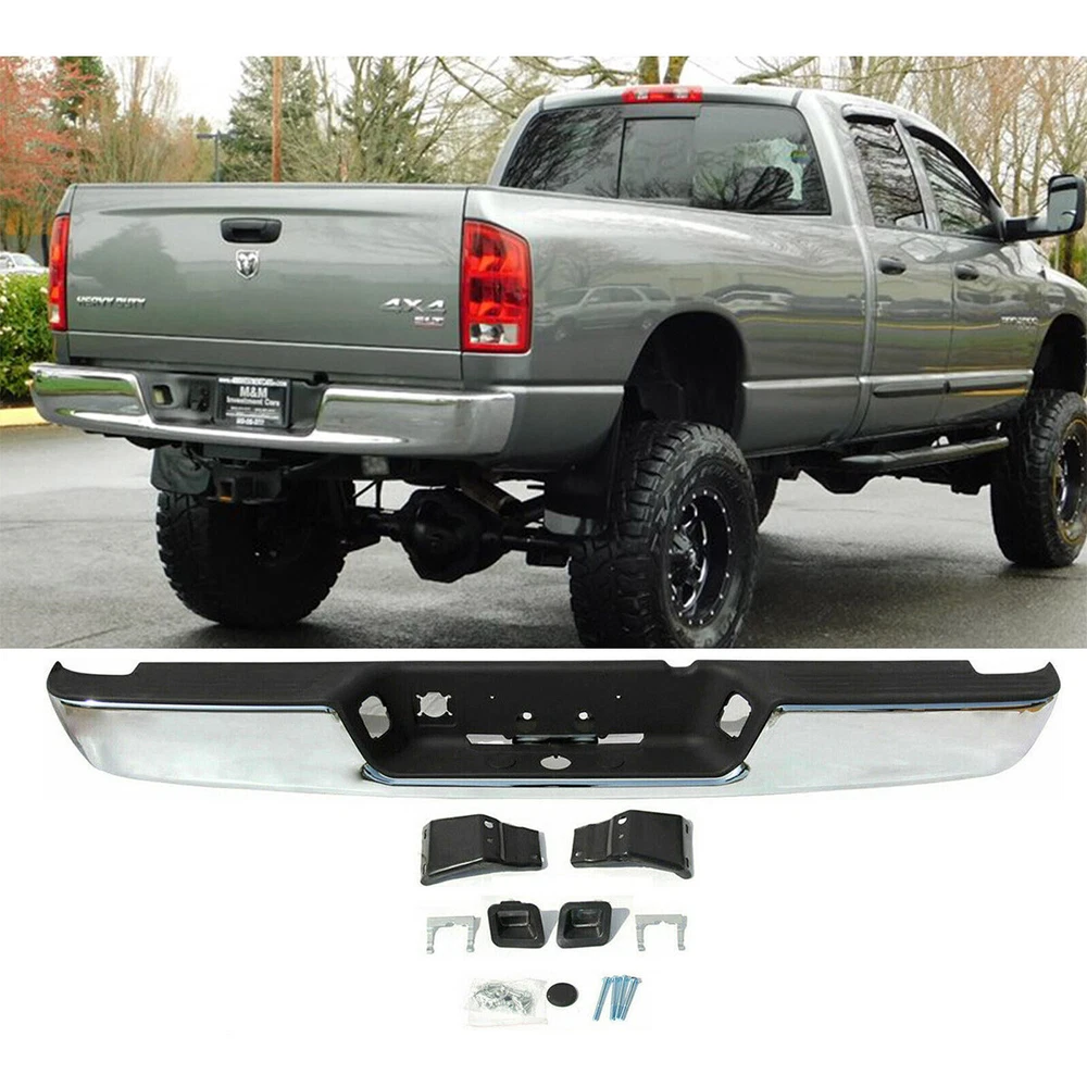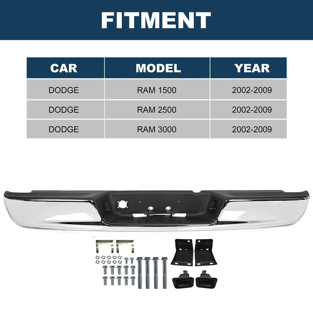 ONE YEAR WARRANTY Fitment: Fit For Dodge Ram 1500 2002-2008 Fit For Dodge Ram 2500 2003-2009 Fit For Dodge Ram 3500 2003-2009 Note: Fit For Models WITHOUT Rear Park Assist ONLY Specifications: Condition :100% New And Quality Guaranteed Material : Steel & Plastic Color : Chrome Placement on Vehicle : Rear Fitment Type : Direct Replacement Parking Aid Sensor Holes : WITHOUT Parking Aid Sensor Holes Feature: 1. Carry out 1:1 development according to the original vehicle data, and accurately match the installation holes 2. Highly fit, perfect in workmanship 3. One-time forming of stainless steel electroplating stamping 4. Anti-rust and anti-corrosion process 5. Upgrade your vehicle with a refreshing look