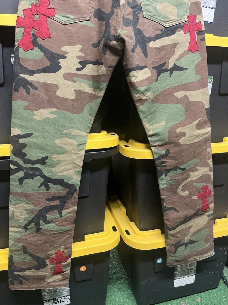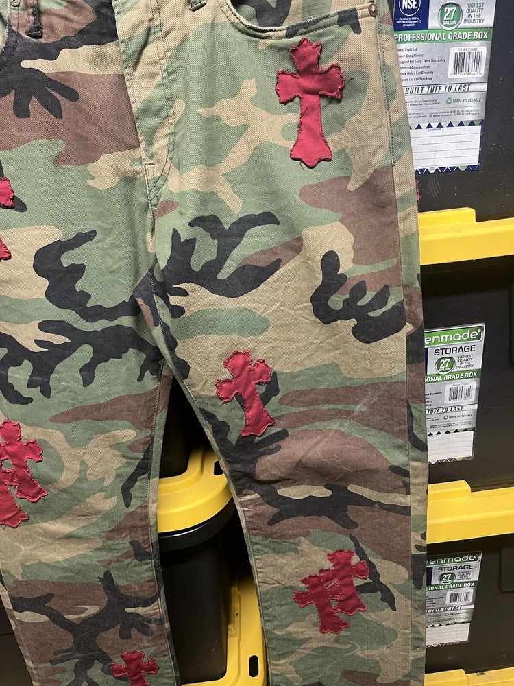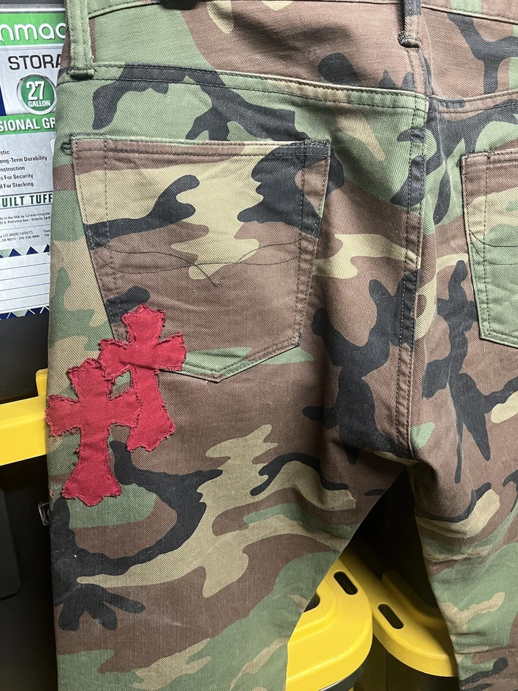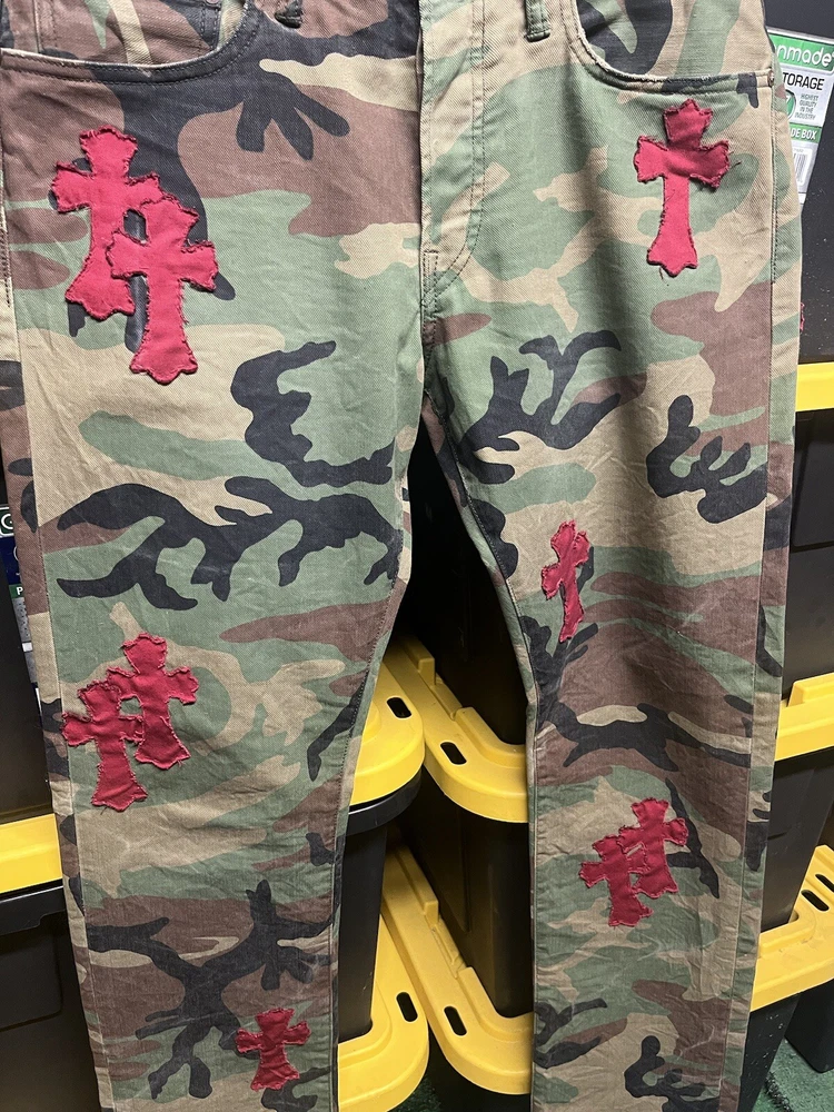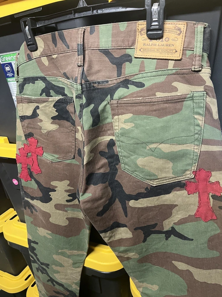 Elevate your denim collection with these custom, hand-stitched jeans, inspired by the iconic Chrome Hearts aesthetic. Crafted with care from premium cotton denim, these jeans feature a multicolor camouflage pattern that adds a bold touch to your everyday look. The classic straight-leg cut and 5-pocket design provide a comfortable fit, while the subtle logo accents offer a signature finish. Polo Ralph Lauren jeans in size 32x32 offer a regular fit for the modern man. With a machine-washable garment care, these jeans are as practical as they are stylish. The button closure ensures a secure and flattering fit around the waist, making them a versatile addition to your wardrobe.