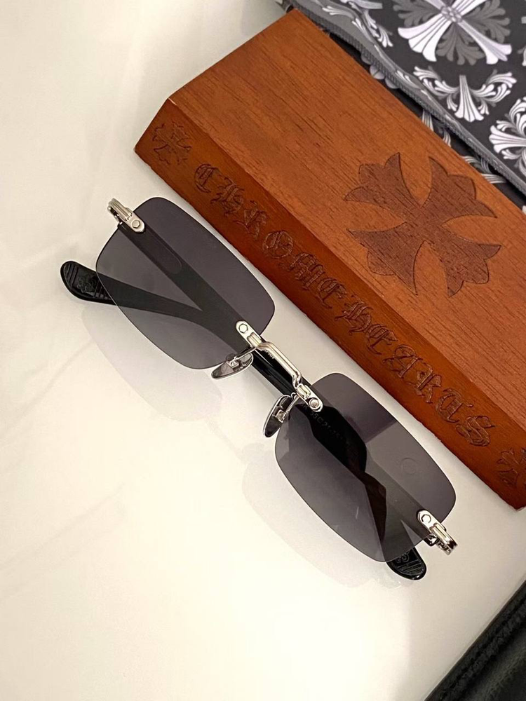 The Chrome Hearts DEEP II Sunglasses in Black with a Silver Rimless Square design exude luxury street style. Made for men, these sunglasses feature glass lenses for added durability and protection against the sun. The sleek silver frame adds a touch of sophistication to any outfit, making them a stylish accessory for everyday wear. The iconic Chrome Hearts brand ensures high quality and a trendy design that is sure to make a statement.