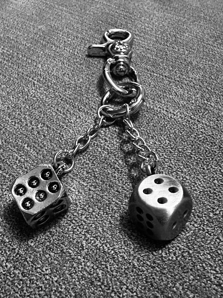 Chrome Hearts STYLE Clip & Dice Key Chain Lobster clip with 2 dice on link chain Can be used a keychain or luggage clip Stainless steel construction Measures around 6” in length