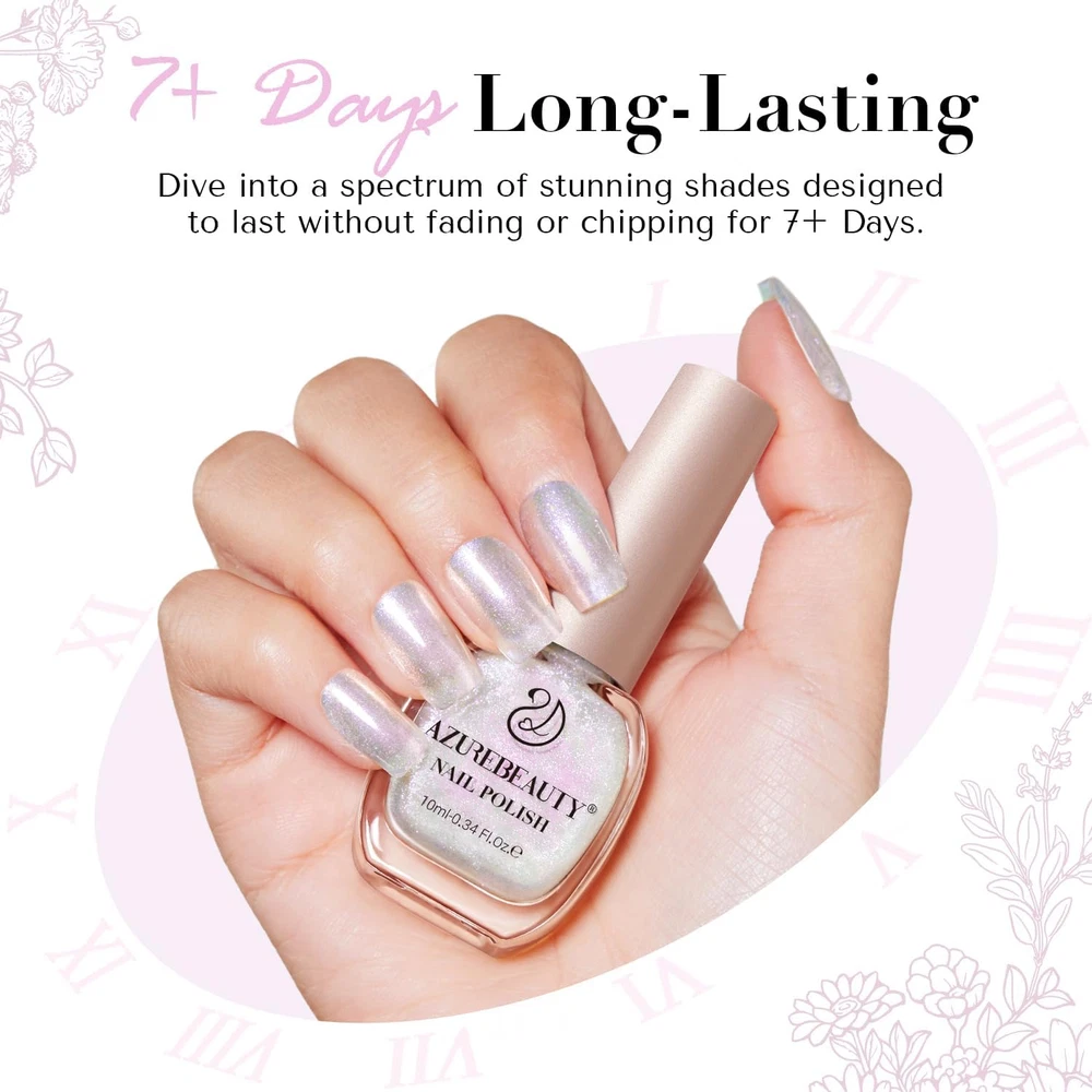 Chrome Quick Dry Nail Polish Shine Pearl, Natural Lustrous Enamel, Chrome Finish Product Details Pearl White Chrome Finish for Versatile DIY Nail Art:Enjoy salon-quality nail art at home with AZUREBEAUTY 10ml (0.34 fl oz) pearl white nail polish. Its unique chrome-infused pearl shimmer adds a luminous, multidimensional finish—perfect for DIY manicures/pedicures. Compatible with any base color, it lets you create custom looks from the comfort of your home, whether you’re a beginner or a nail art enthusiast Layer & Transform: Create Unlimited Custom Colors,This versatile glitter pearl white polish is designed for layering: apply over basic shades (like pink, nude, or black) to instantly transform them into shimmering, one-of-a-kind hues. A single layer over pink becomes "shimmering rose"; over black, it turns into "mystic midnight chrome." Switch styles effortlessly for daily wear, parties, or special occasions Long-Lasting & Perfect Shine:Upgraded nail polish adds firmer manicure to strengthener nail.If properly buffed your nail bed last around 7 Days without crumbling,fading,or yellows.This nail polish is highly pigmented,no need to brush repeatedly color and makes your nails look like pearls Easy to use & Quick dry :The Nail Polish doesn't require UV,quick dry nail polish in 90 seconds,complete coloring within 3 minutes.Our natural nail lacquer extract high purity color paste,coloring strength,high coverage and smooth colloid,easy to use,brush cotton candy nail polish coloring,no need to repeatedly brush can make nail surface color Low-Odor, Nail-Friendly Formula:Gentler on nails than traditional polishes, our upgraded formula features lower odor and added nutrients like Vitamin E. Free from harsh irritants or damaging adhesives, it protects nail health while delivering stunning color—perfect for those who prioritize both beauty and nail care Product description More Choices for You Add to Cart Add to Cart Add to Cart Add to Cart Add to Cart Customer Reviews 4.0 out of 5 stars 9,415 4.3 out of 5 stars 889 4.5 out of 5 stars 114 4.0 out of 5 stars 9,415 4.0 out of 5 stars 3,091 4.2 out of 5 stars 38 4.2 out of 5 stars 818 Price $5.94 $ 5 . 94 $5.94 $ 5 . 94 $6.99 $ 6 . 99 $4.99 $ 4 . 99 — — $8.99 $ 8 . 99 Superior Quality ✔ ✔ ✔ ✔ ✔ ✔ ✔ Nail-Friendly ✔ ✔ ✔ ✔ ✔ ✔ ✔ Easy Application ✔ ✔ ✔ ✔ ✔ ✔ ✔ Long Lasting ✔ ✔ ✔ ✔ ✔ ✔ ✔ High Saturation ✔ ✔ ✔ ✔ ✔ ✔ ✔ Liquid Volume 0.34 Fluid Ounces Special Feature Quick Dry Color A Pearl Sparkle Type builder Model Name White Nail Polish Material Type Free Fragrance Free Included Components Nail Polish Item Form nail polish Package Dimensions 4.06 x 1.38 x 0.83 inches; 1.76 ounces Finish Type Glossy 1.38 inches x 4.06 inches x 0.83 inches. Weight: 1.76 oz Payment Details We accept all payments via Ebay using Credit Cards , PAYPAL , Apple Pay and many others Shipping Details We are always working hard to ensure your package arrives as soon as possible. Please understand that some factors like weather, high postal traffic, and the performance of shipping companies are outside of our control. Delivery & Return Policy Details We offer a 30-Day Return Policy on items in which you are not completely satisfied with. You have the option of a full-refund or an exchange of the item. No returns are available on items shipped outside of the USA.