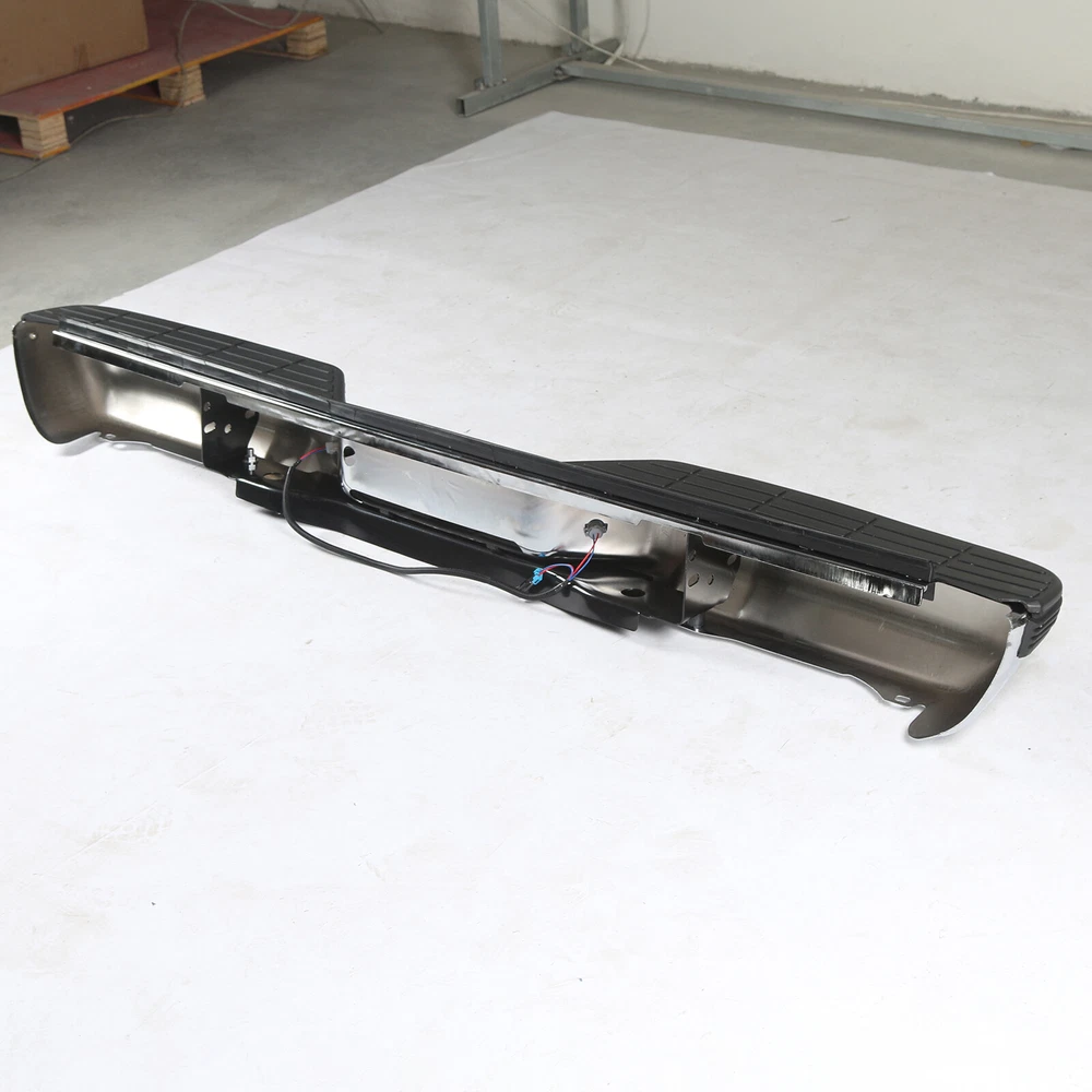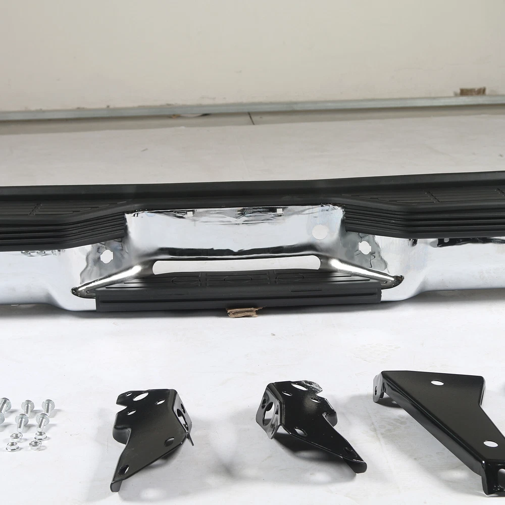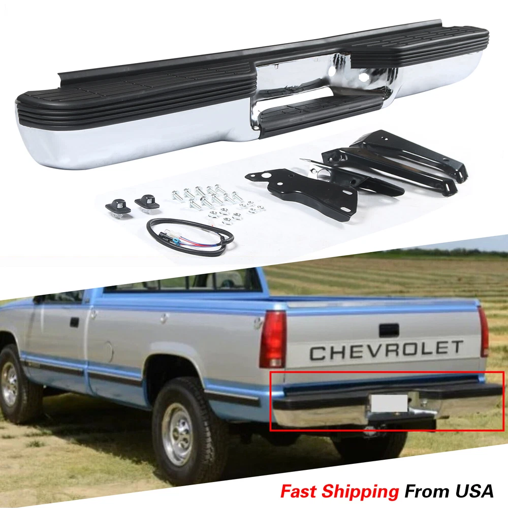 FITMENT Chevrolet 1988-1998 C1500 1988-1998 K1500 GMC 1988-1999 C1500 1988-1999 K1500 SPECIFICATION Color:Chrome & Black Finish:Polished Chrome Placement on Vehicle:Rear INCLUDE Step Bumper Black Pad(s), Bolt Kit License Plate Lights Bracket(s),