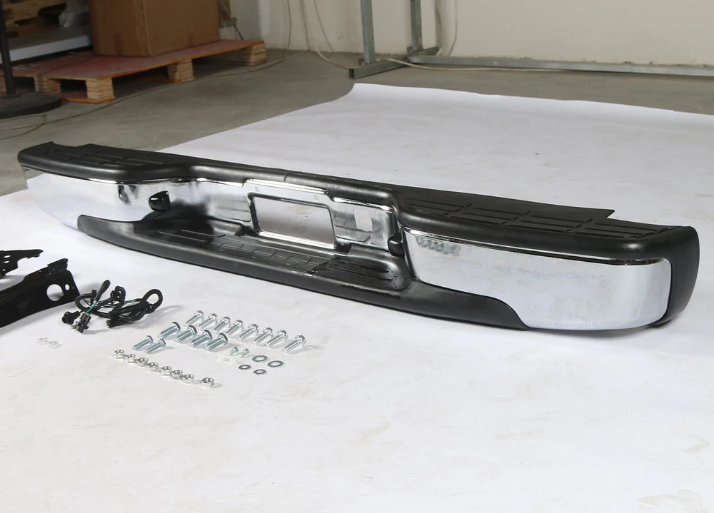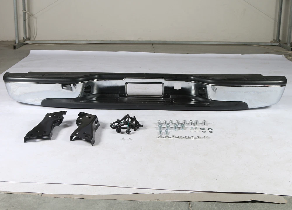 Feature Condition: 100% Brand New Color: Chrome Bumper + Black Step Pad Material: Steel + ABS Plastic Placement on Vehicle: Rear Comes with a Complete Set of Step Pads Requires no Modification or Drilling Upgrade and replace your standard or worn rear bumper with a new one. Professional Installation is Highly Recommended Installation Instruction is NOT Included Fits For 1999-2006 Chevrolet Silverado 1500 For 2007 Chevrolet Silverado 1500 Classic For 1999-2004 Chevrolet Silverado 2500 For 1999-2006 GMC Sierra 1500 For 2007 GMC Sierra 1500 Classic For 1999-2004 GMC Sierra 2500 Fits Models without Parking Sensor Holes Package Include 1×Rear Bumper 1 Set of License Plate Lamp Wiring Harness 2×License Plate Lamps Some bolts and screws On Feb 11, 2025 at 00:50:49 PST, seller added the following information: On Feb 11, 2025 at 11:23:43 PST, seller added the following information: